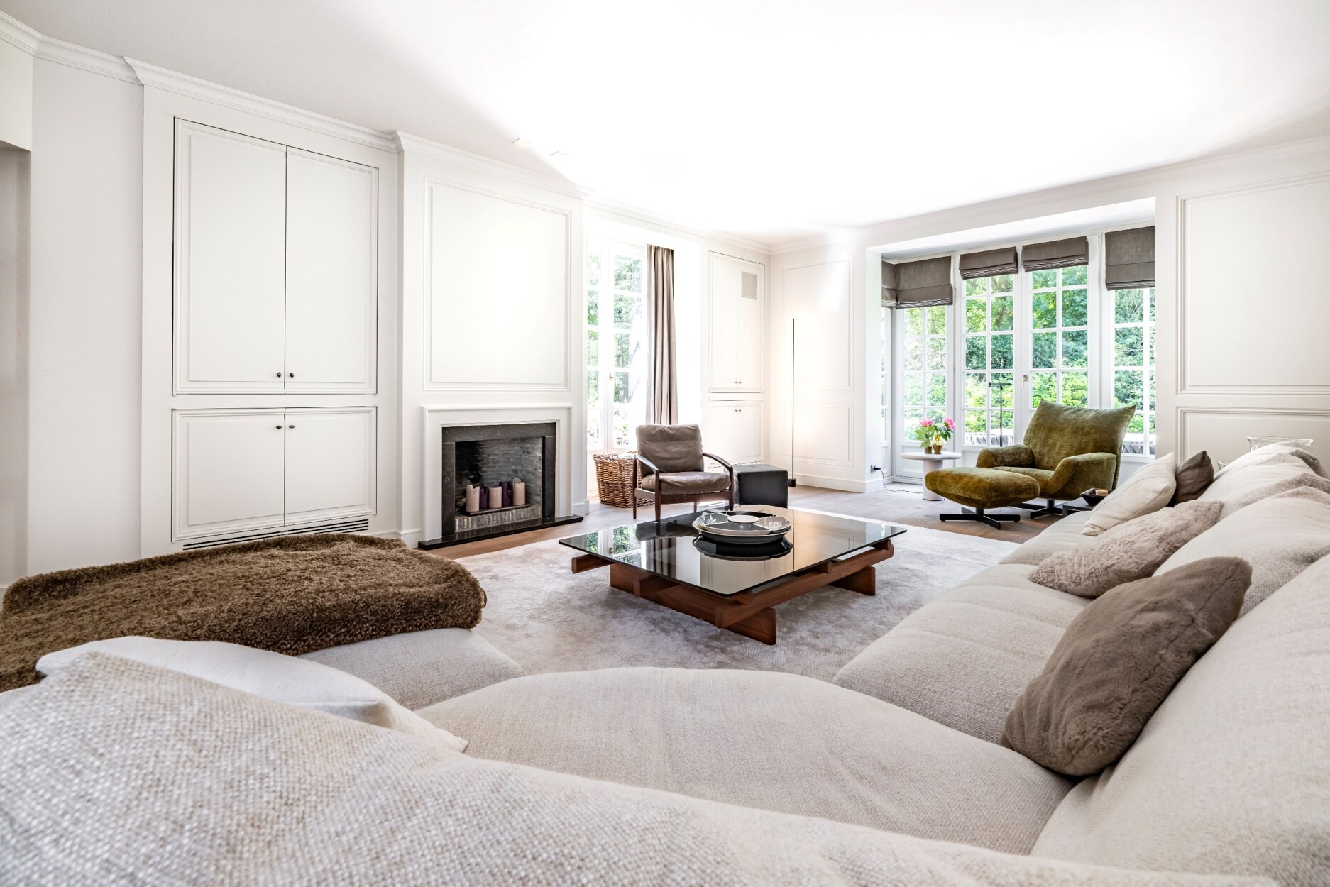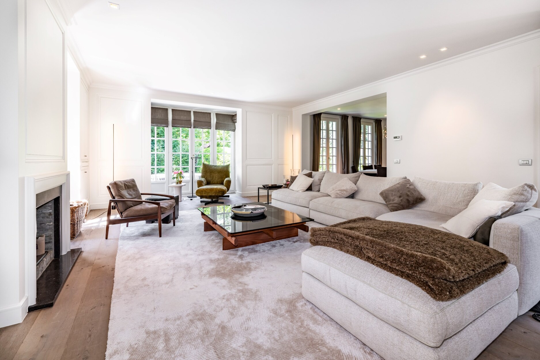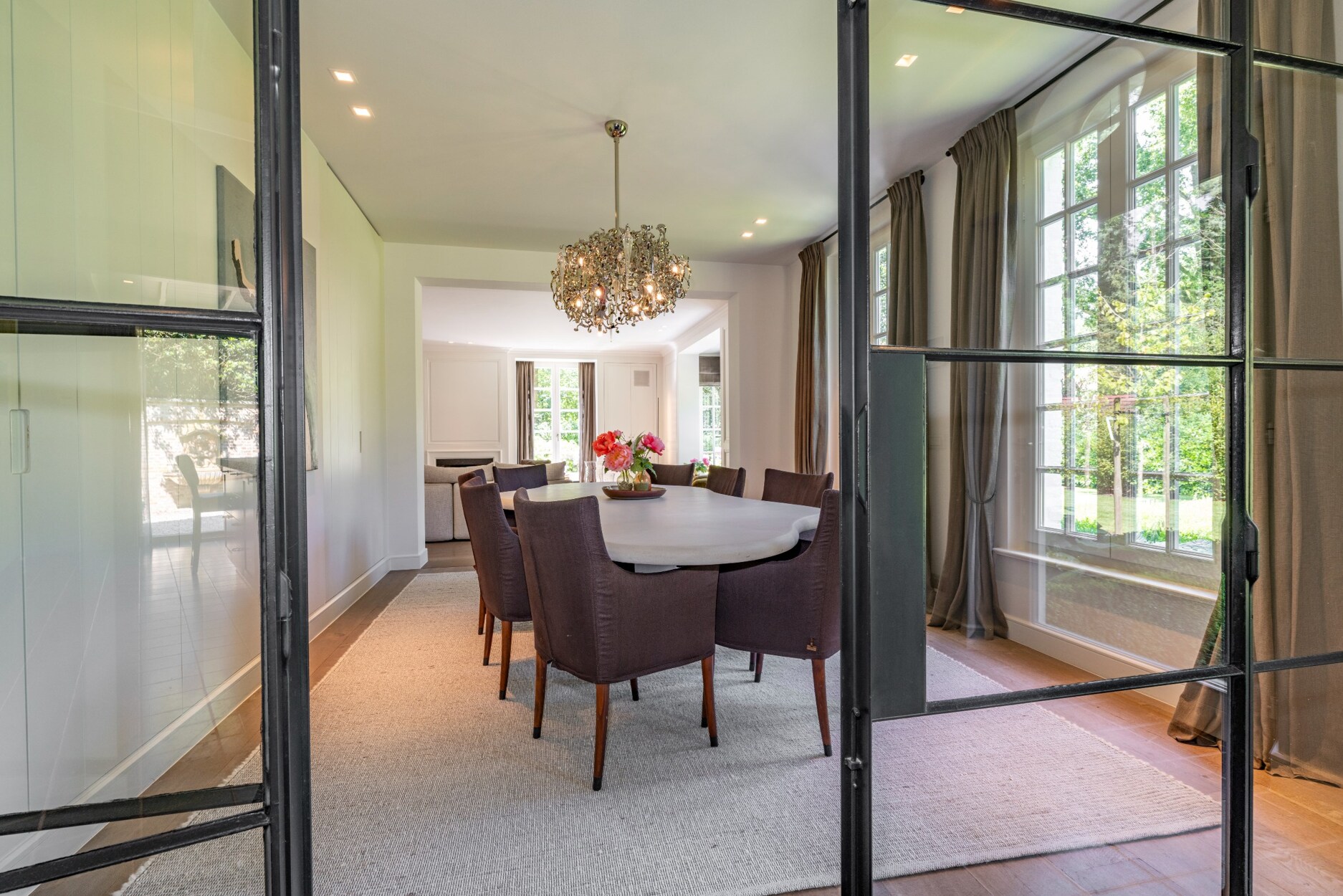 Via de riante inkomhal met vestiaire en toilet, komen we tot de mooie woonkamer met open haard en aansluitend nog een aparte ruime zithoek met een tweede open haard. Naast de eetkamer treffen we de ruime leefkeuken met oa. een eiland voorzien van een eethoek. De keuken is uitgerust met een ijskast, Zug combi stoomoven, Lacanche fornuis, vaatwasser.