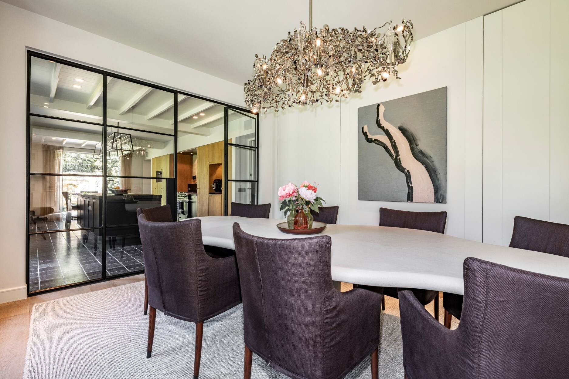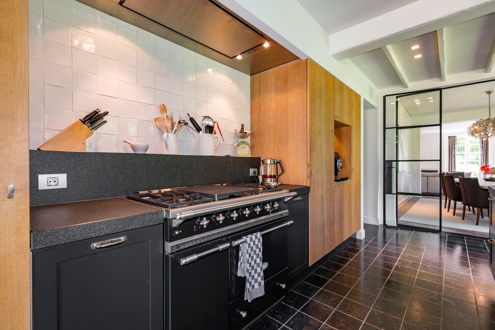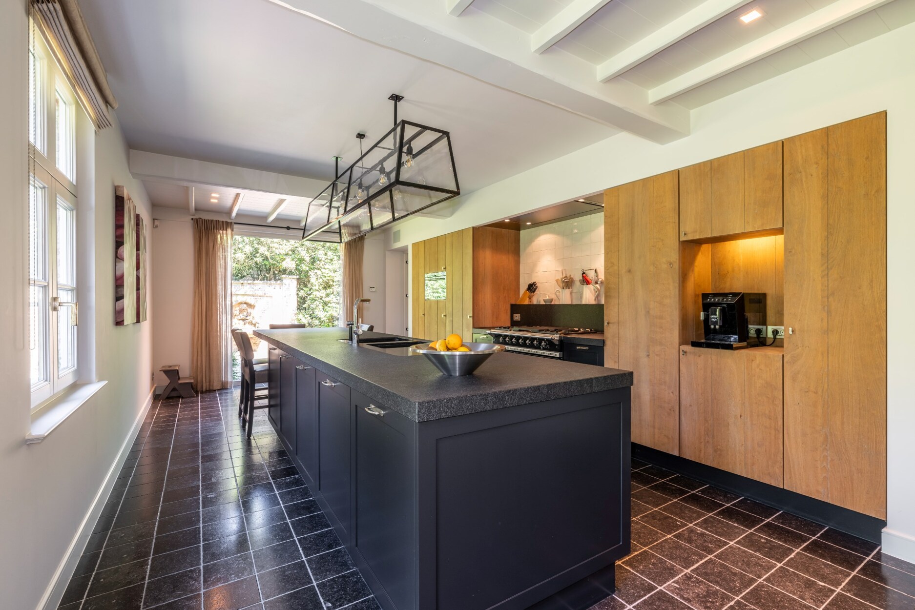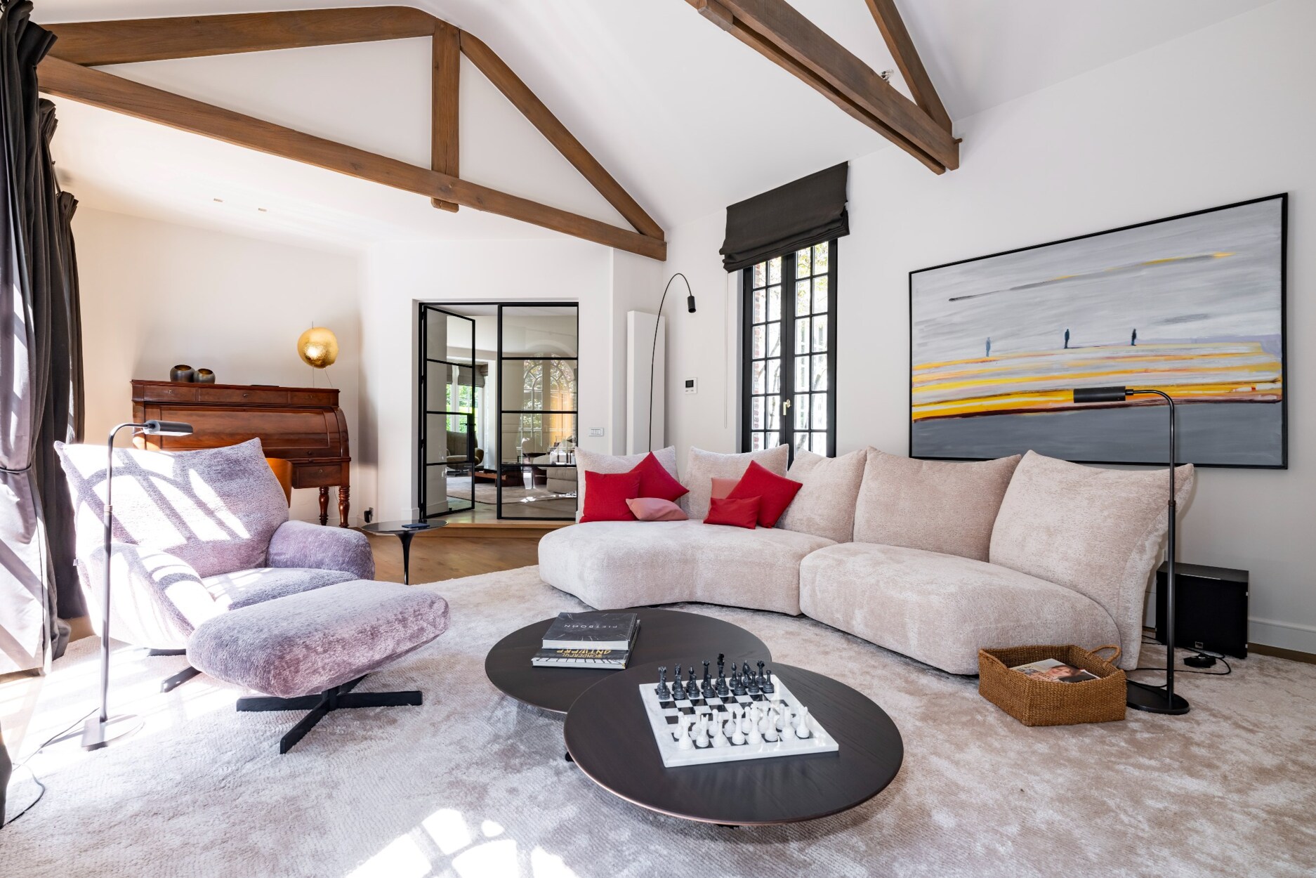 Via de riante inkomhal met vestiaire en toilet, komen we tot de mooie woonkamer met open haard en aansluitend nog een aparte ruime zithoek met een tweede open haard. Naast de eetkamer treffen we de ruime leefkeuken met oa. een eiland voorzien van een eethoek. De keuken is uitgerust met een ijskast, Zug combi stoomoven, Lacanche fornuis, vaatwasser.