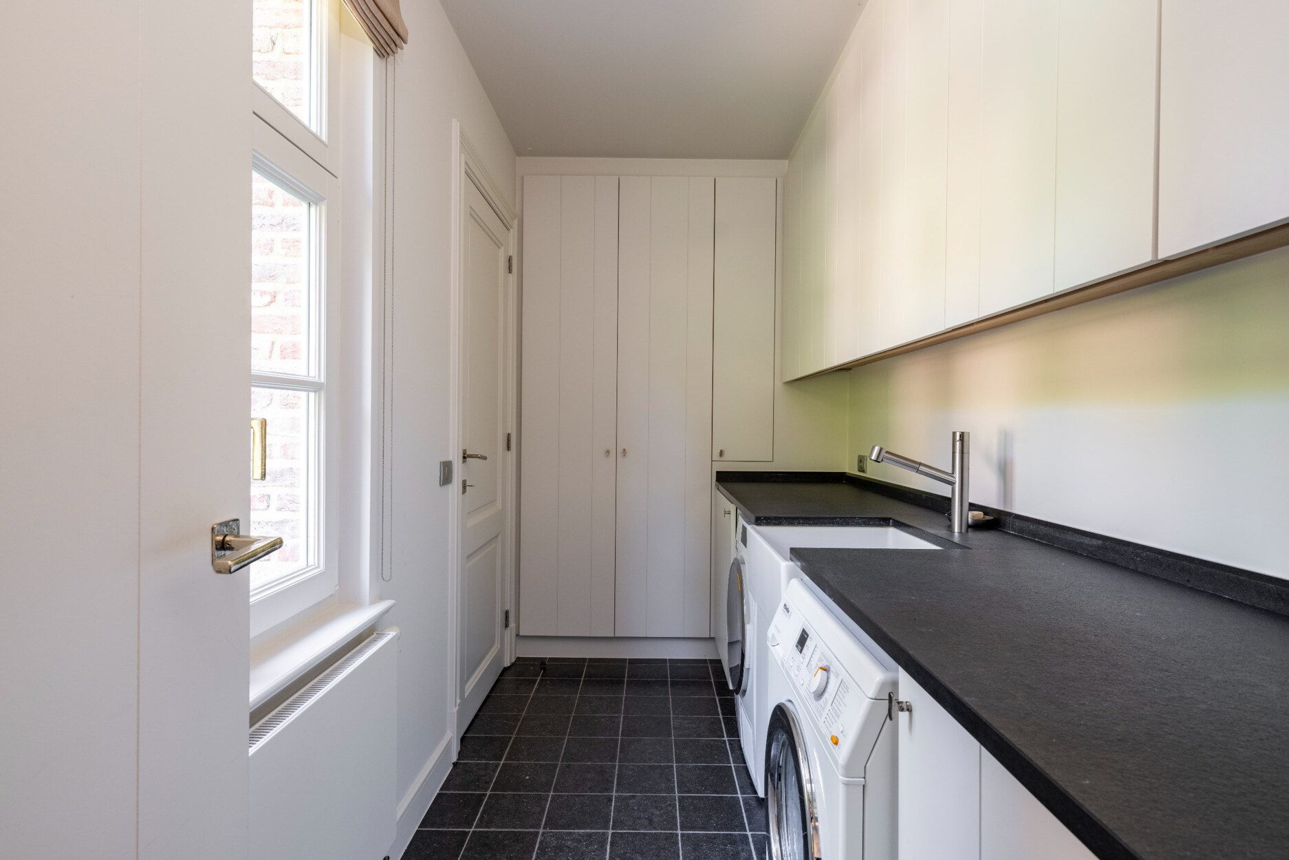 Verder komen we tot de wasplaats met toegang tot de dubbele garage voorzien van een ruime bergzolder. Aan deze garage werd een aparte technische ruimte voorzien. De verwarmingsketel werd recent vernieuwd.