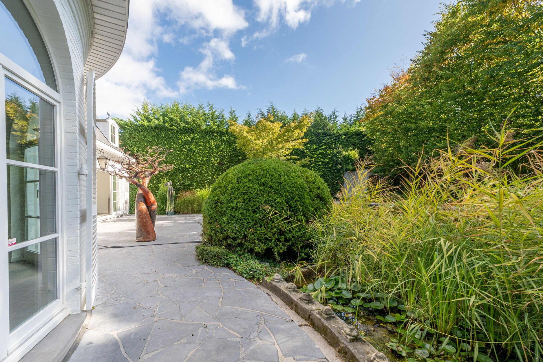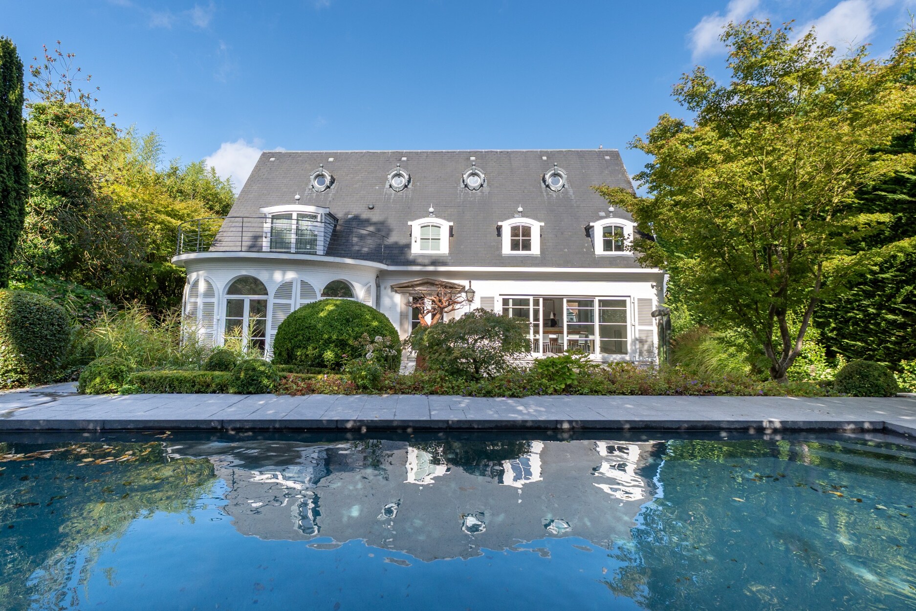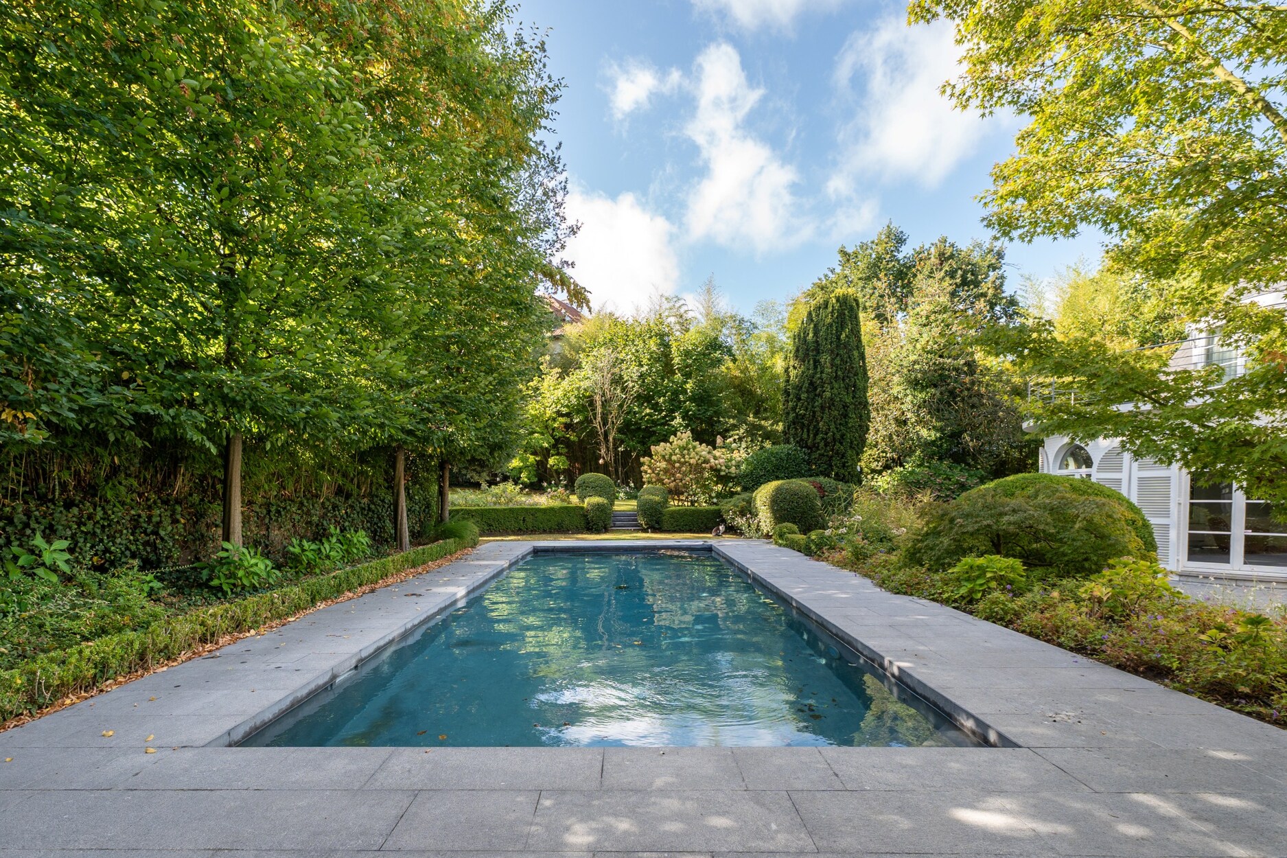 De tuin herbergt een verwarmd zwembad en diverse ontspanningszones.