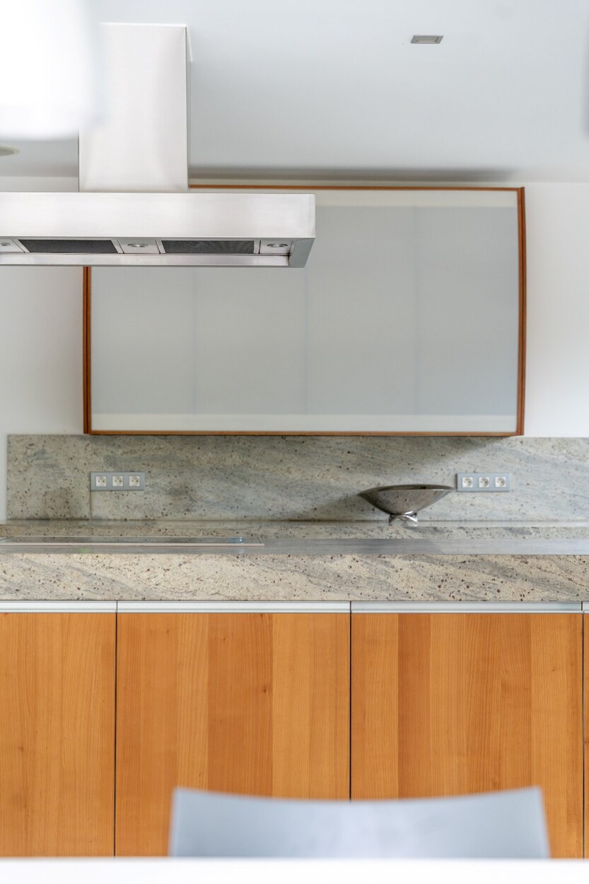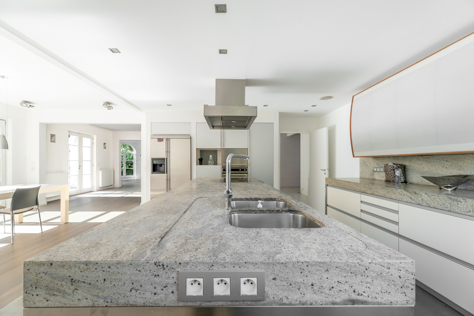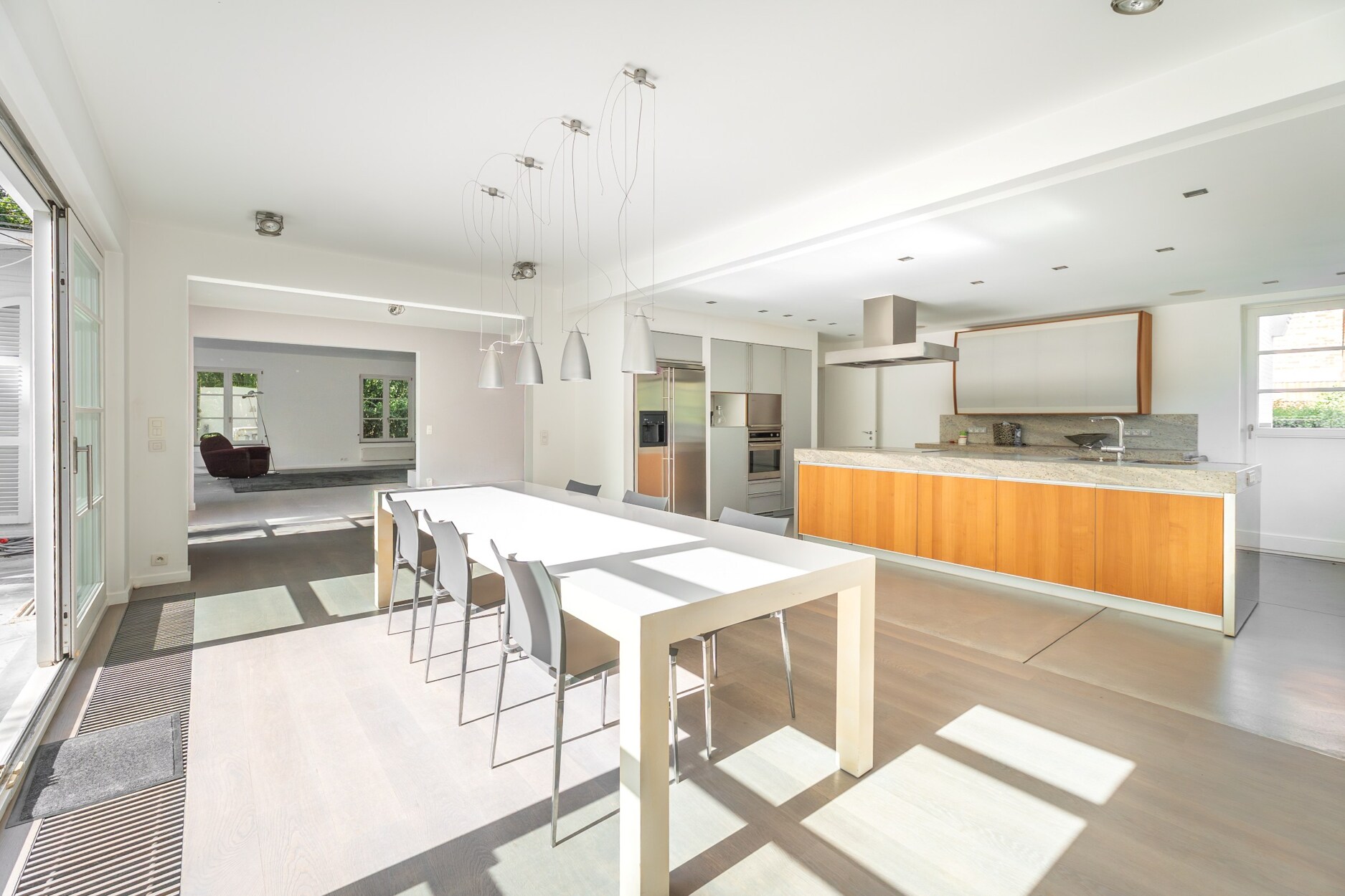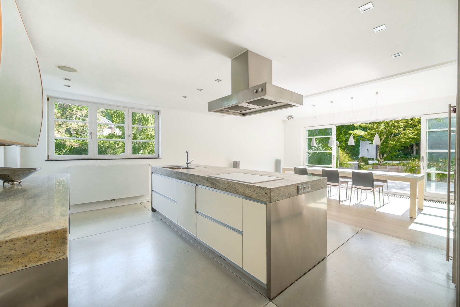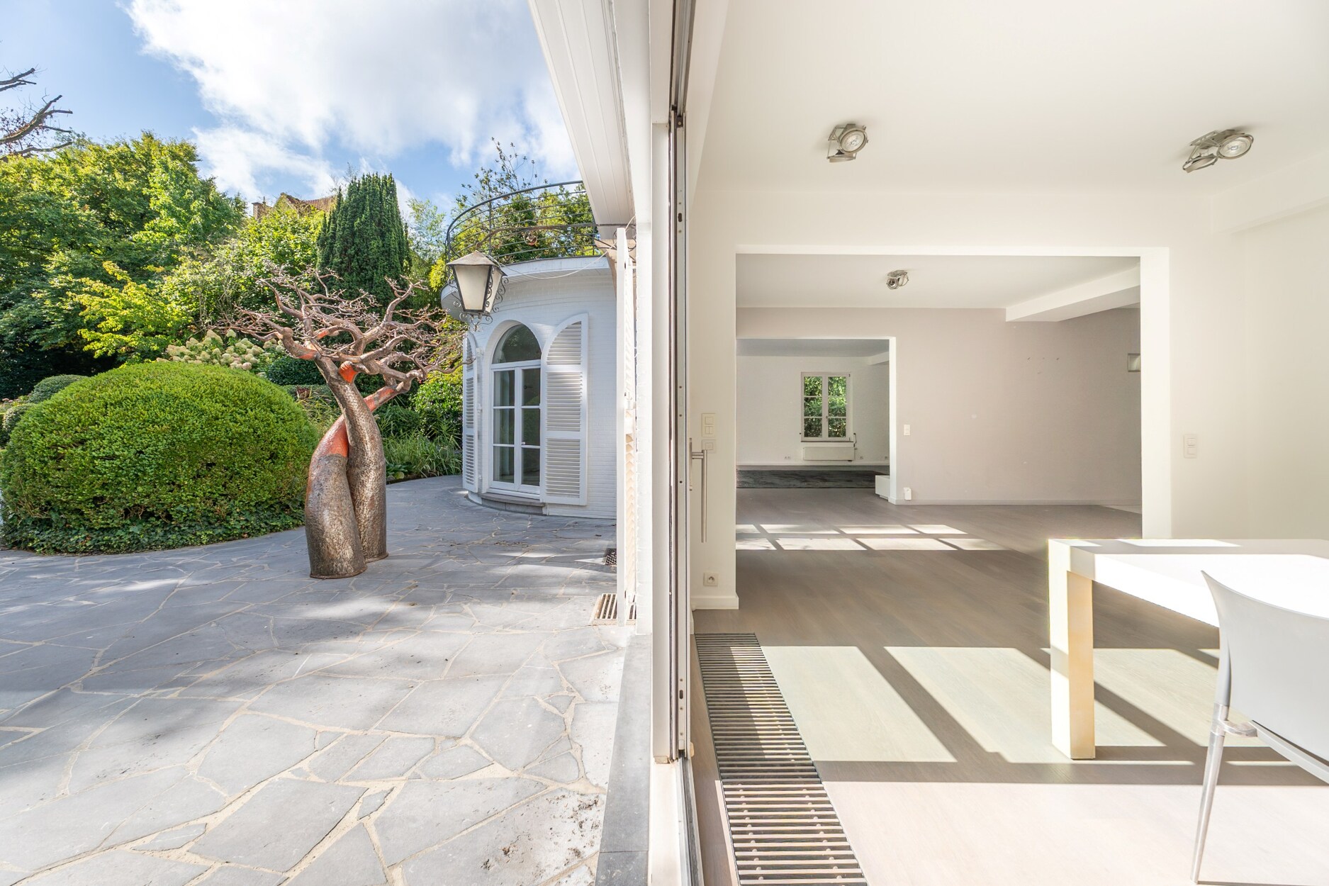Op tuinniveau leidt de inkomhal naar lichtrijke ontvangstruimtes en een eetkamer met toegang tot een zuidgerichte terras en een aangelegde tuin. De keuken met centraal eiland wordt aangevuld door een gezellige ontbijthoek. Op dit niveau bevinden zich ook een bureau, een apart toilet en een slaapkamer met eigen douchekamer en sanitair.