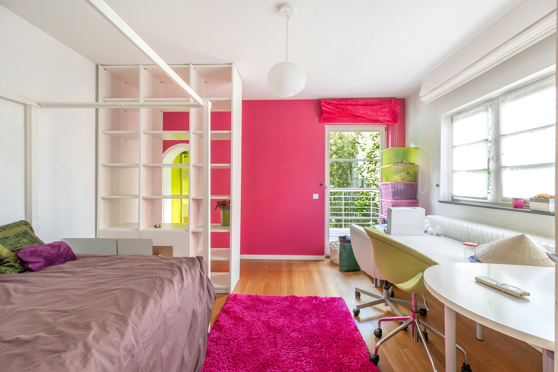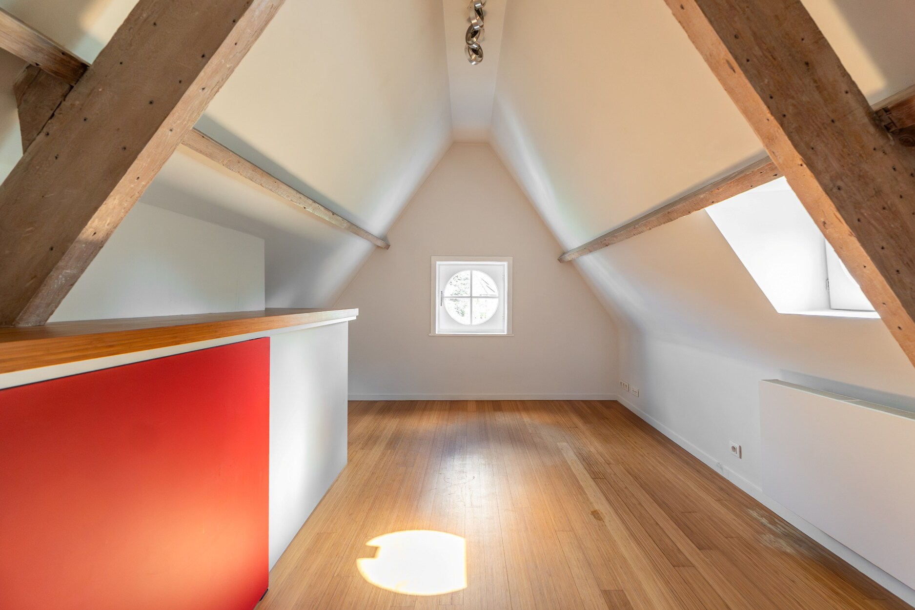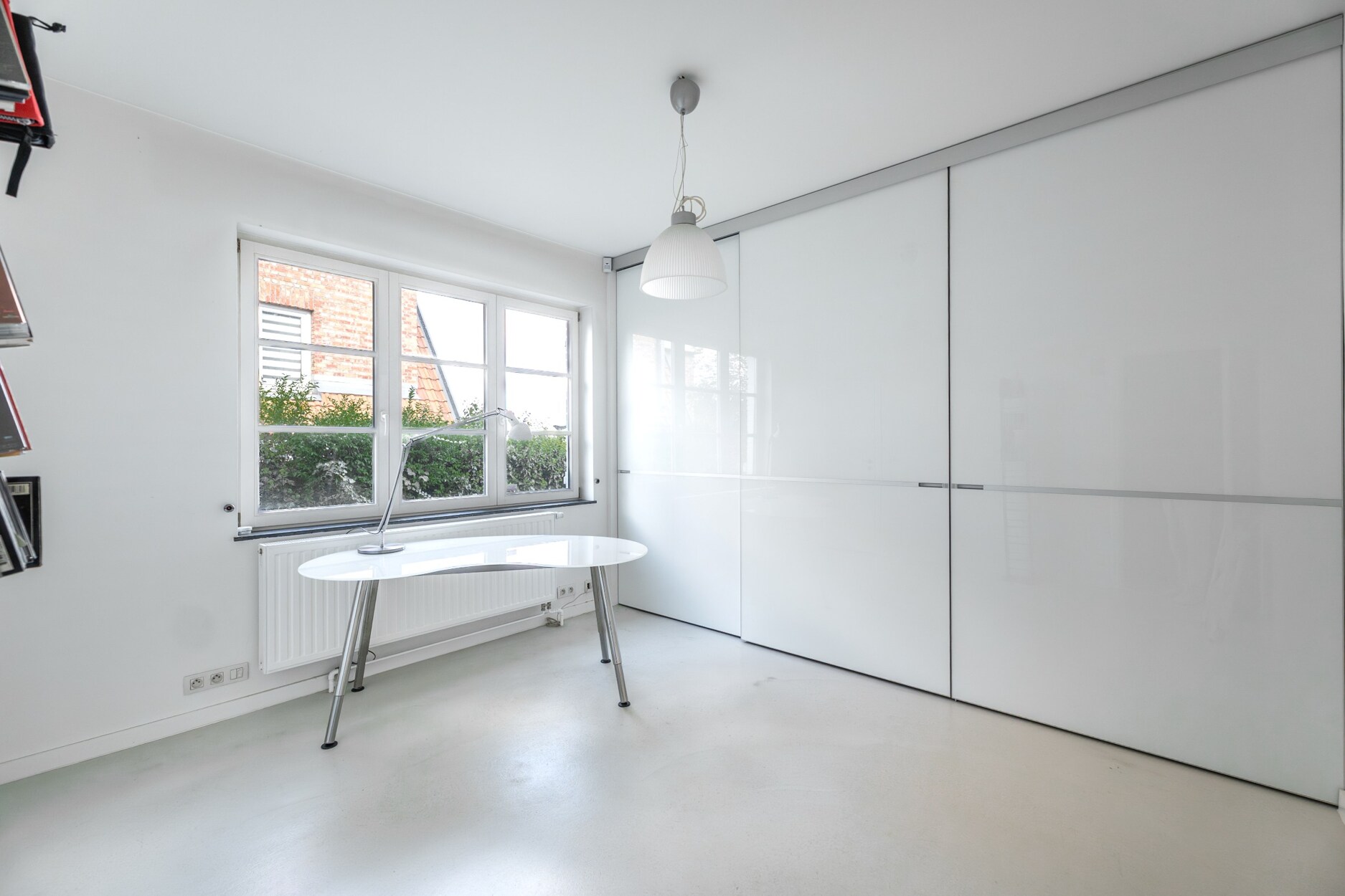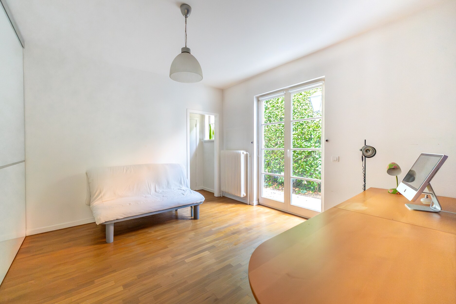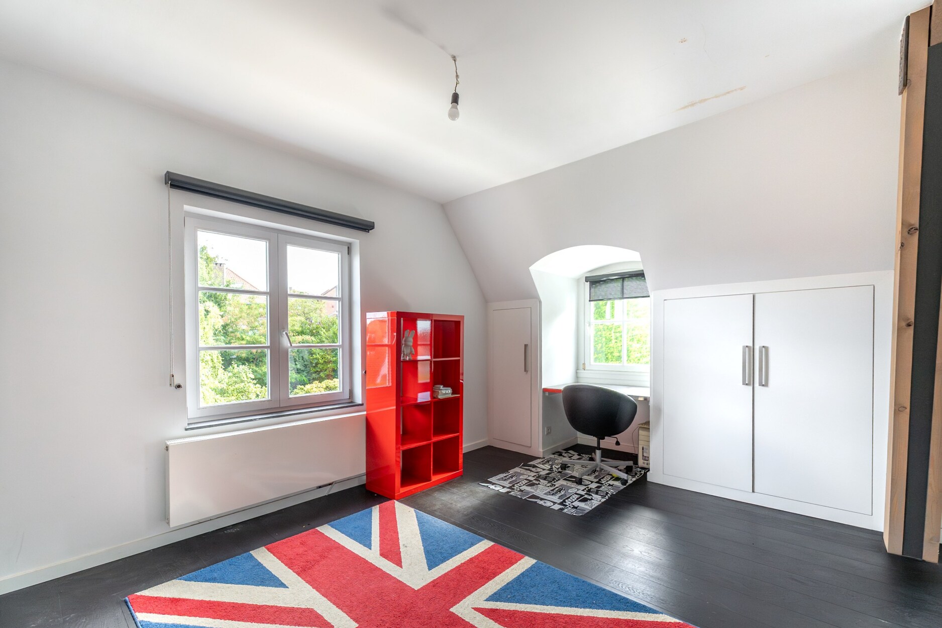 De bovenste verdieping is ingericht als polyvalente ruimte, momenteel in gebruik als bureau en atelier.