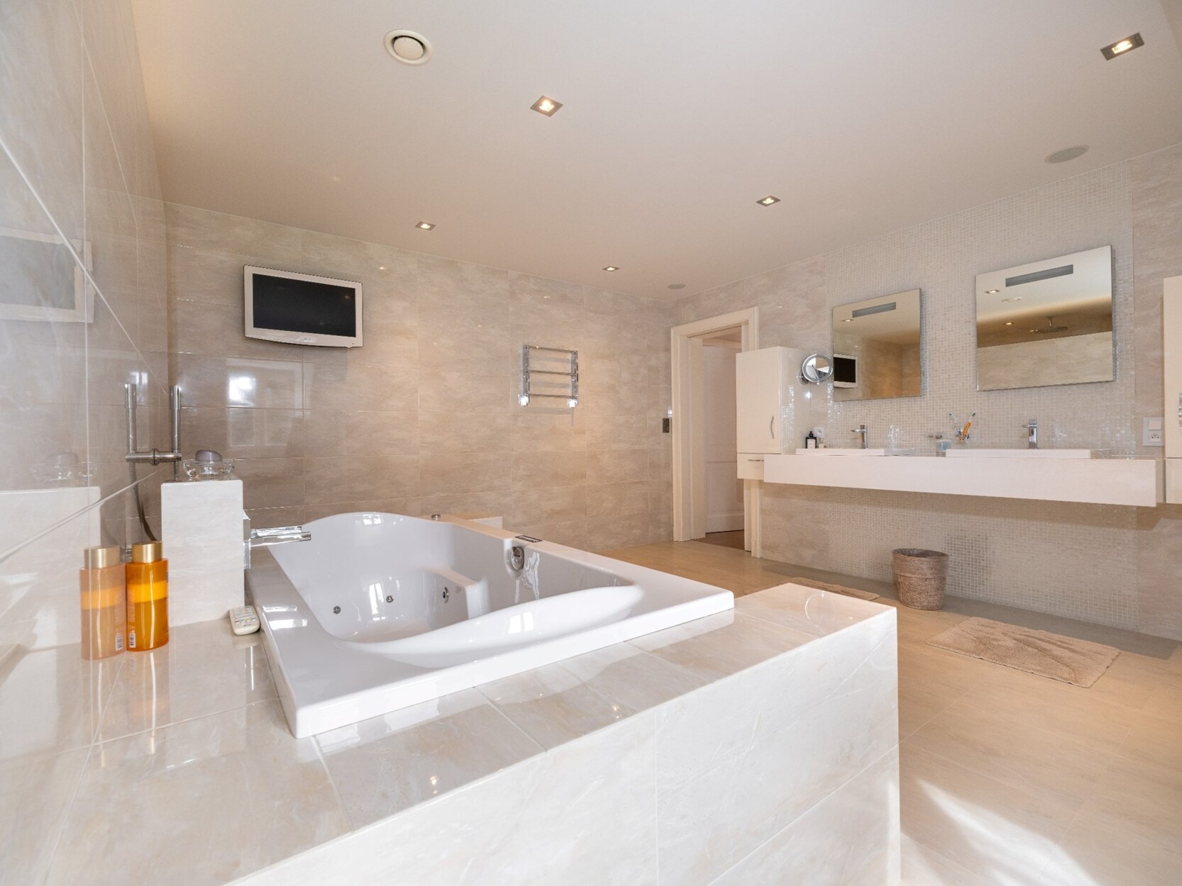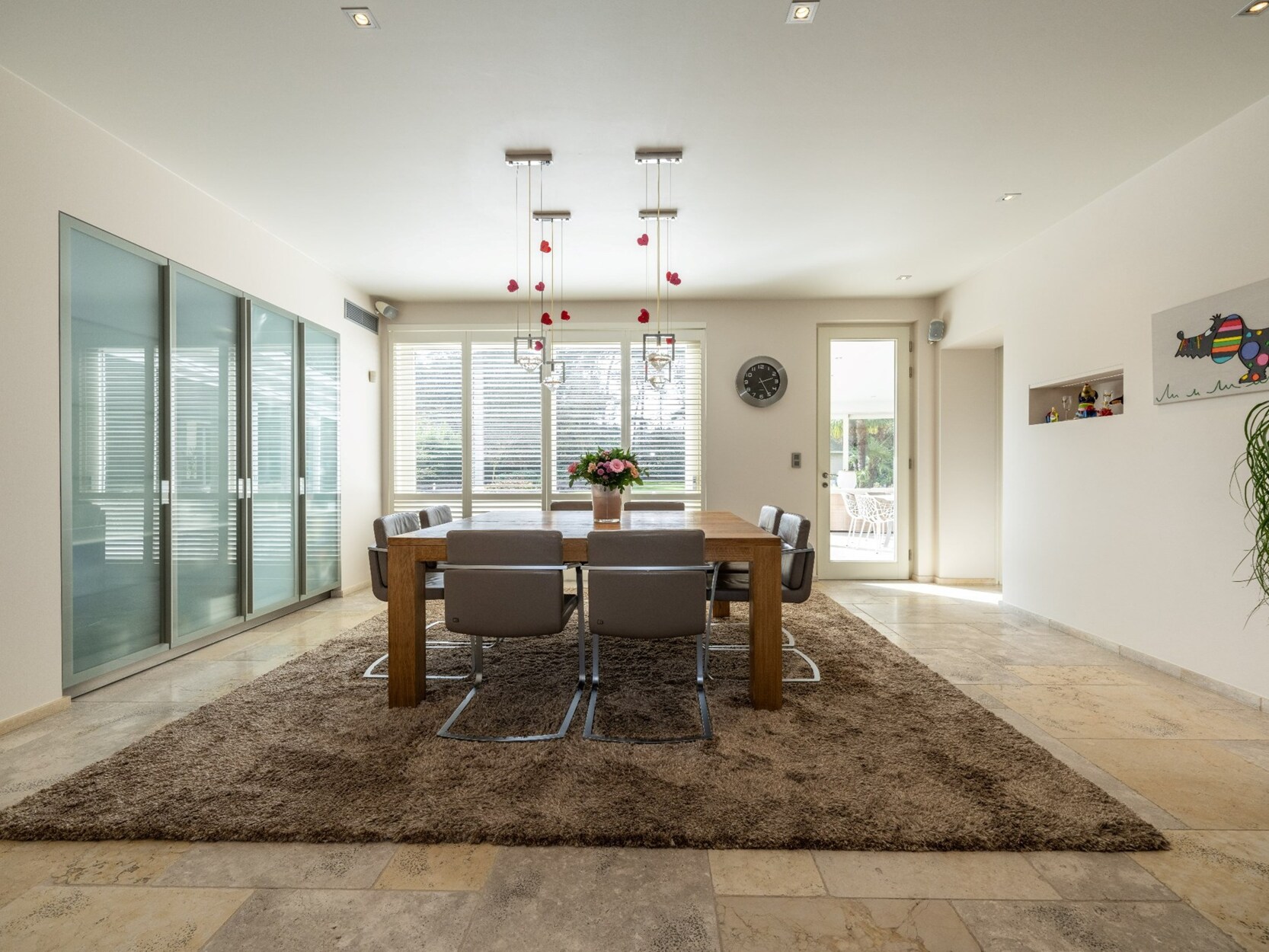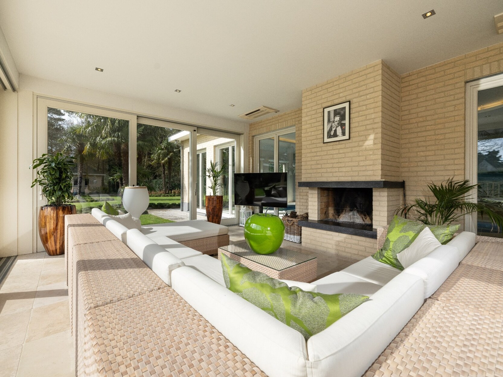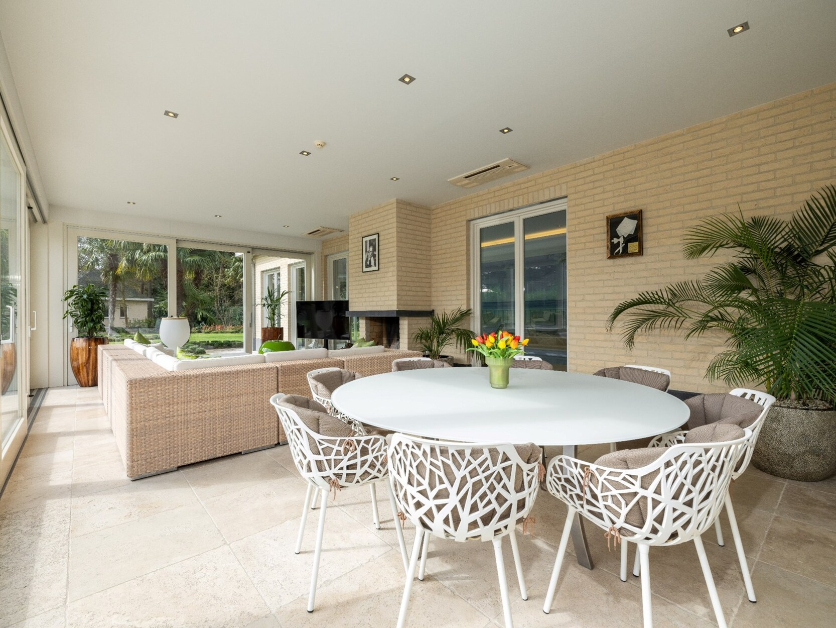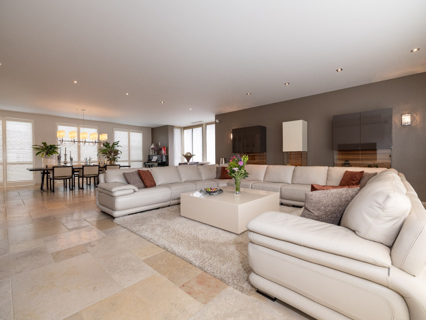 De ruime inkomhal op natuursteen biedt d.m.v. dubbel openslaande glazen deuren toegang tot de prachtige lichte leefruimte van waaruit u een mooi uitzicht heeft op de tuin achteraan. De leefruimte omvat een ruime woonkamer (ca. 100m²) op natuursteen opgedeeld in een gezellig salon met gashaard en een eetkamer, een aparte TV-hoek/kantoor en de schitterende woonkeuken die werkelijk compleet uitgerust is met koelkast, diepvriezer, afwasmachine, 2 heteluchtovens, combi-oven, inductiekookplaat, koffiemachine, 2 bordenverwarmers,... Aansluitende koele berging met ingemaakte kasten voorzien van airco voor koeling.