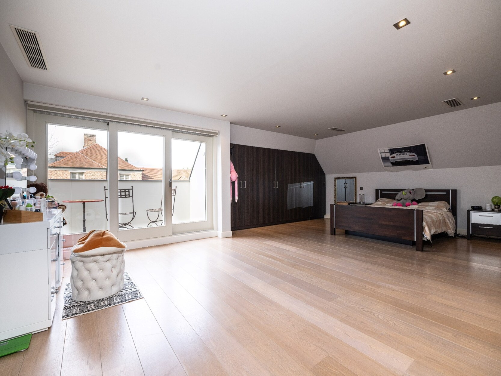 - Airconditioning/luchtverwarming in living/keuken/kantoor/alle slaapkamers en strijkkamer (via warmtepomp), temperatuur apart in te stellen per kamer