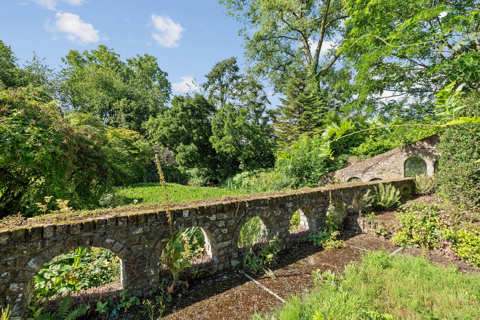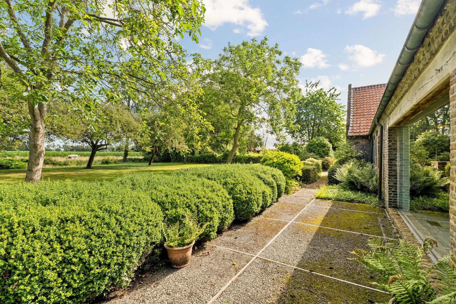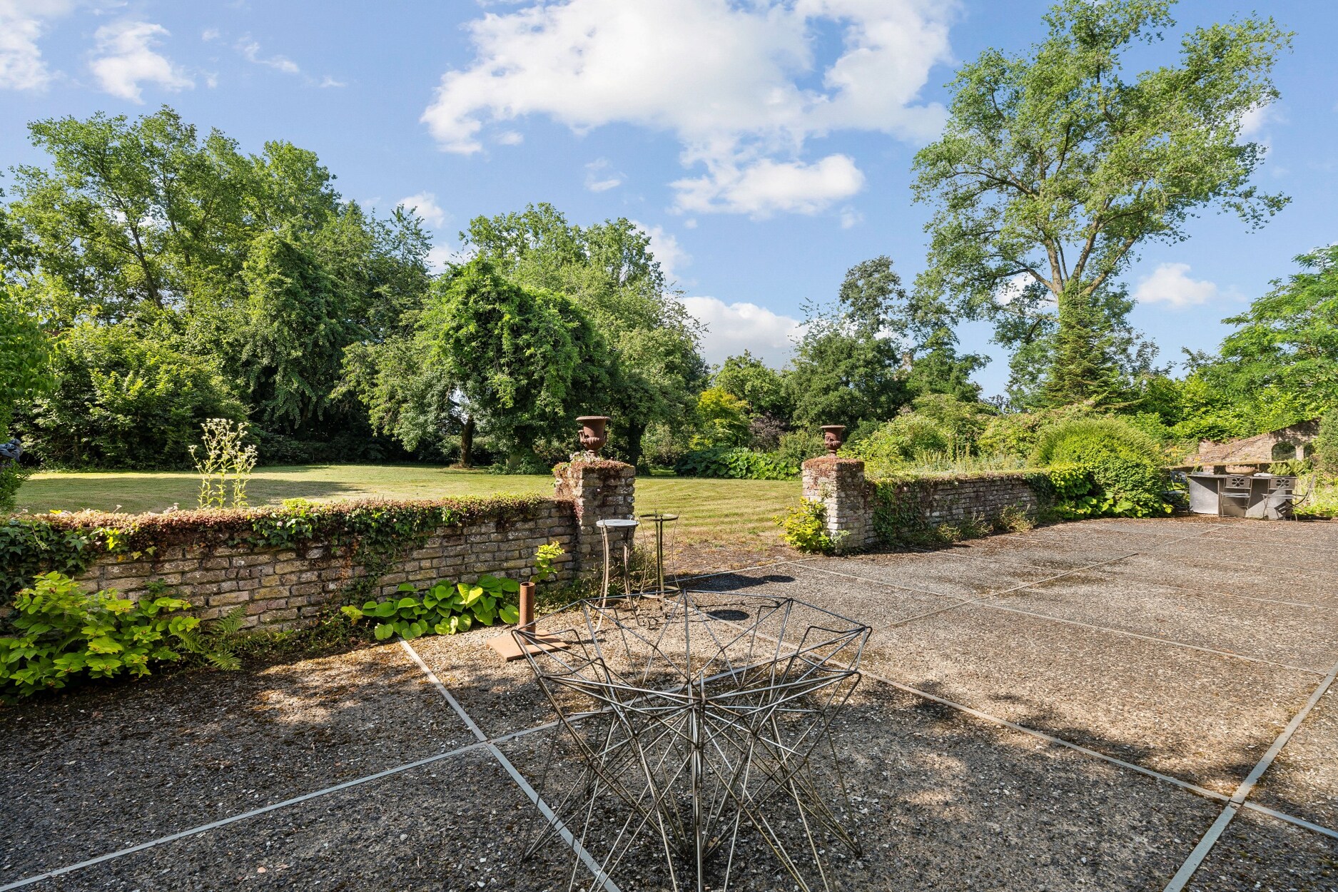 De tuin is volledig afgestemd op de architecturale visie van de woning. Elk element, van het tuinpad tot de aanplanting, ondersteunt de rustige, verstilde sfeer. Het erf, omgeven door historisch volume, creëert een gevoel van beslotenheid en rust.