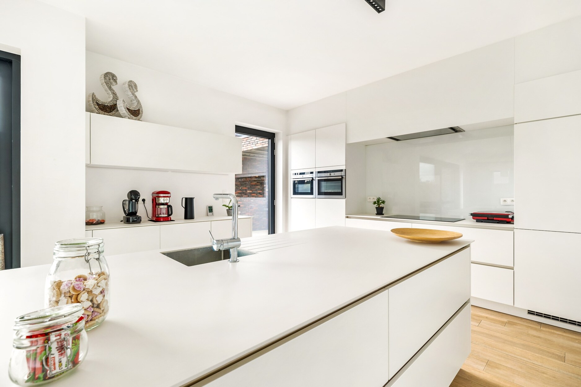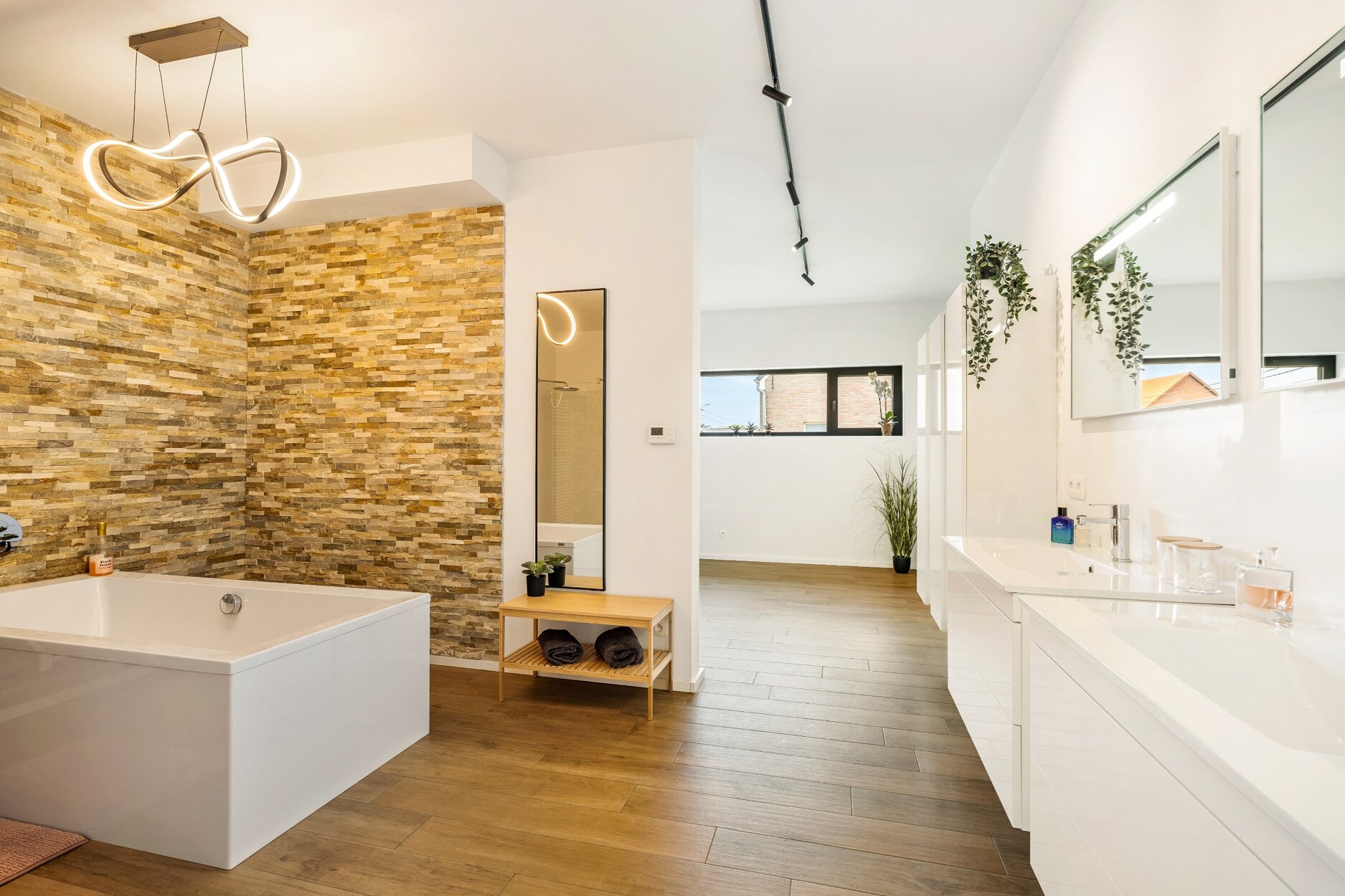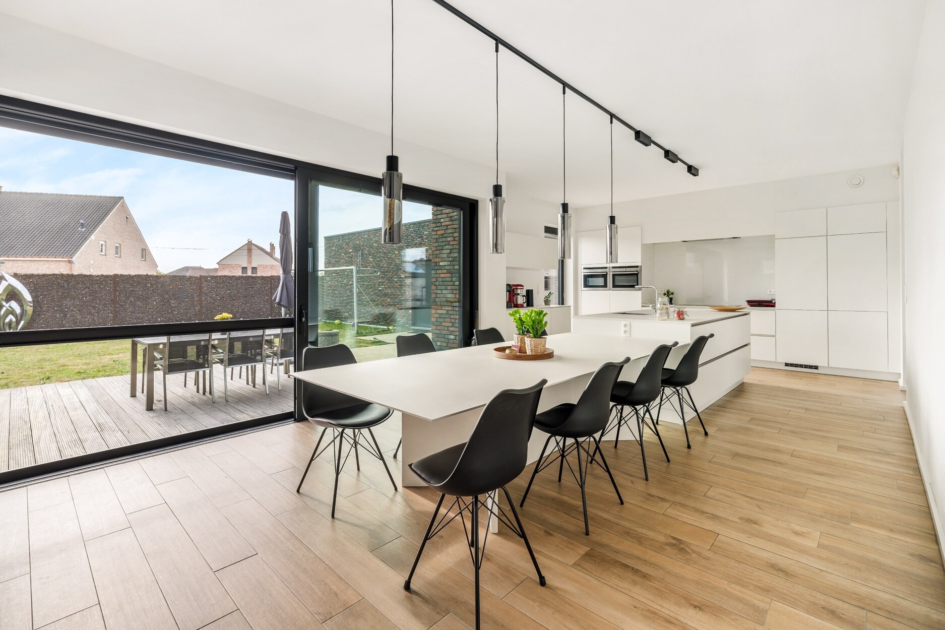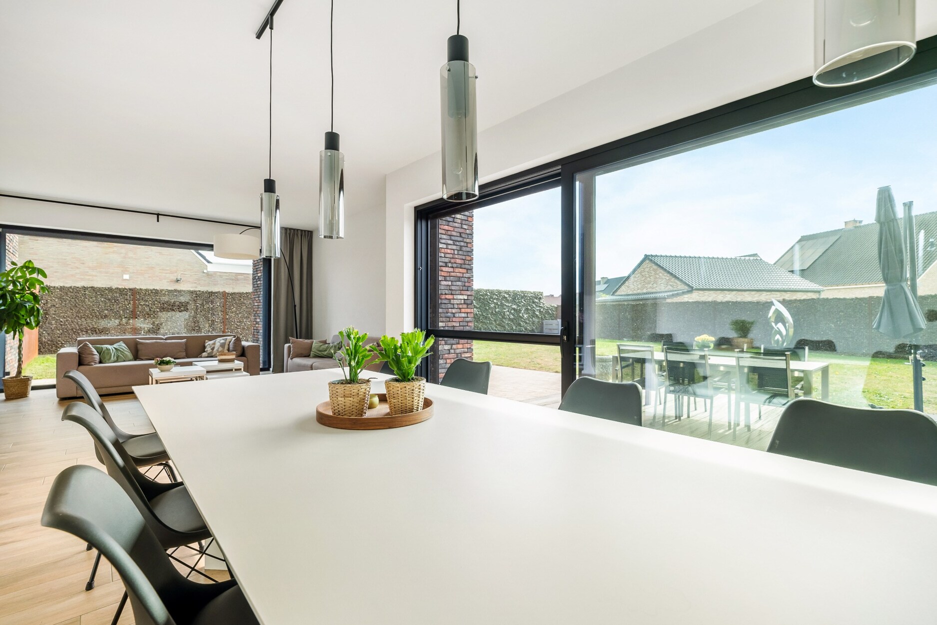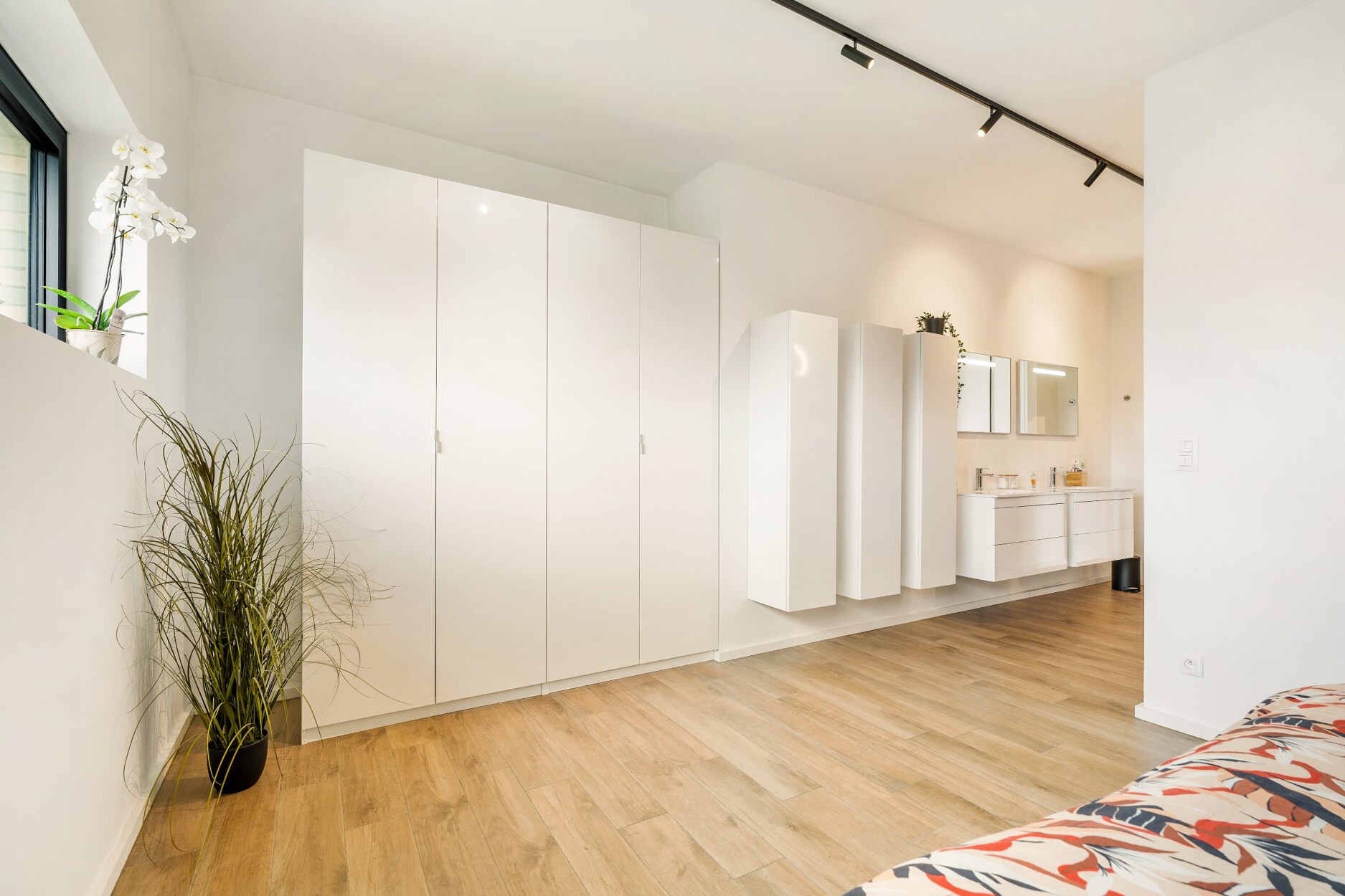 Via de pivoterende deur komen we in de inkomhal met gastentoilet, u heeft toegang tot de lichtrijke woon-leefkamer met een meer dan compleet uitgeruste open keuken. Via leefruimte- keuken is er toegang tot de zeer ruime stockage /berging- wasruimte. Hier kan men alles netjes wegbergen in de ruime en praktische berging. De woon-leefruimte is lichtrijk en heeft toch ook de nodige gezellige toets met de parketlook vloer. Via het grote achterraam met schuifdeur is er een vlotte toegang tot de mooie en ruime terrassen en de onderhoudsvriendelijke tuin met weids zicht. De ramen op het gelijkvloers aan de zonnekant zijn voorzien van zonnescreens. Verder is er op het gelijkvloers de masterbedroom terug te vinden met ensuite badkamer. De badkamer is voorzien van groot 2 persoons ligbad, regendouche met zij-jets en 2 wastafels. Toilet is langs de badkamer voorzien.
