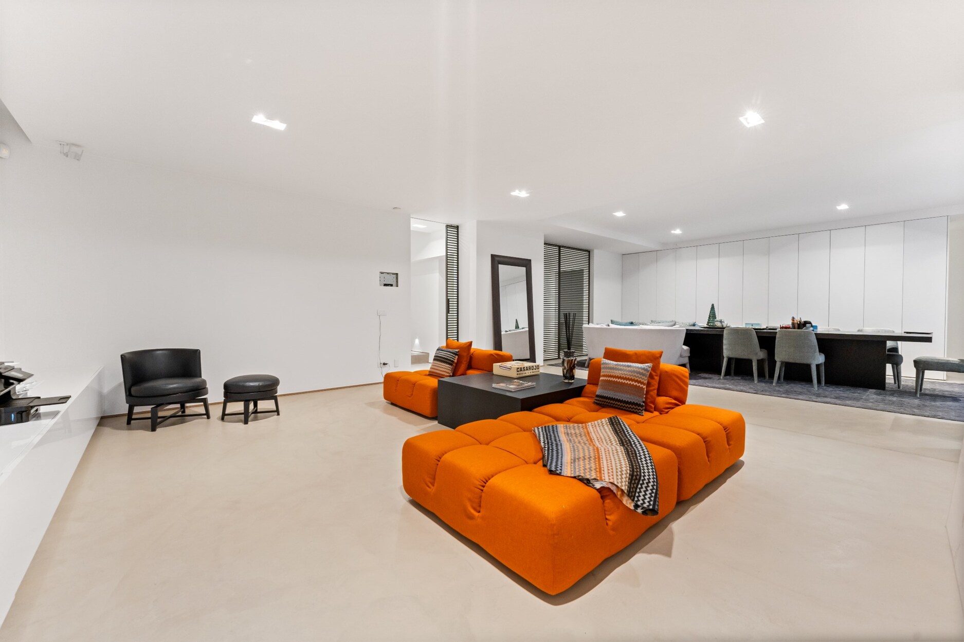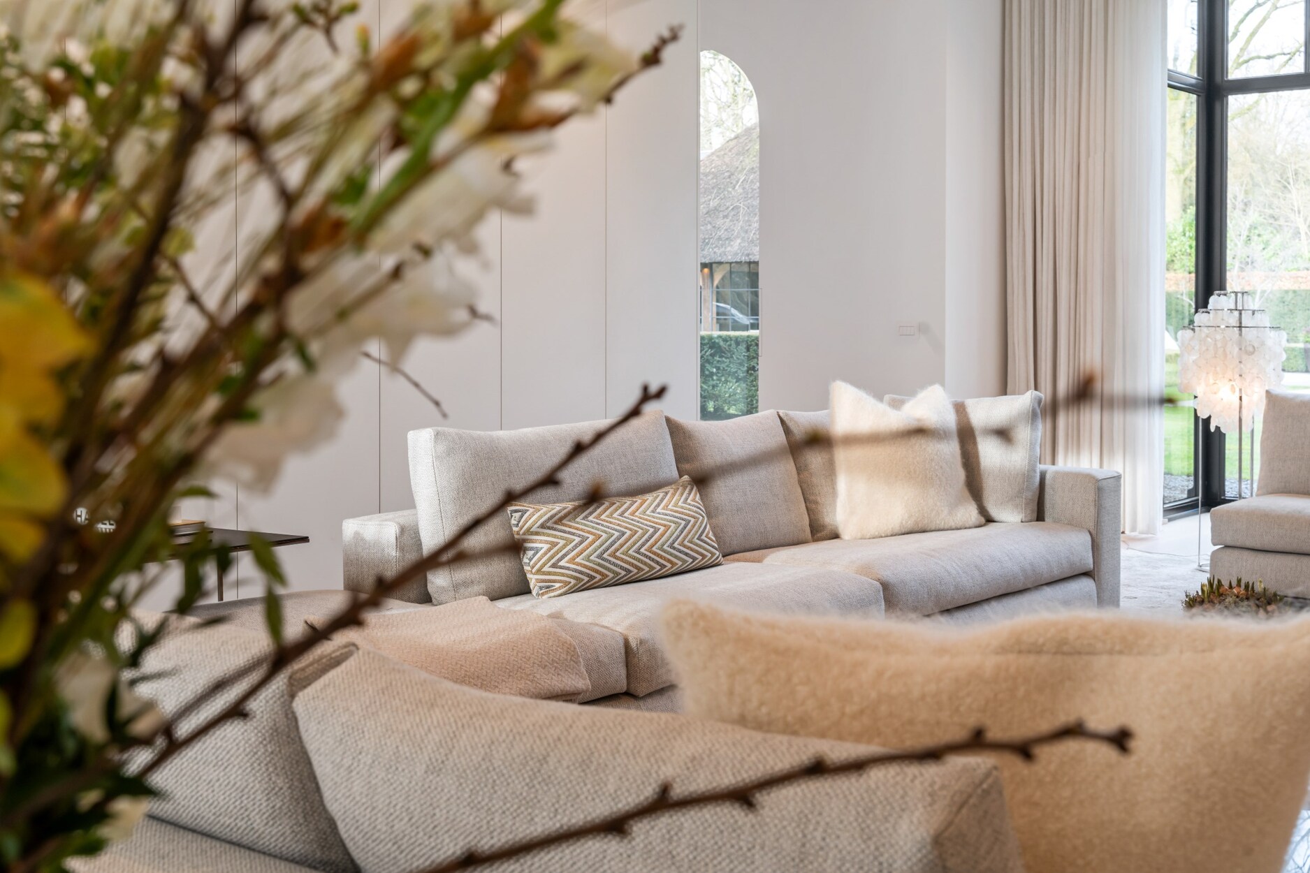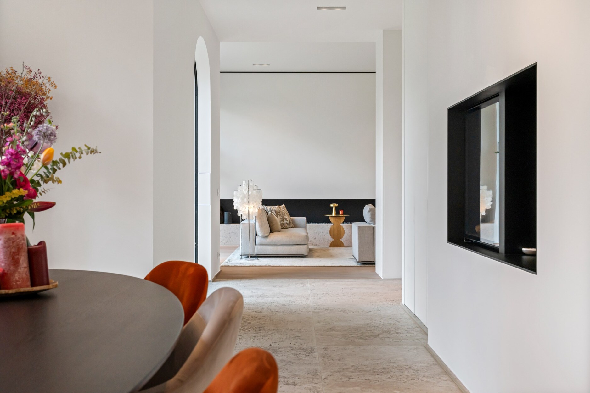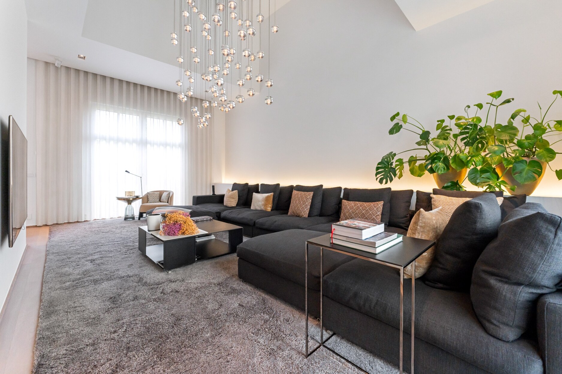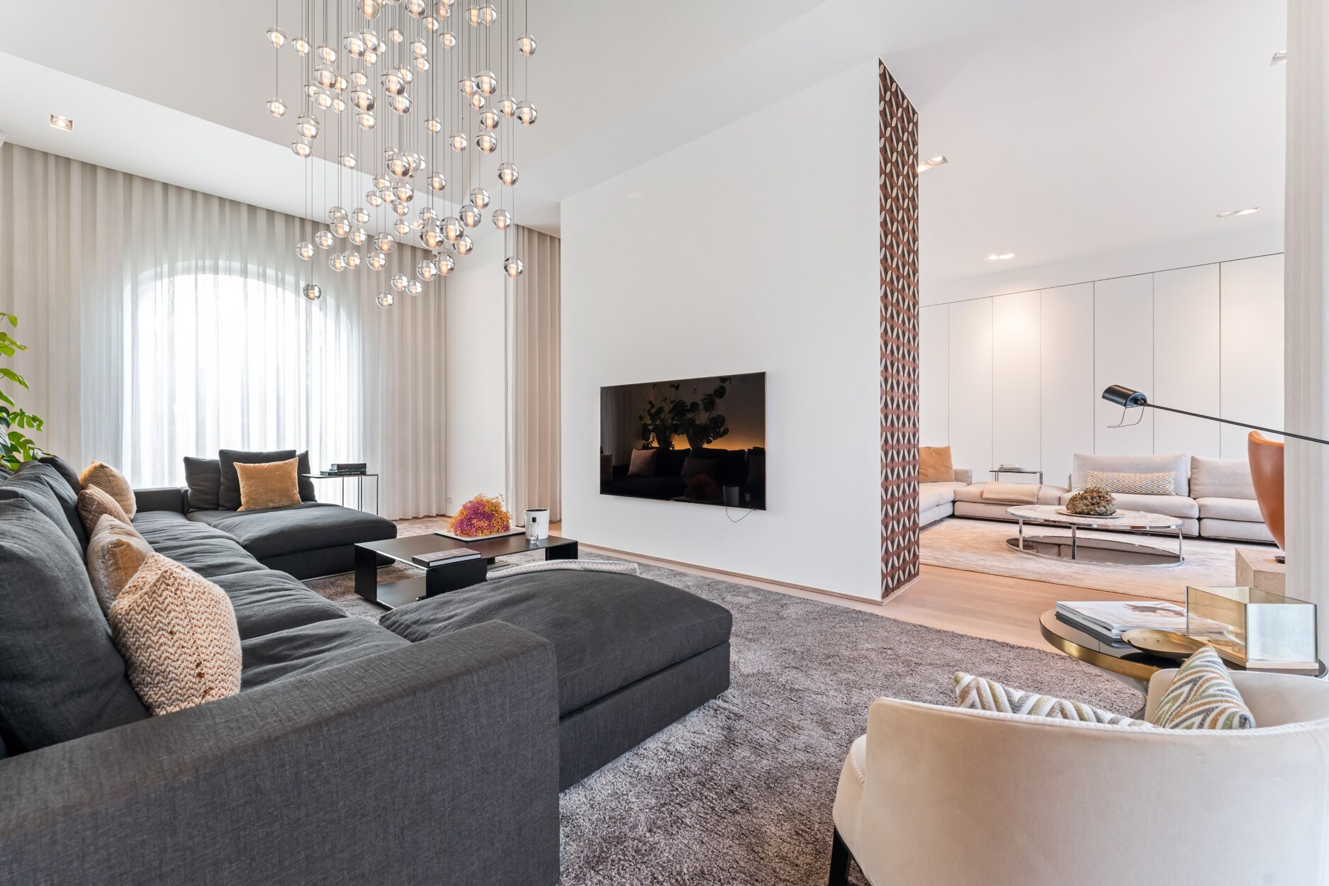 Bij het betreden van de inkomhal van deze villa voelt u meteen de ruimtelijkheid en openheid die het geheel te bieden heeft. De grote raampartijen zorgen voor schitterende lichtinval, alsook de hoge plafonds bieden een zeer ruimtelijk gevoel. Links van de inkomhal treft u gastentoilet en vestiaire. De leefruimten strekken zich uit over de gehele breedte van de villa. Aan de rechterkant vindt u twee ruime zithoeken op parket, waarvan één voorzien is van een gezellige gashaard, de ideale plek om in stijl uw gasten te ontvangen. In de andere zithoek kunt u gezellig tv-kijken. Het plafond reikt hier tot in de nok en wordt verlicht door een schitterende luchter.