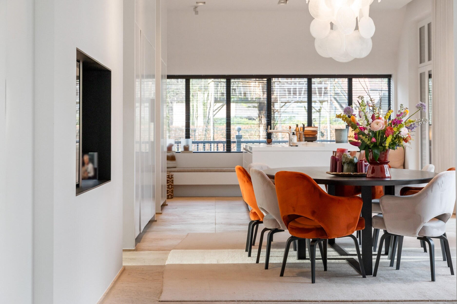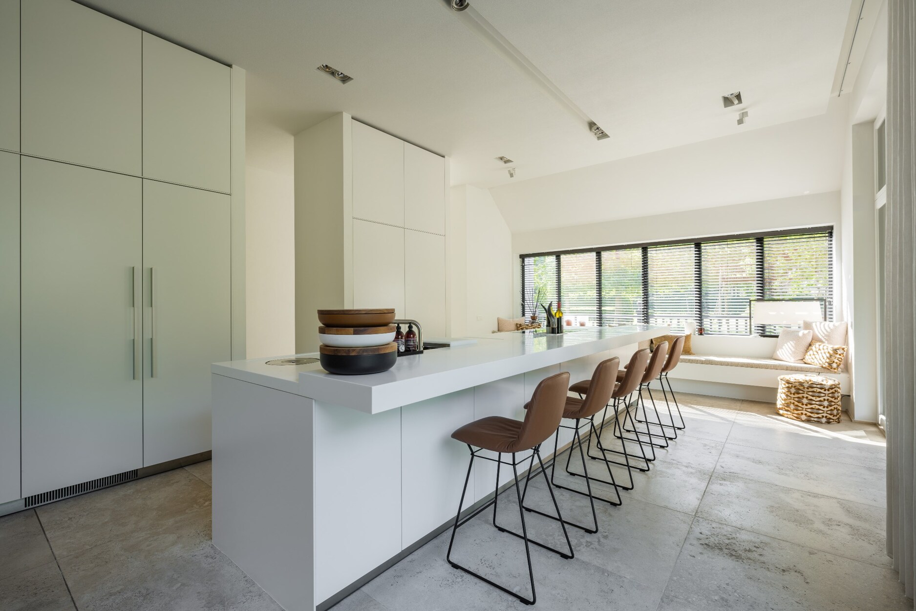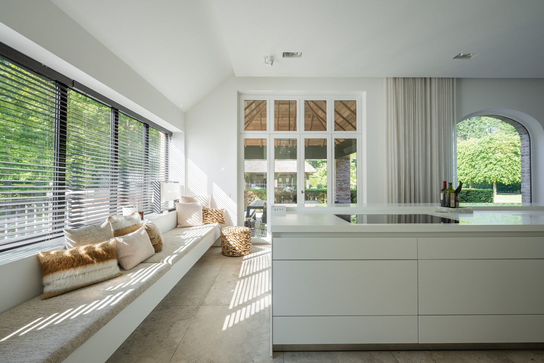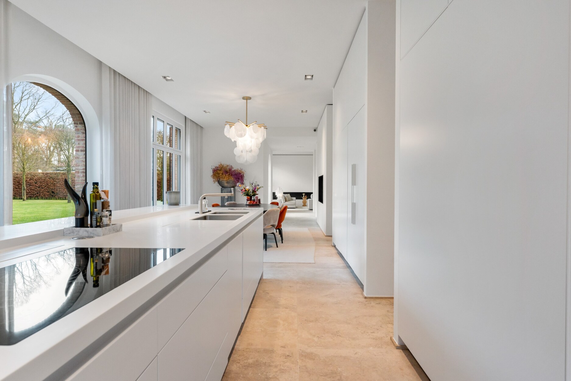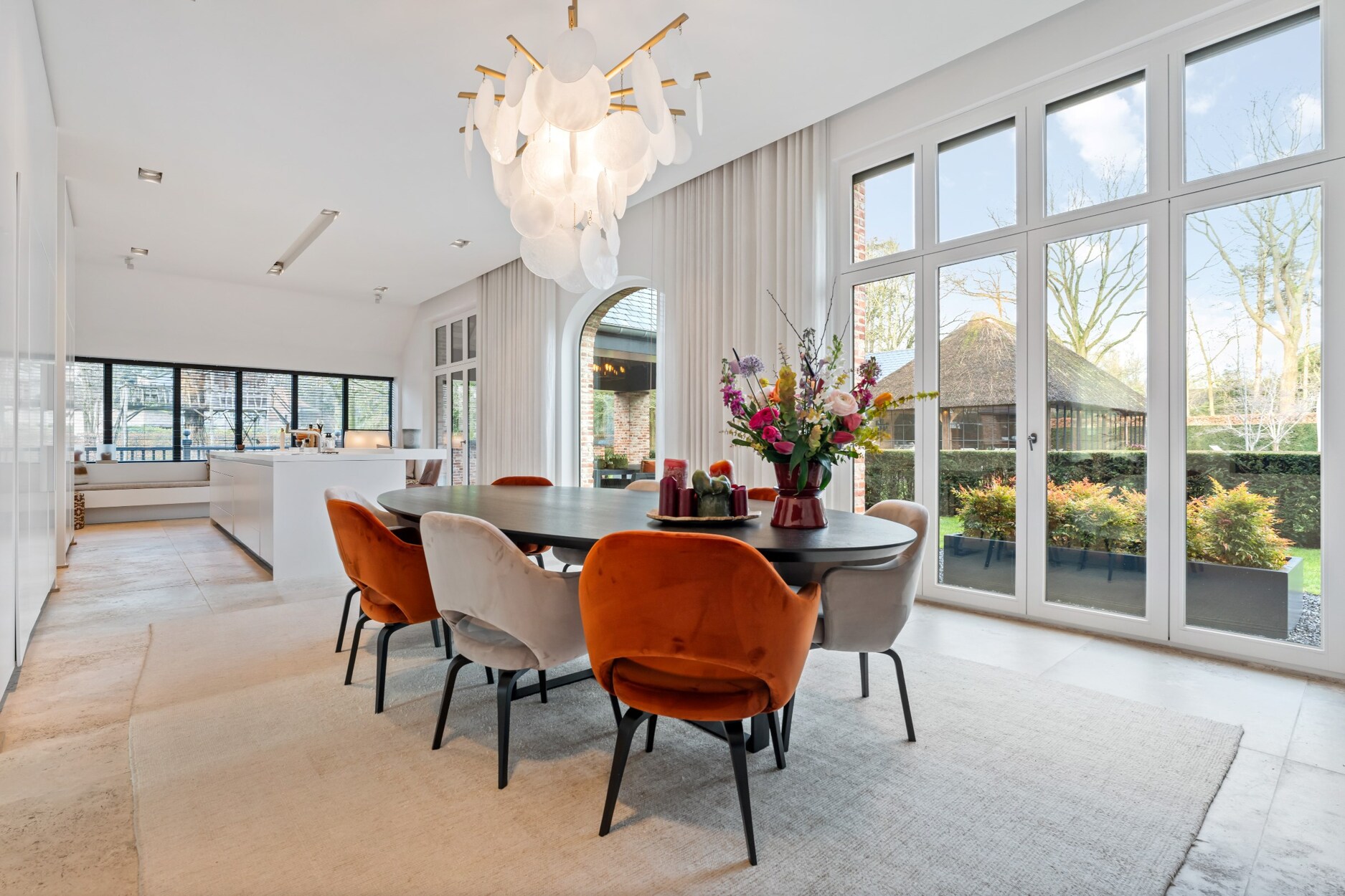 Links van de villa treft u de riante leefkeuken met eethoek voorzien van gashaard. De grote raampartijen aan de achterkant zorgen voor een mooie connectie met de tuin en het zwembad.