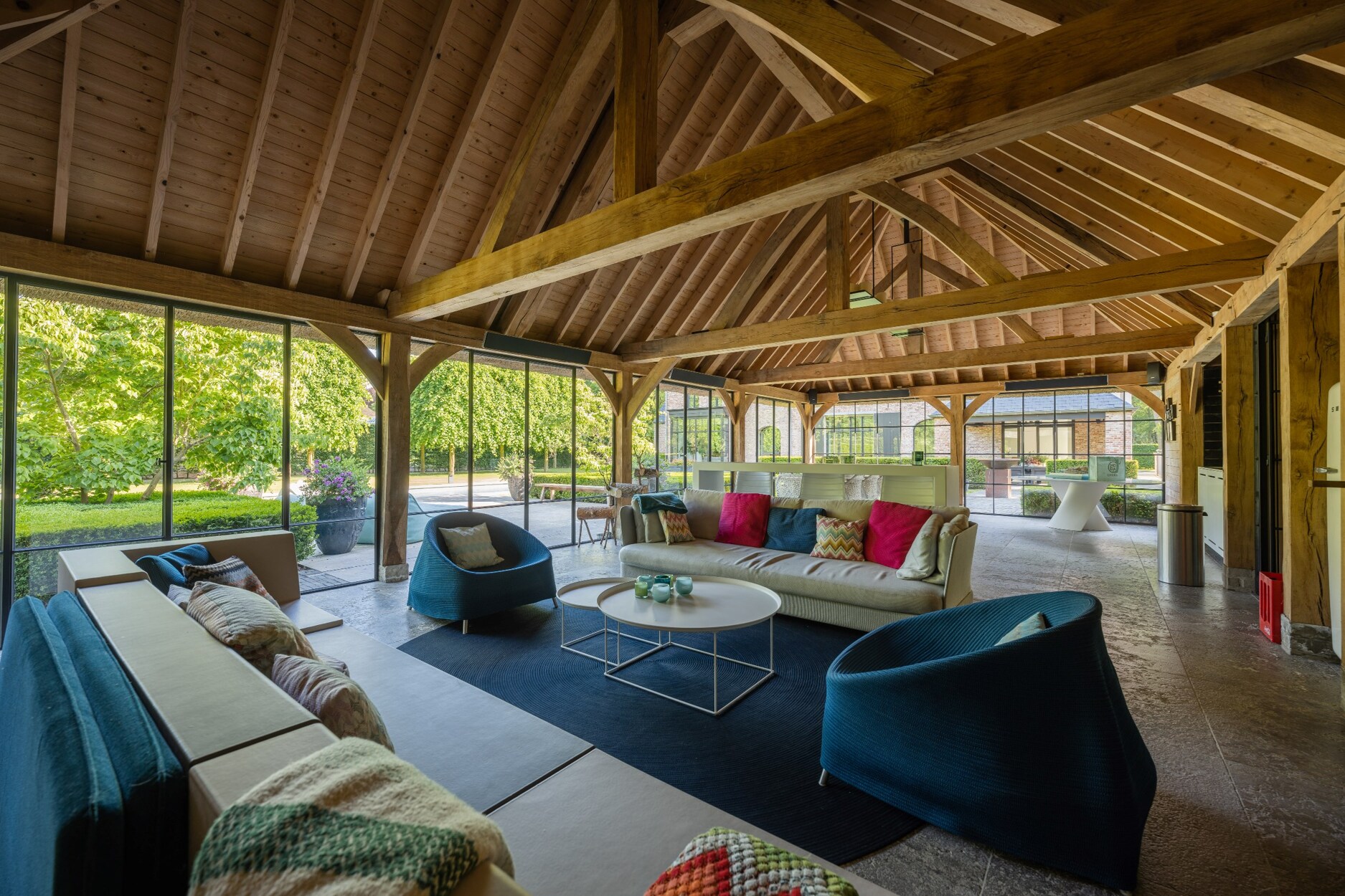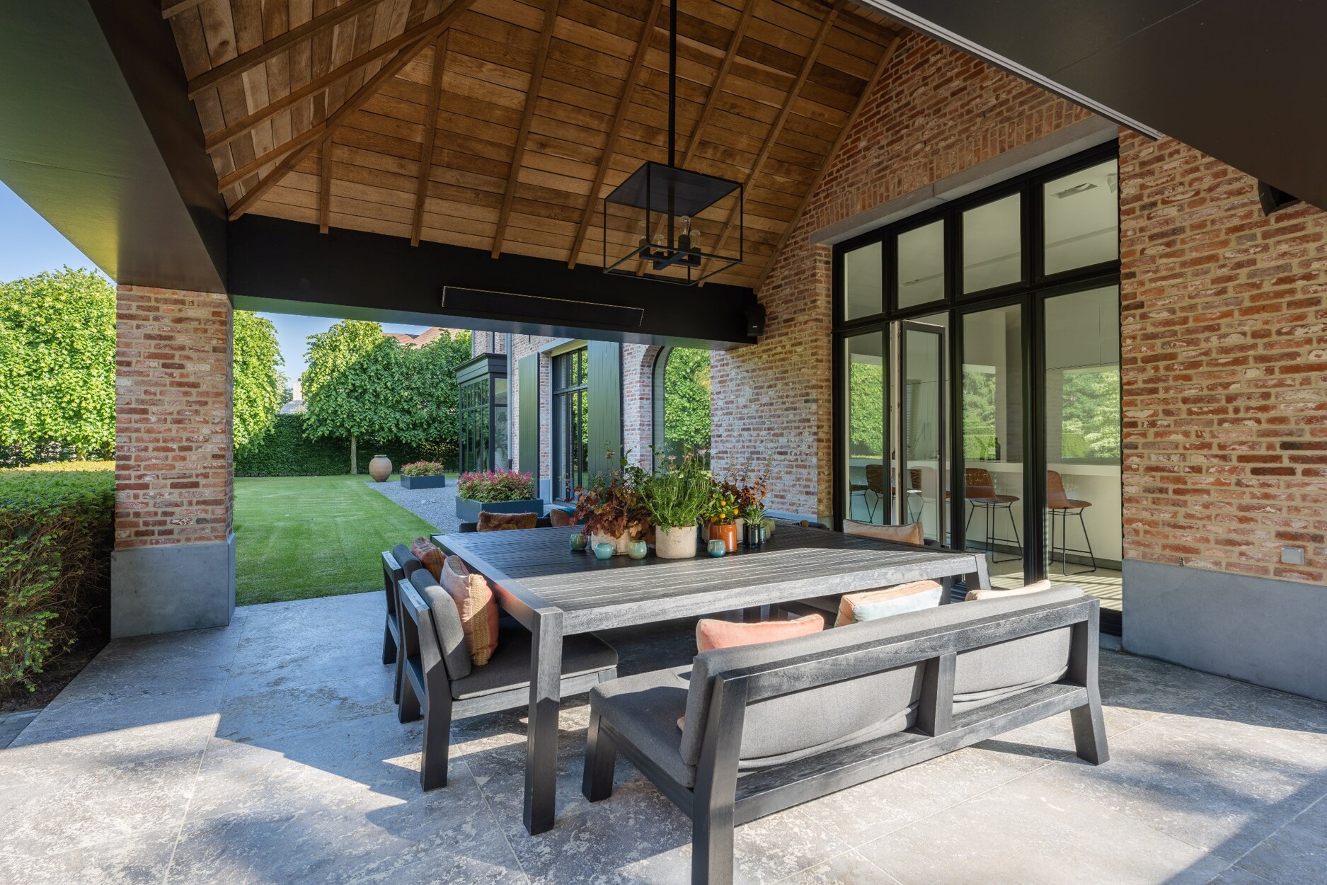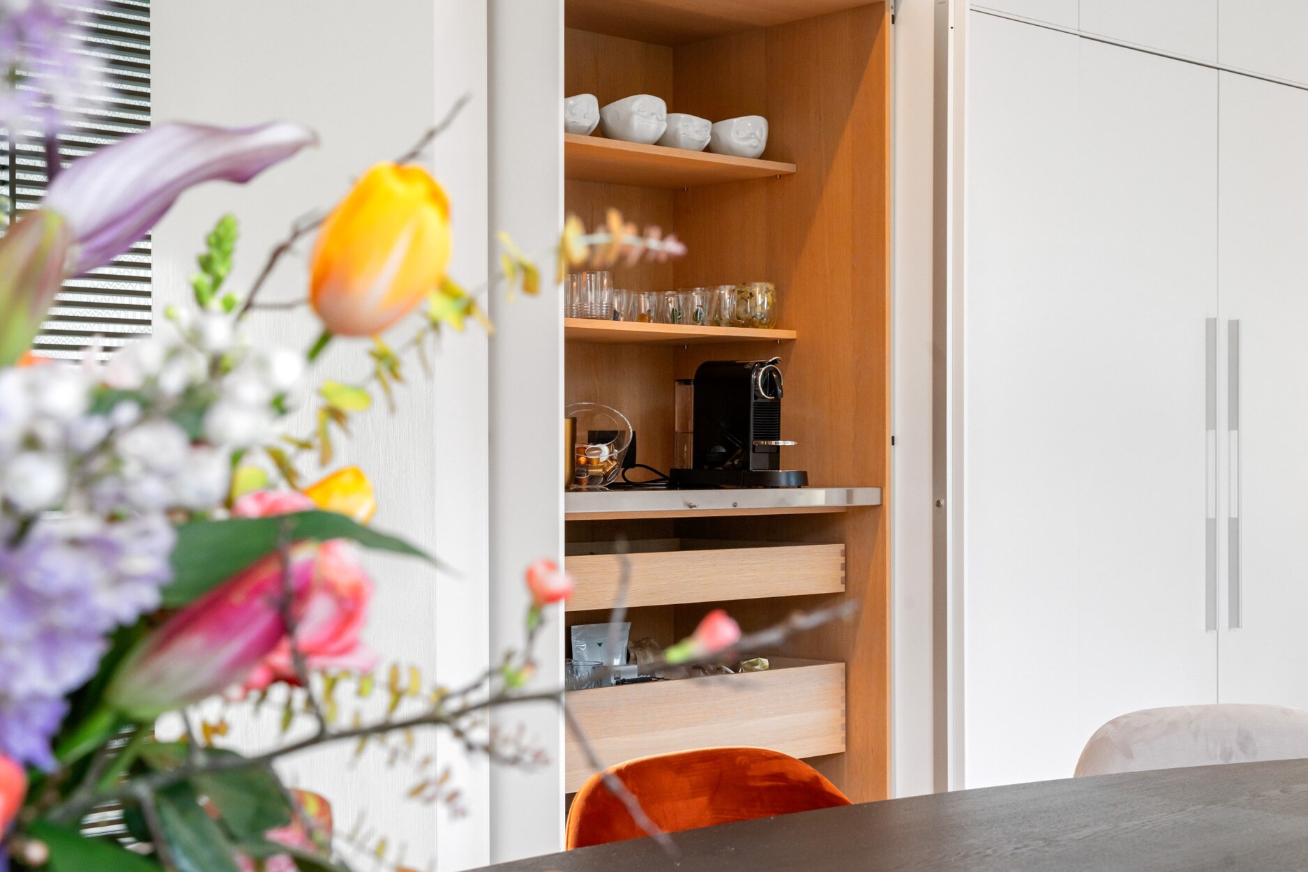 De keuken is een culinair paradijs uitgerust met high-end Gaggenau apparatuur (oa 2 steamers, 2 heteluchtovens, 2 warmhoudlades, inductiekookplaat, Bora afzuigsysteem, 2 grote koelkasten,...). Het is heerlijk om te aperitieven of te ontbijten aan de het keukeneiland of de sfeervolle banken in de erker. Het overdekt terras met verwarmingselementen is rechtstreeks toegankelijk vanuit de keuken.
