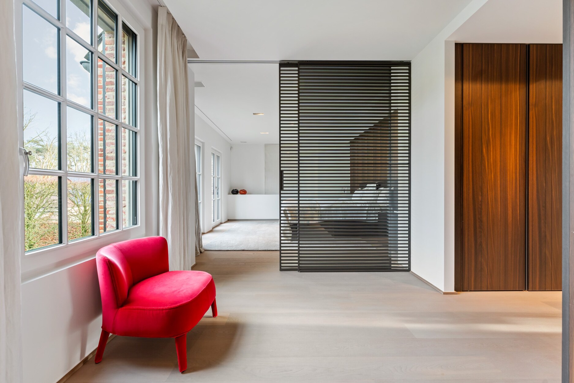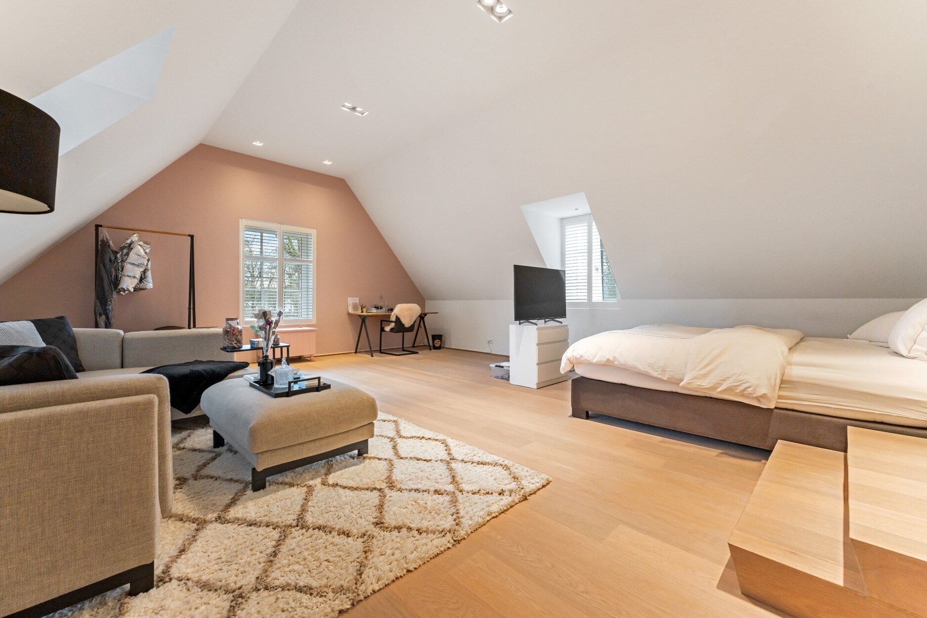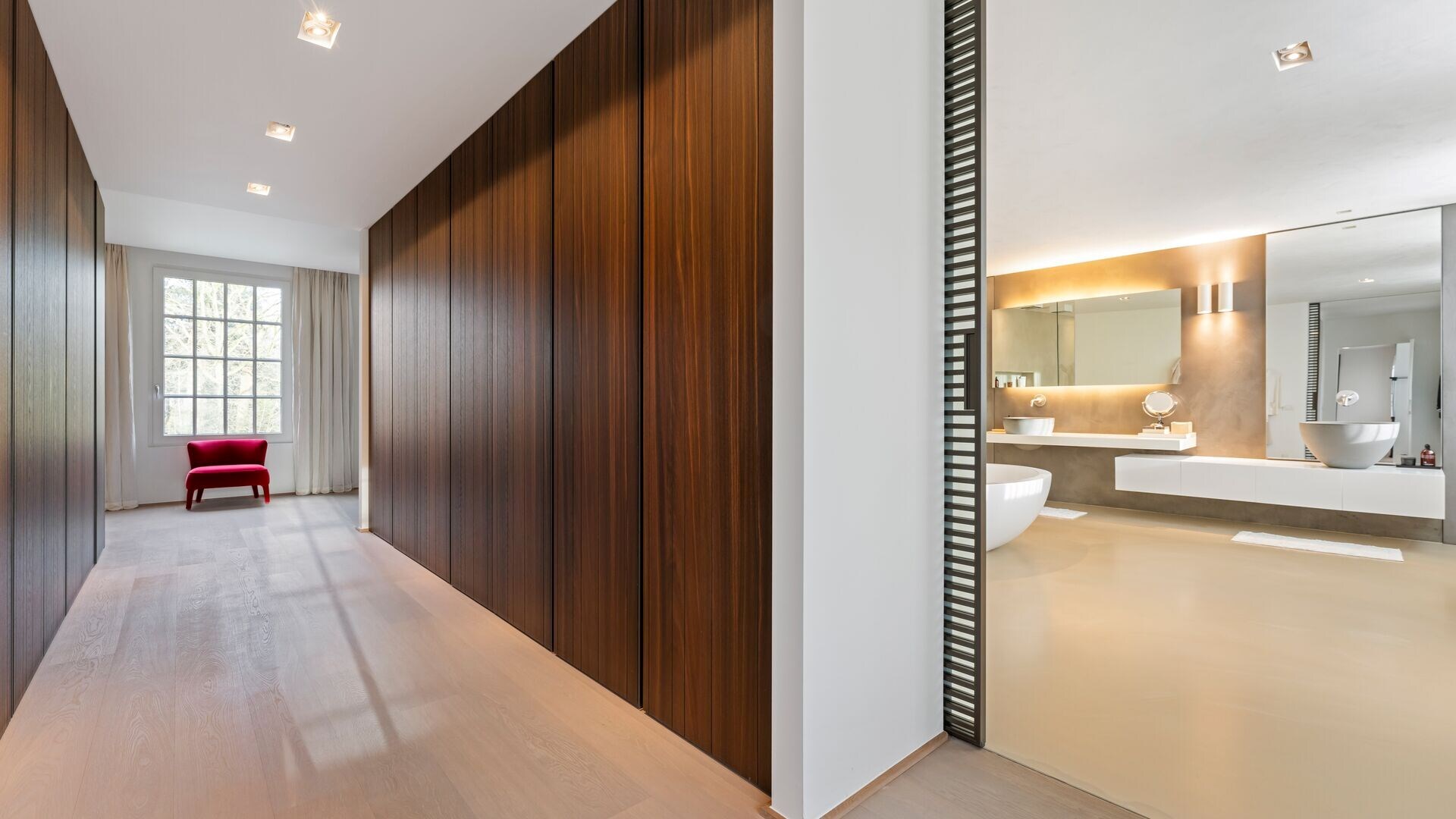 De brede trap bekleed met partet brengt u tot de bovenverdieping. Een mooi weggewerkte veiligheidsdeur met vingerslot sluit de bovenverdieping veilig af. De mastersuite bevindt zicht aan de rechterzijde en beschikt centraal over een riante dressing (Poliform), een luxe badkamer voorzien van een dubbele inloopdouche, een vrijstaand ligbad in Corean, twee wastafels in strak meubel, uitgerust met Dornbracht kraanwerk, de masterbedroom bevindt zich achteraan en heeft mooi uitzicht op de tuin. Vervolgens biedt deze suite nog een aparte zithoek/bureau met gashaard.