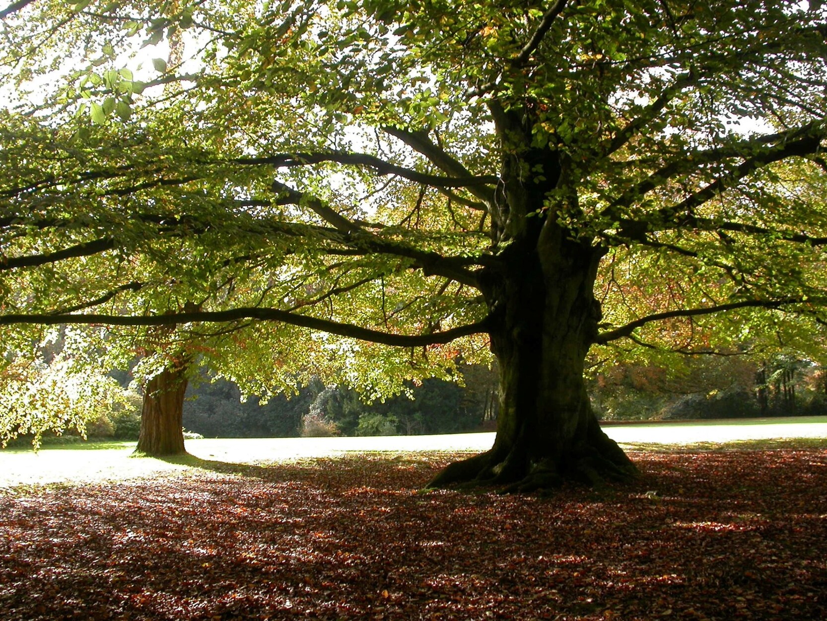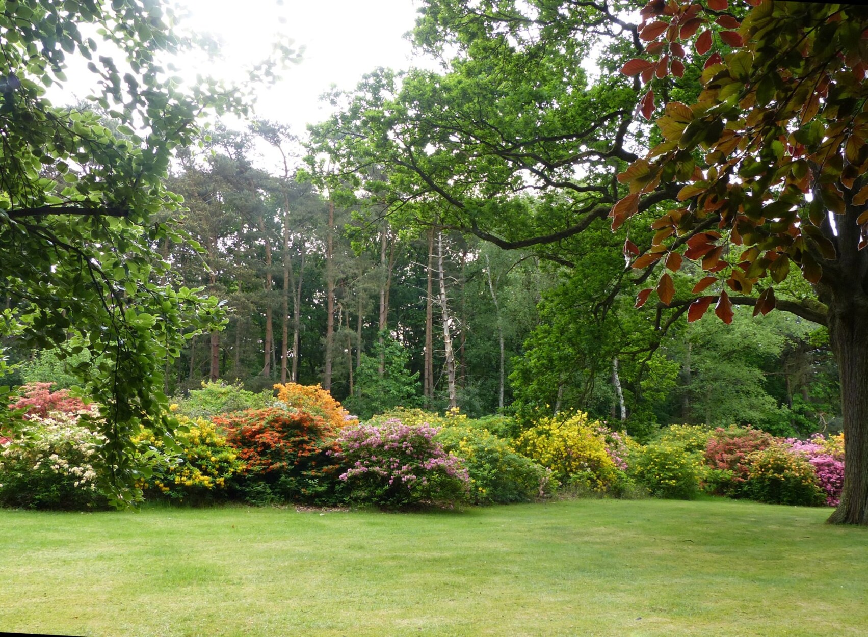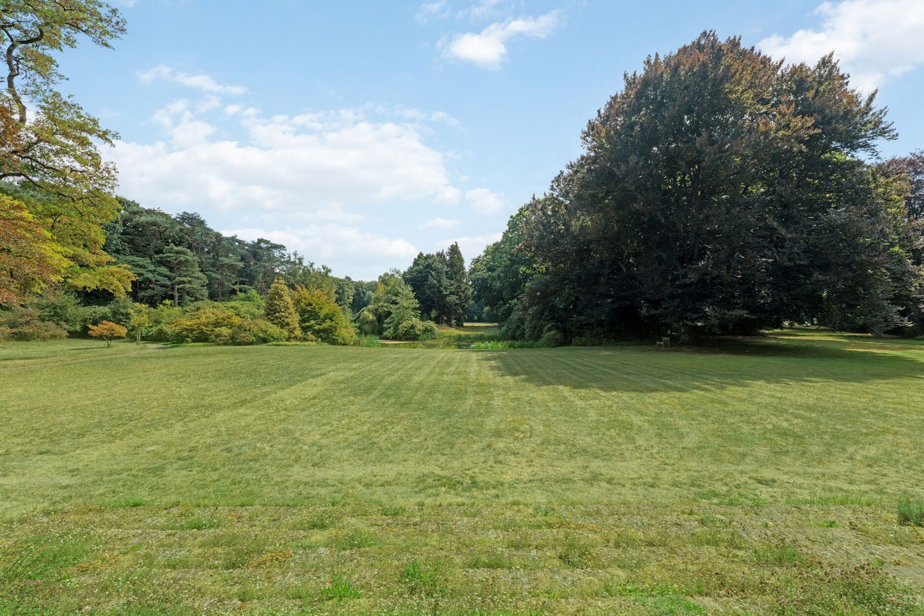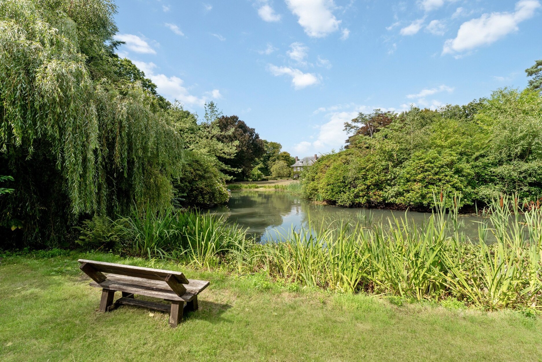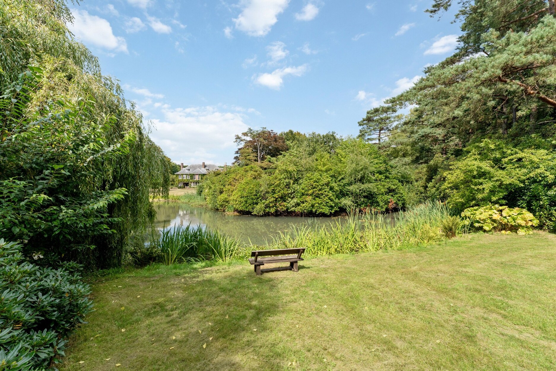 Park met vijver, eeuwenoude bomen, rododendrons, gazons en bospercelen