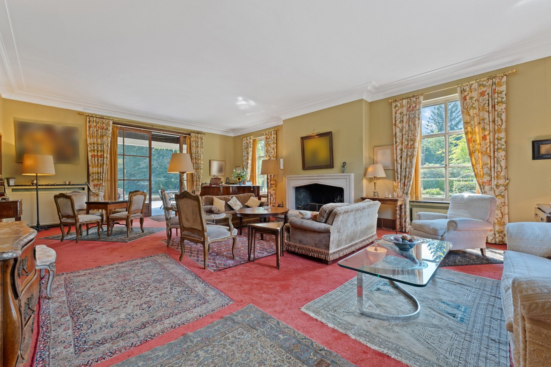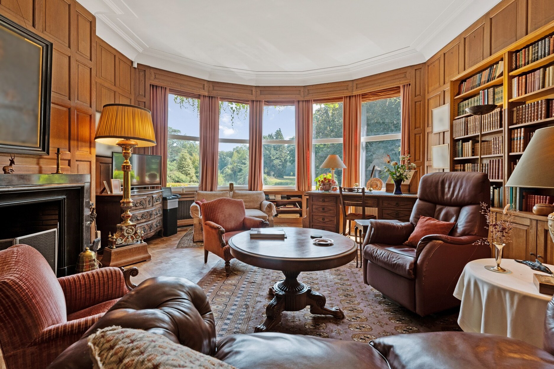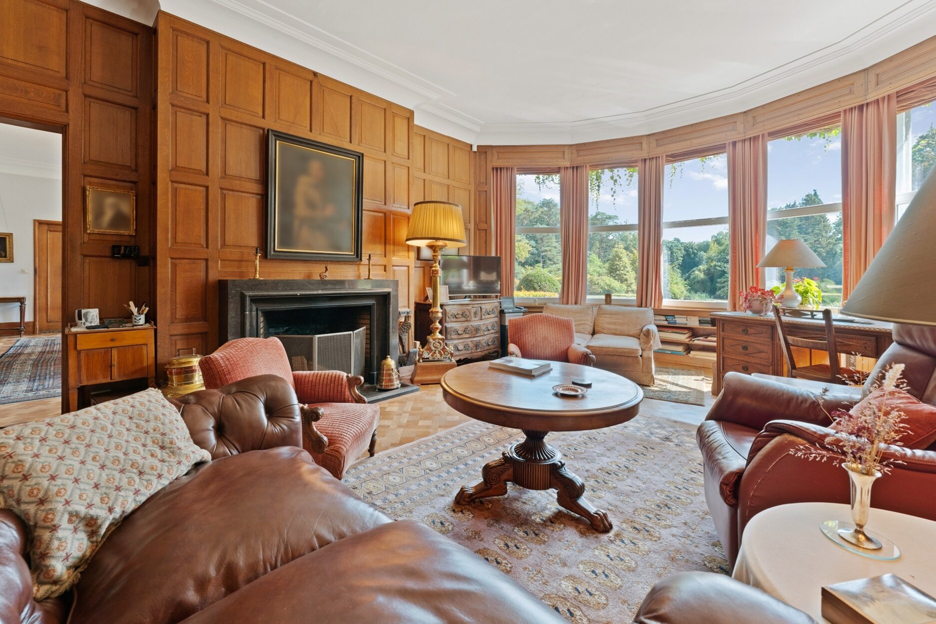 Het hart van het domein wordt gevormd door de prestigieuze villa. Een statige inkomhal leidt naar ruime ontvangstruimtes, waar hoogwaardige materialen zoals authentiek parket en sierlijke afwerkingen warmte en karakter brengen. De eetkamer met hoge plafonds en brede deuren, de prachtige bibliotheek met open haard en ingemaakte kasten, en het royale salon met meerdere zithoeken vormen samen een setting die zowel stijlvol als functioneel is.