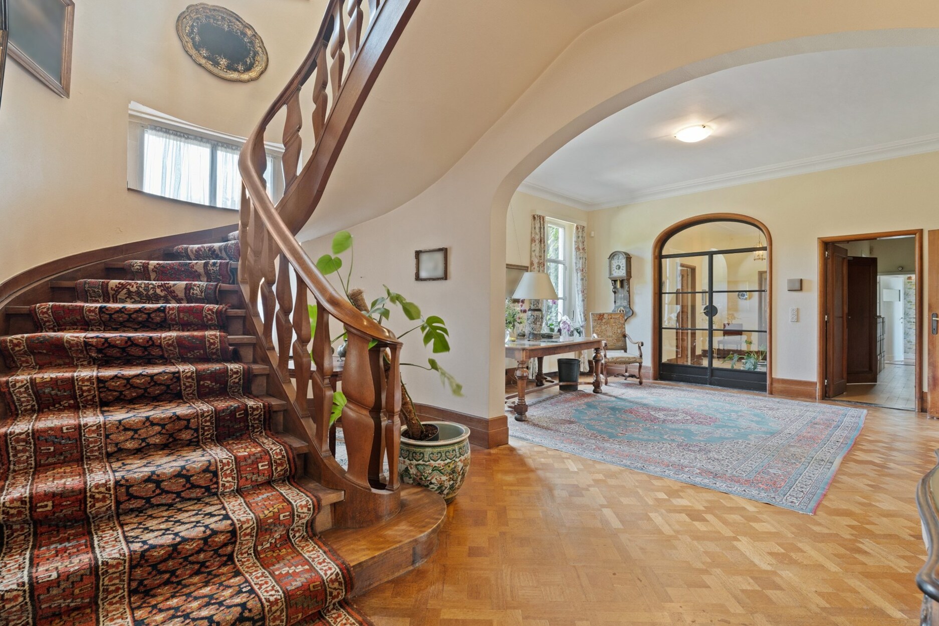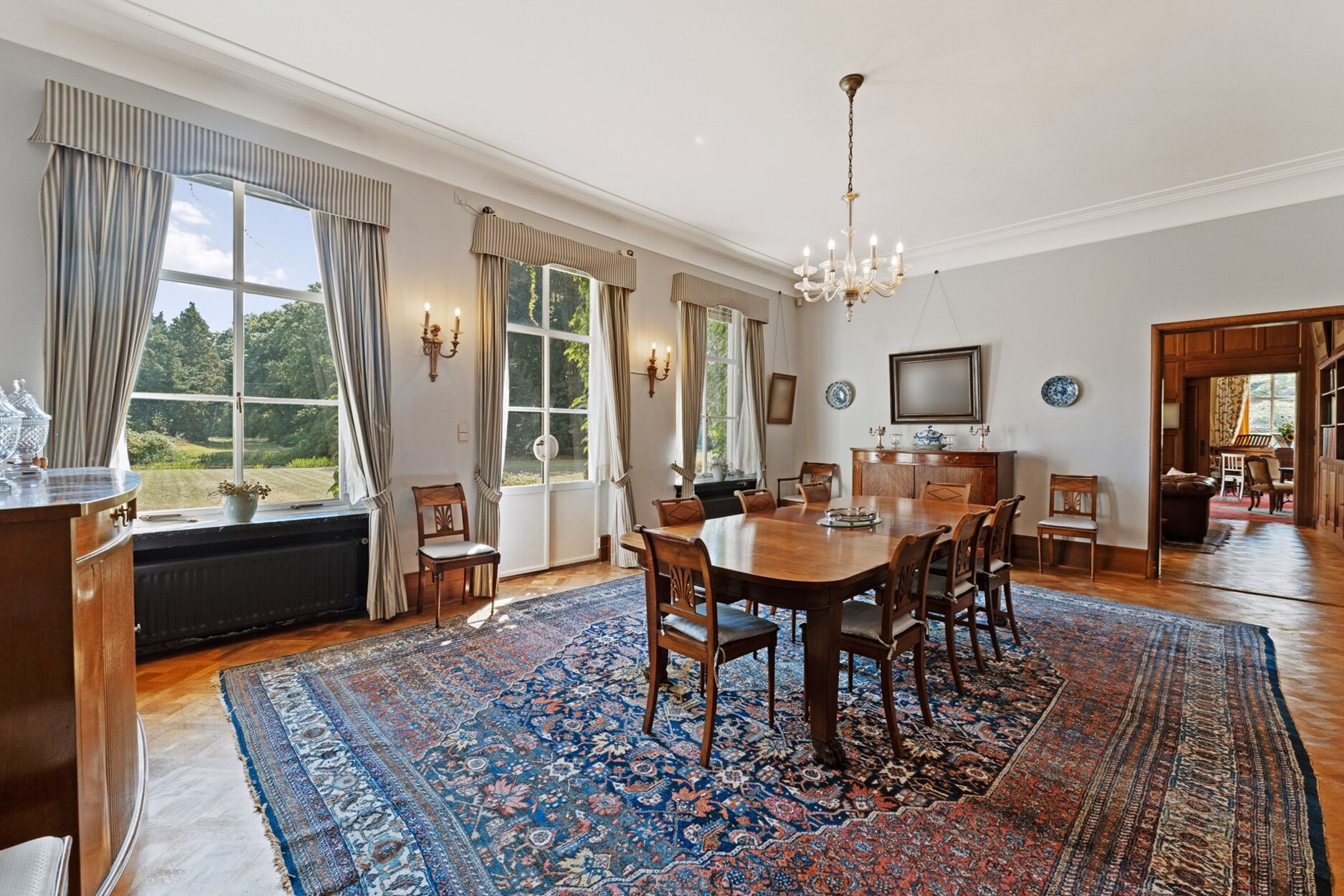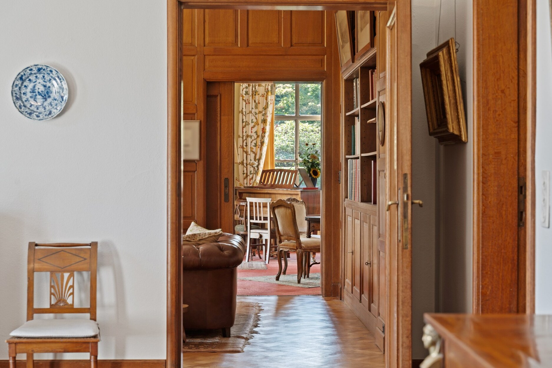 Het hart van het domein wordt gevormd door de prestigieuze villa. Een statige inkomhal leidt naar ruime ontvangstruimtes, waar hoogwaardige materialen zoals authentiek parket en sierlijke afwerkingen warmte en karakter brengen. De eetkamer met hoge plafonds en brede deuren, de prachtige bibliotheek met open haard en ingemaakte kasten, en het royale salon met meerdere zithoeken vormen samen een setting die zowel stijlvol als functioneel is.