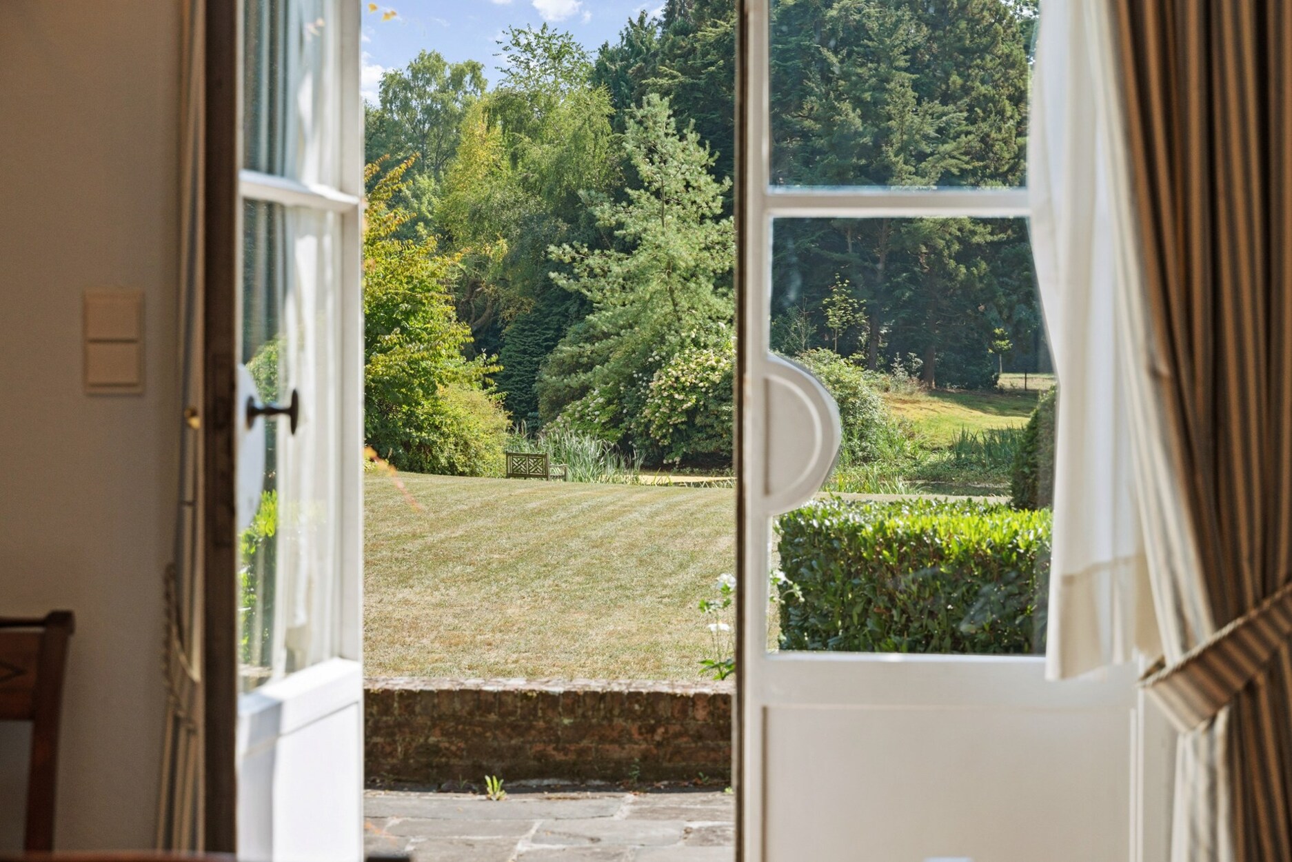 De omgeving van de villa is adembenemend. De vijver, Franse tuin, eeuwenoude bomen en uitgestrekte weilanden creëren een sfeer van rust en harmonie.