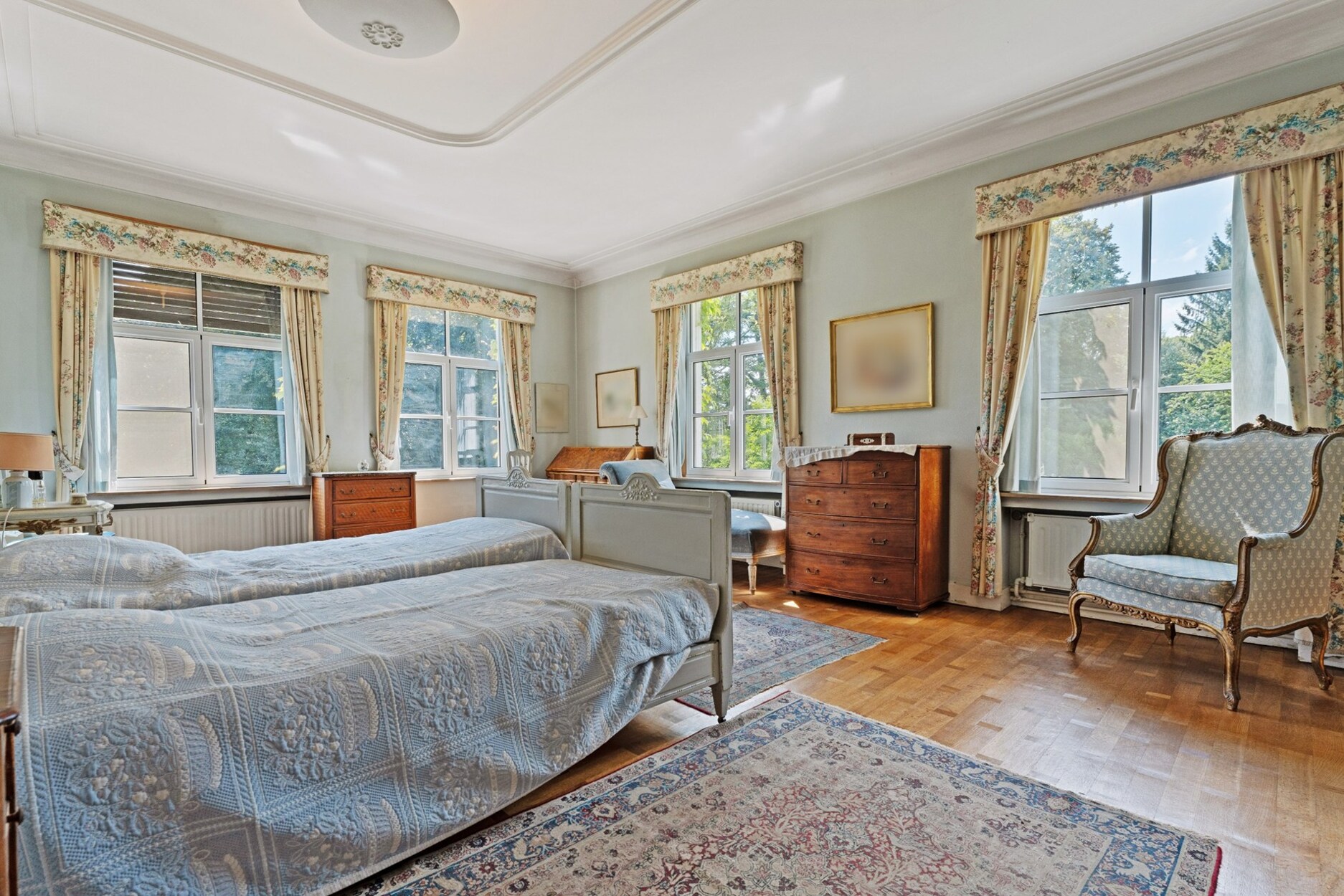 Op de eerste verdieping bevinden zich vier ruime slaapkamers, elk met verfijnde details en en-suite badkamers. Eén kamer beschikt bovendien over een open haard en balkon. Aanvullend zijn er drie kinderkamers en een hobbyruimte, eveneens bereikbaar via een buitentrap. De zolderverdieping biedt bijkomende kamers; logeerruimtes, personeelsvertrekken of bergruimtes.