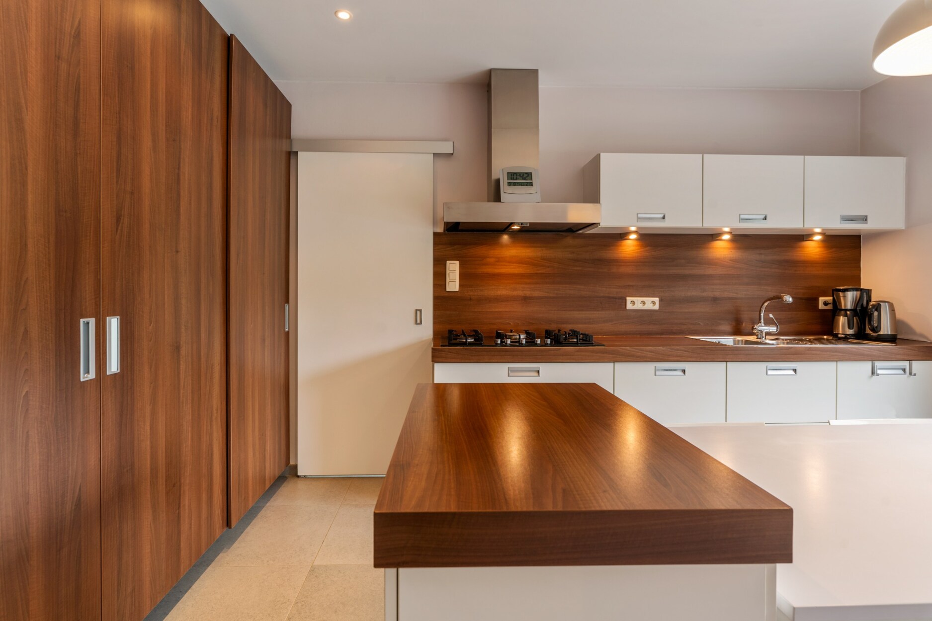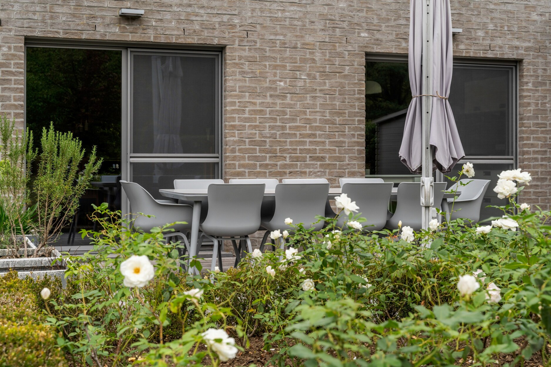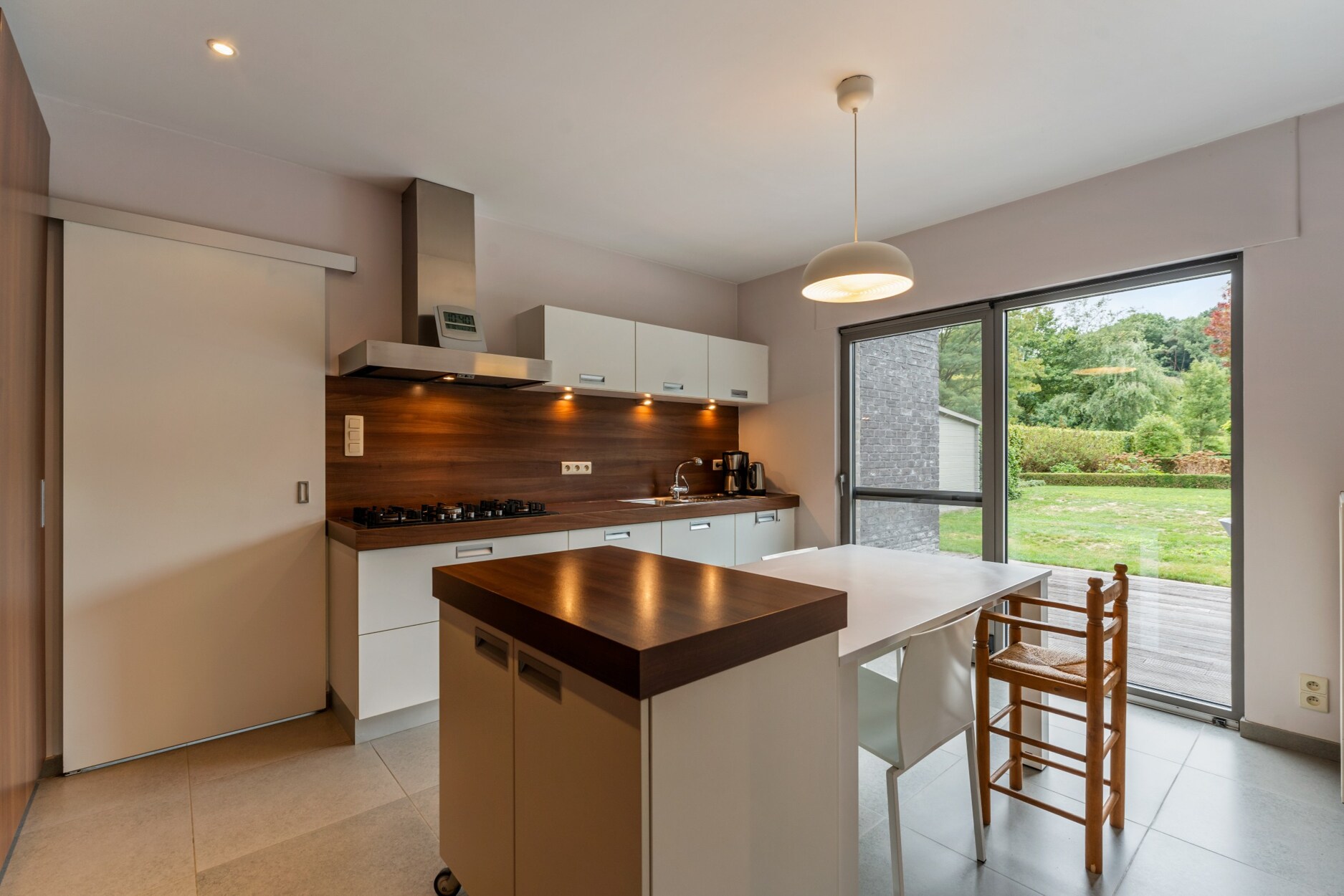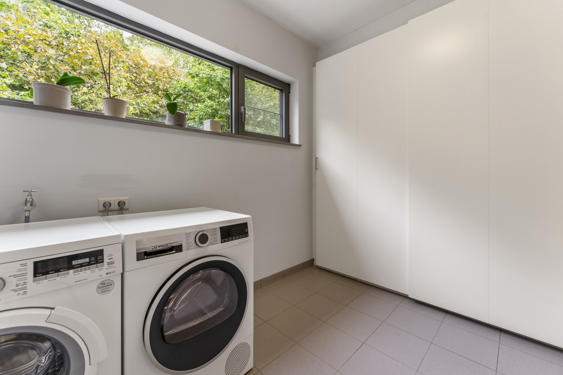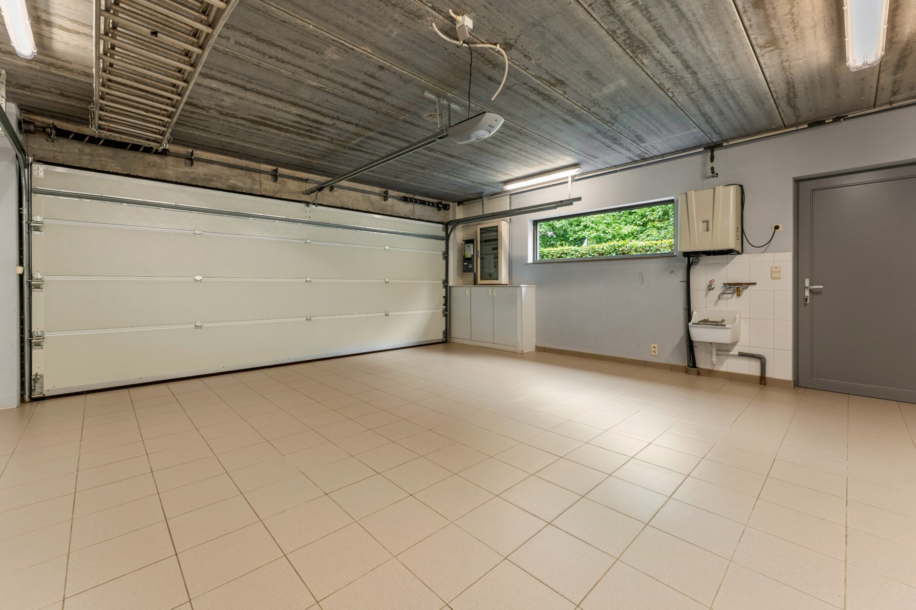 U betreedt de woning via de lichtrijke inkomhal met gastentoilet. De hal geeft toegang tot de zeer ruime en lichte woonruimte. Deze omvat een eethoek, zithoek en bureauruimte met hoog plafond dat ruimtelijk effect creëert. De bureauruimte zit verweven in de leefruimtes, afgescheiden door een muurtje. De bureau is vindingrijk verborgen in de inbouwkast. De keuken bevindt zich links langs de woonruimte en is voorzien van alle hedendaags comfort en gaskookplaat. Via de grote schuiframen in woonkamer en keuken kan u het zuid gerichte terras betreden. Na de keuken volgt de wasplaats met berging en inpandige garage met voldoende ruime voor 2 wagens. Vanuit de garage is er toegang tot de kelder. Gelijkvloers is er vervolgens ook een badkamer met douche en wastafel.