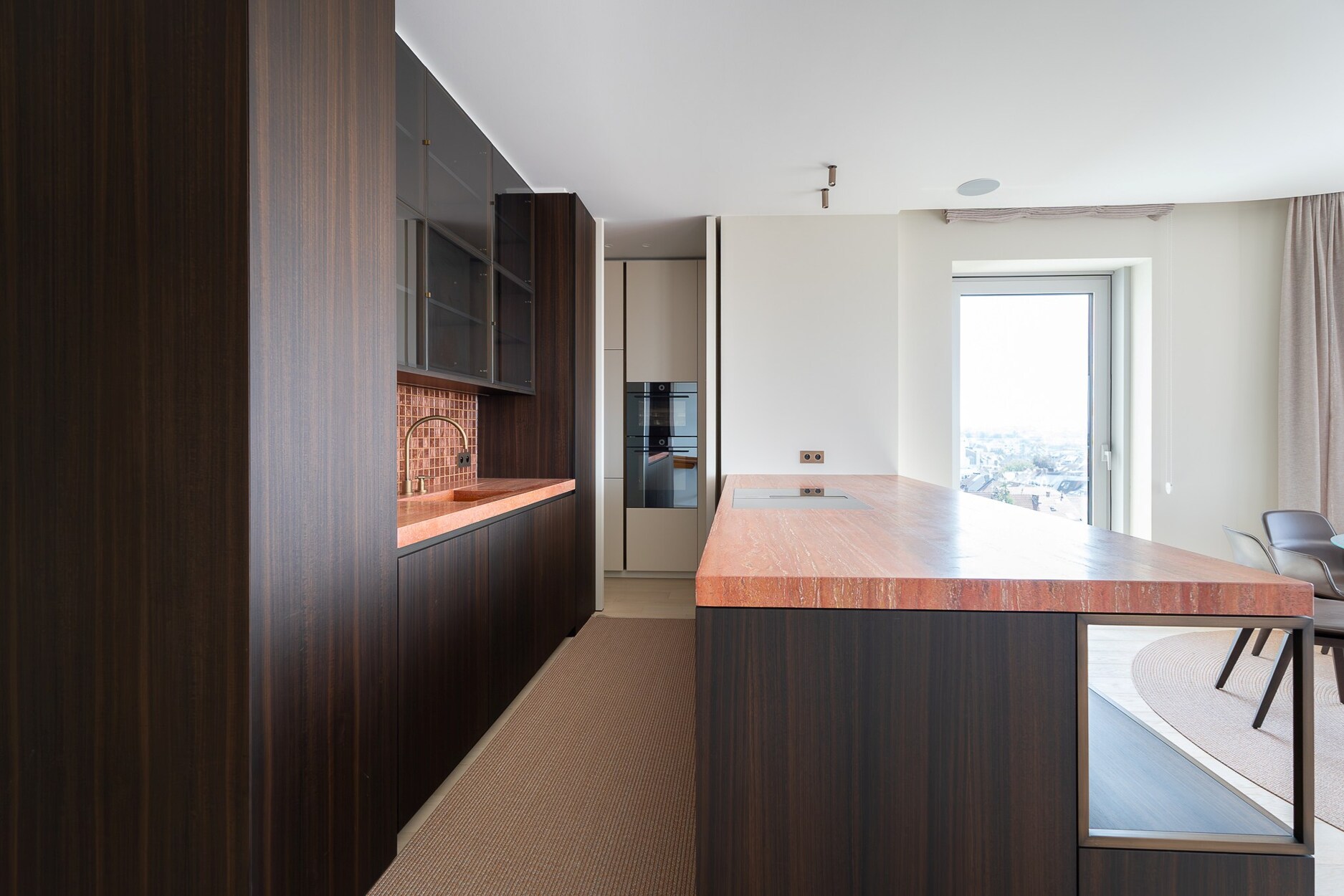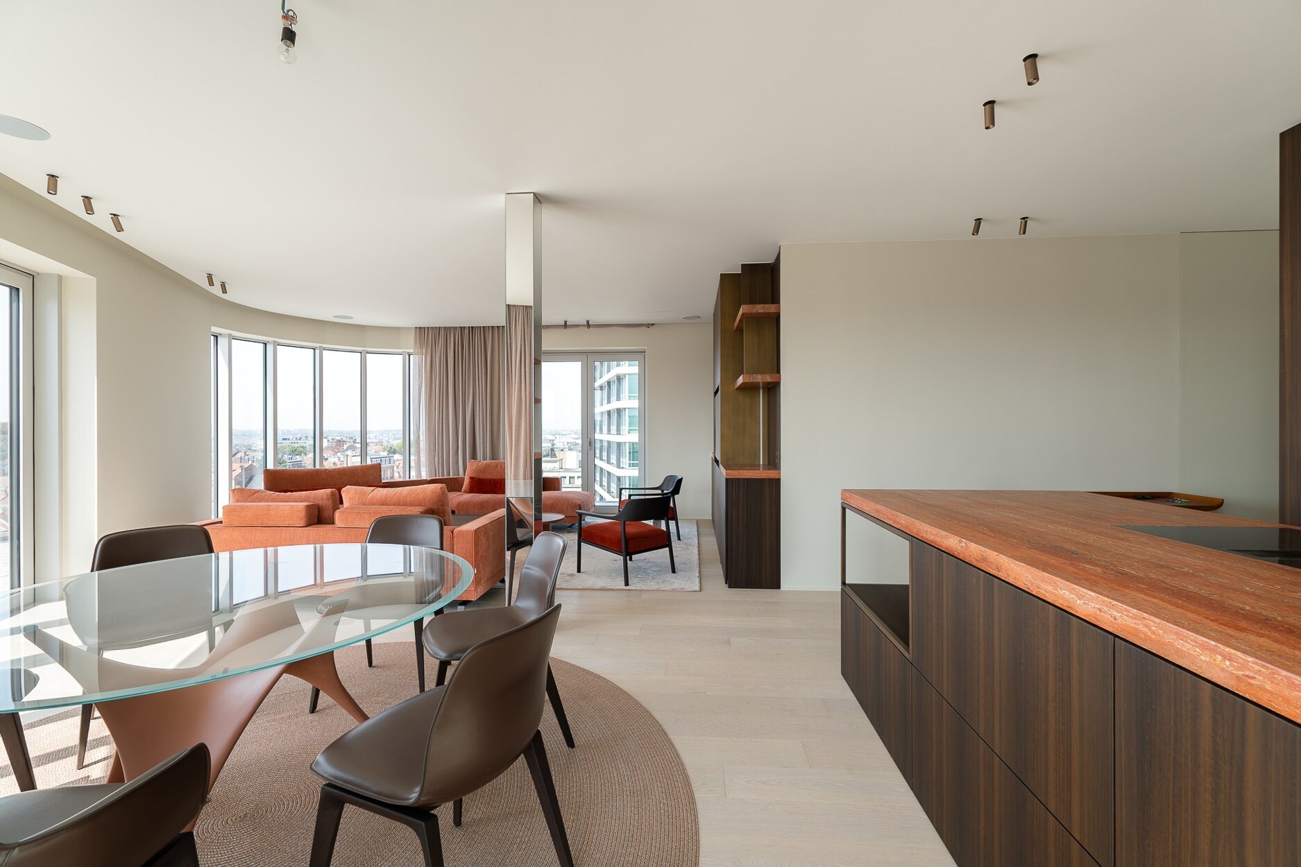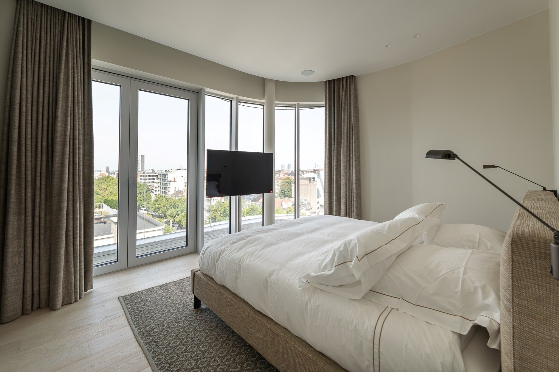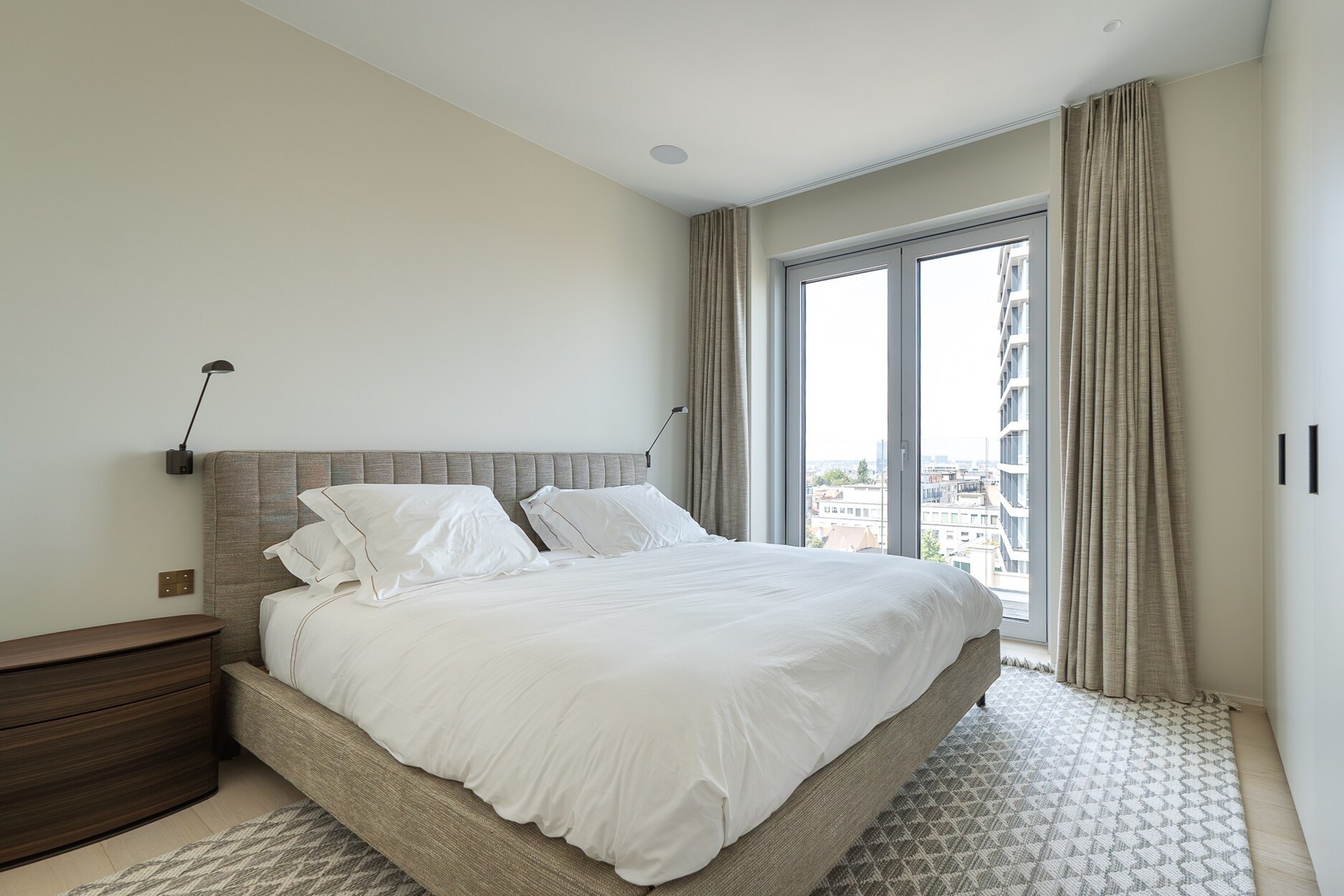 De elegante inkomhal leidt naar een lichtrijke leefruimte met grote raampartijen die toegang geven tot het terras met open zicht over Brussel. De open keuken, afgewerkt met hoogwaardige materialen, sluit naadloos aan bij de leefruimte. Het nachtgedeelte omvat een master suite met eigen douchekamer, twee bijkomende slaapkamers en een aparte badkamer. De afwerking getuigt van verfijning: ingewerkte schrijnwerken, natuurlijke parketvloeren en volledige domotica.