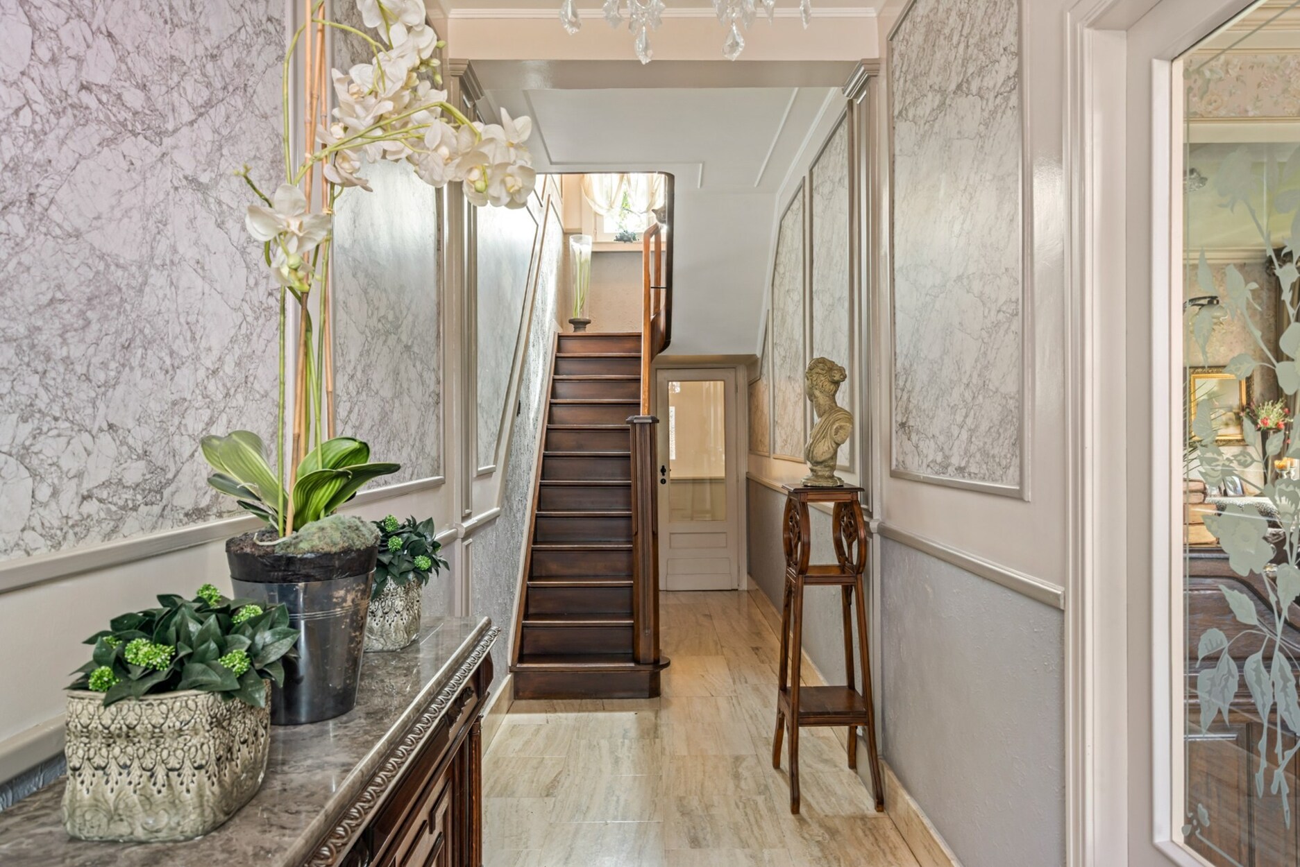 De woning is zowel via een aparte voordeur als via de handelszaak bereikbaar. Deze bestaat uit een zeer charmante inkomhal met hoge plafonds, houten trap, moulures, etc. De keuken is apart voorzien en geeft via een dubbele deur toegang tot de charmante woonkamer met open haard en glas in lood ramen. op de gelijkvloerse verdieping bevindt zich ook de badkamer met dubbele lavabo en ligbad, apart toilet, technische ruimte en toegang tot de kelder.