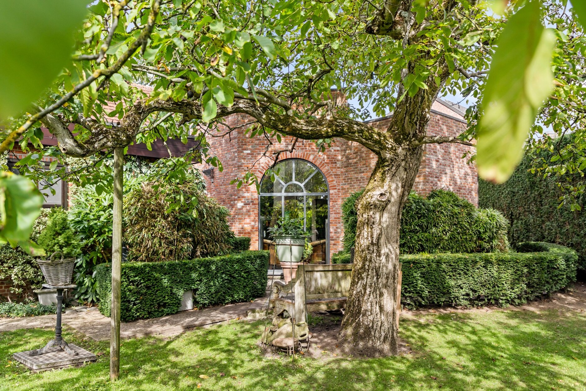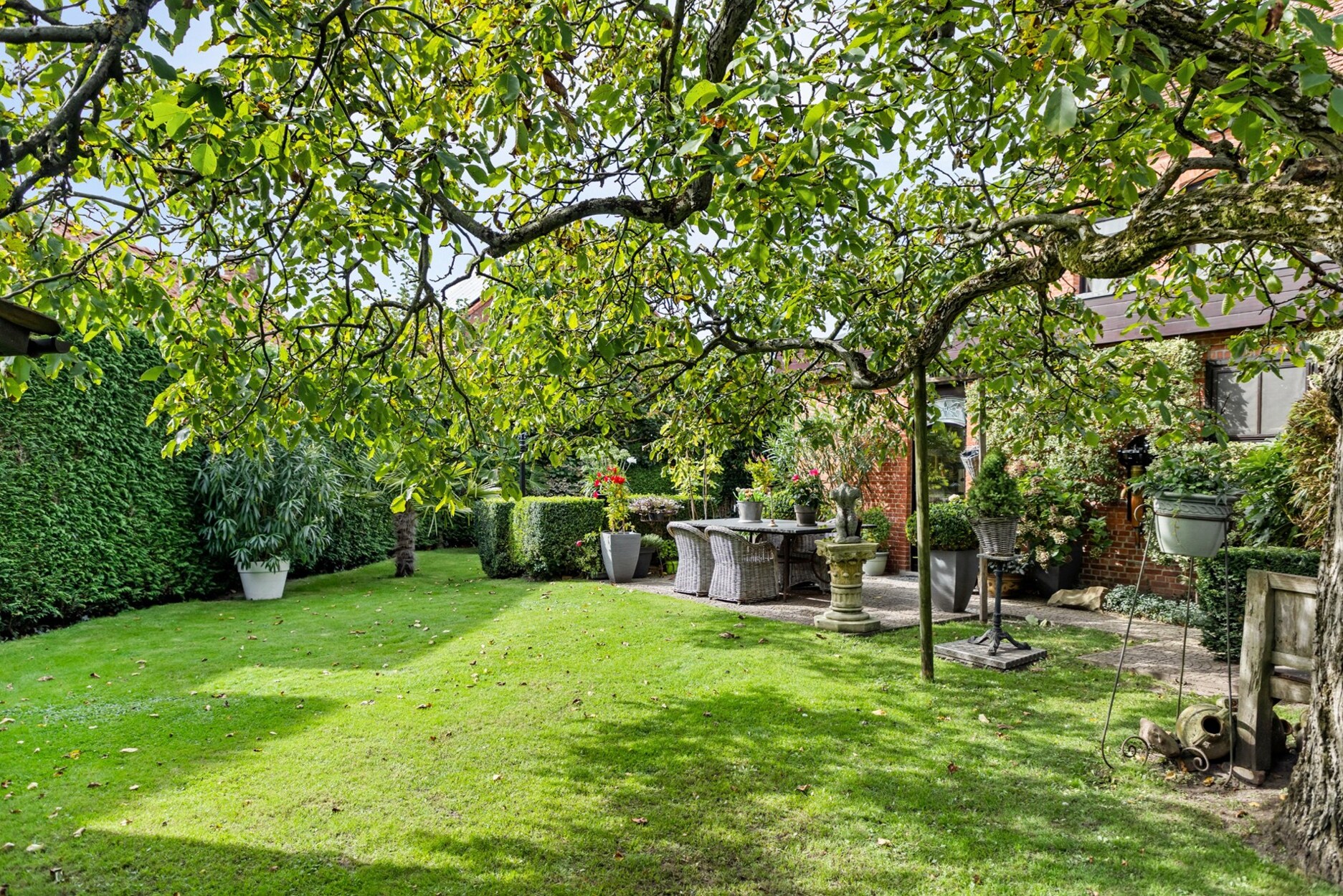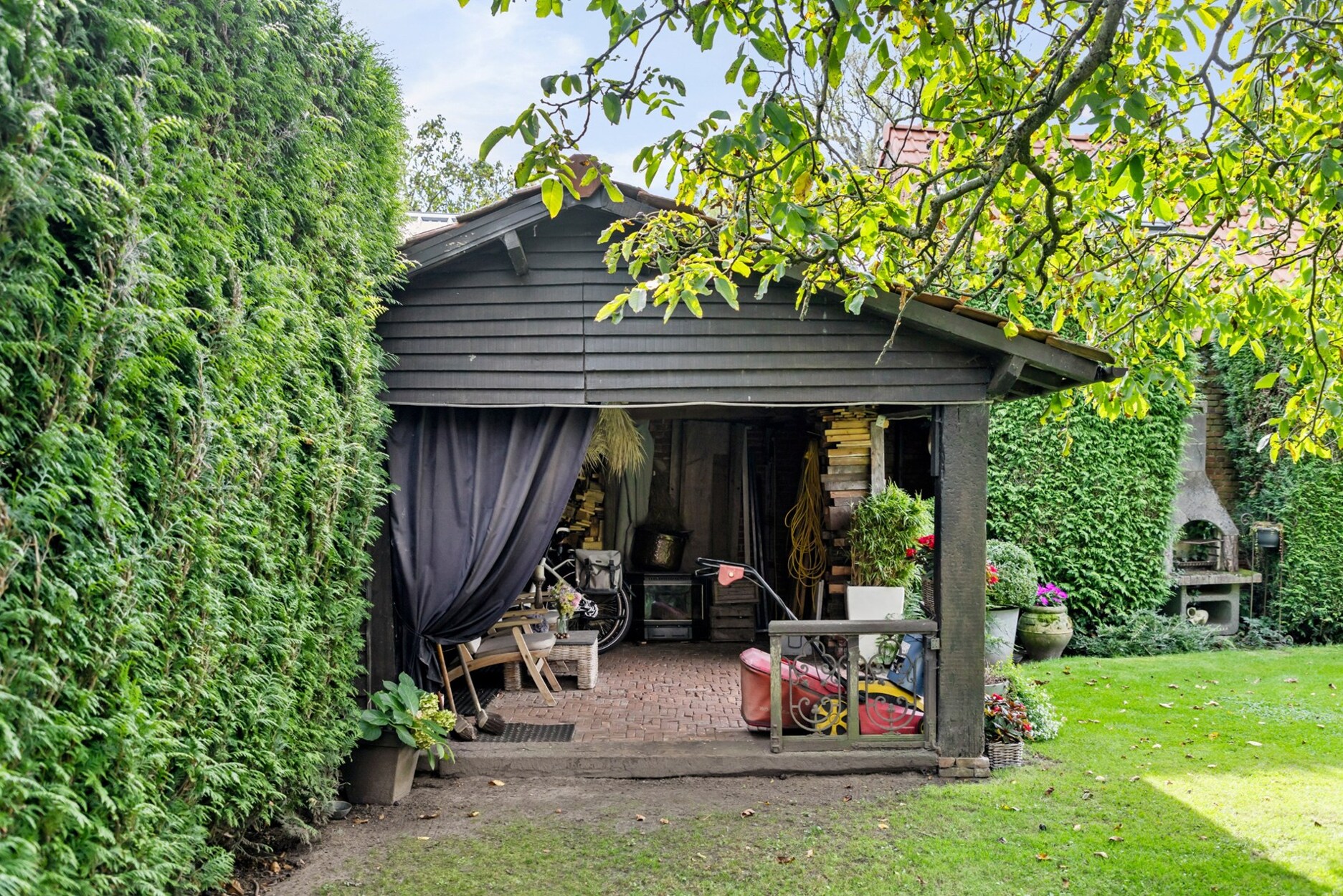 De tuin is fraai aangeplant en voorzien van een overdekt bijgebouw/terras. Deze is zuidoost georiënteerd waardoor het hier zalig genieten is van de zon en volledig omheind.