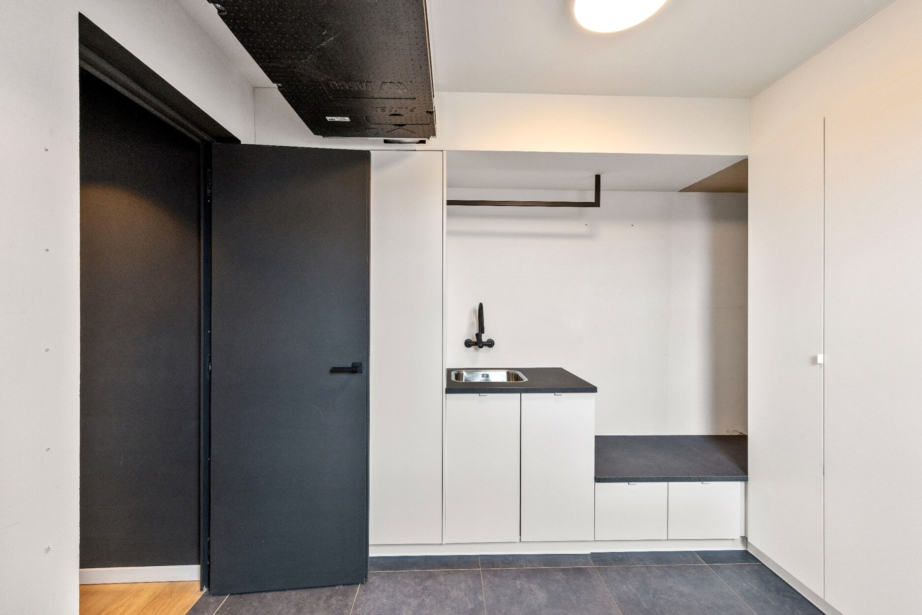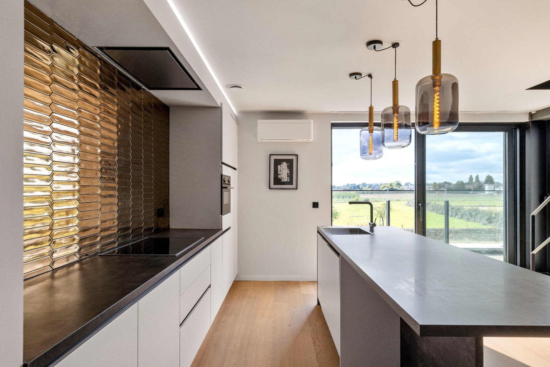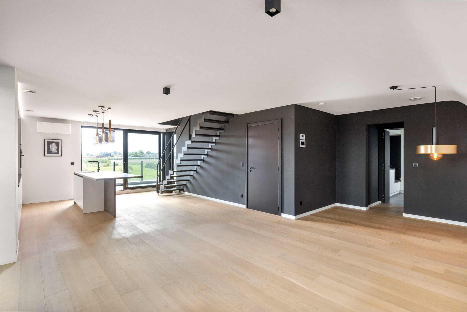 Op de benedenverdieping hebben we een open leefruimte met open view en directe toegang tot het terras dat zich strekt over de gehele breedte van het appartement. De compleet uitgeruste keuken met eiland bevindt zich aan het terras en ligt ook centraal in de leefruimte. Aan de andere zijde van de mooie en ruime leefruimte ligt het gastentoilet en de super praktische op maat gemaakte wasplaats/berging.
