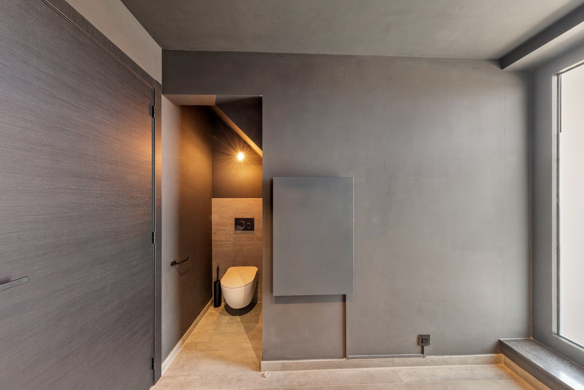 De zwart stalen trap in de leefruimte brengt ons naar de lichtrijke bovenverdieping met 3 slaapkamers en ruime en uiterst comfortabele badkamer. De toilet is voorzien in de badkamer.