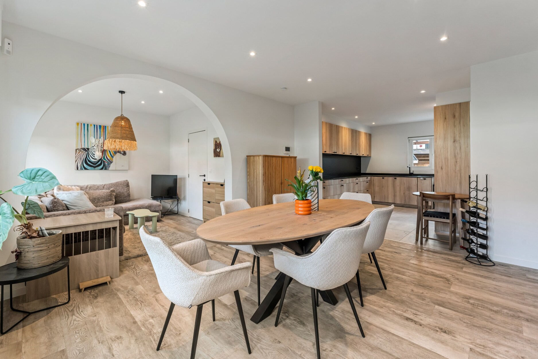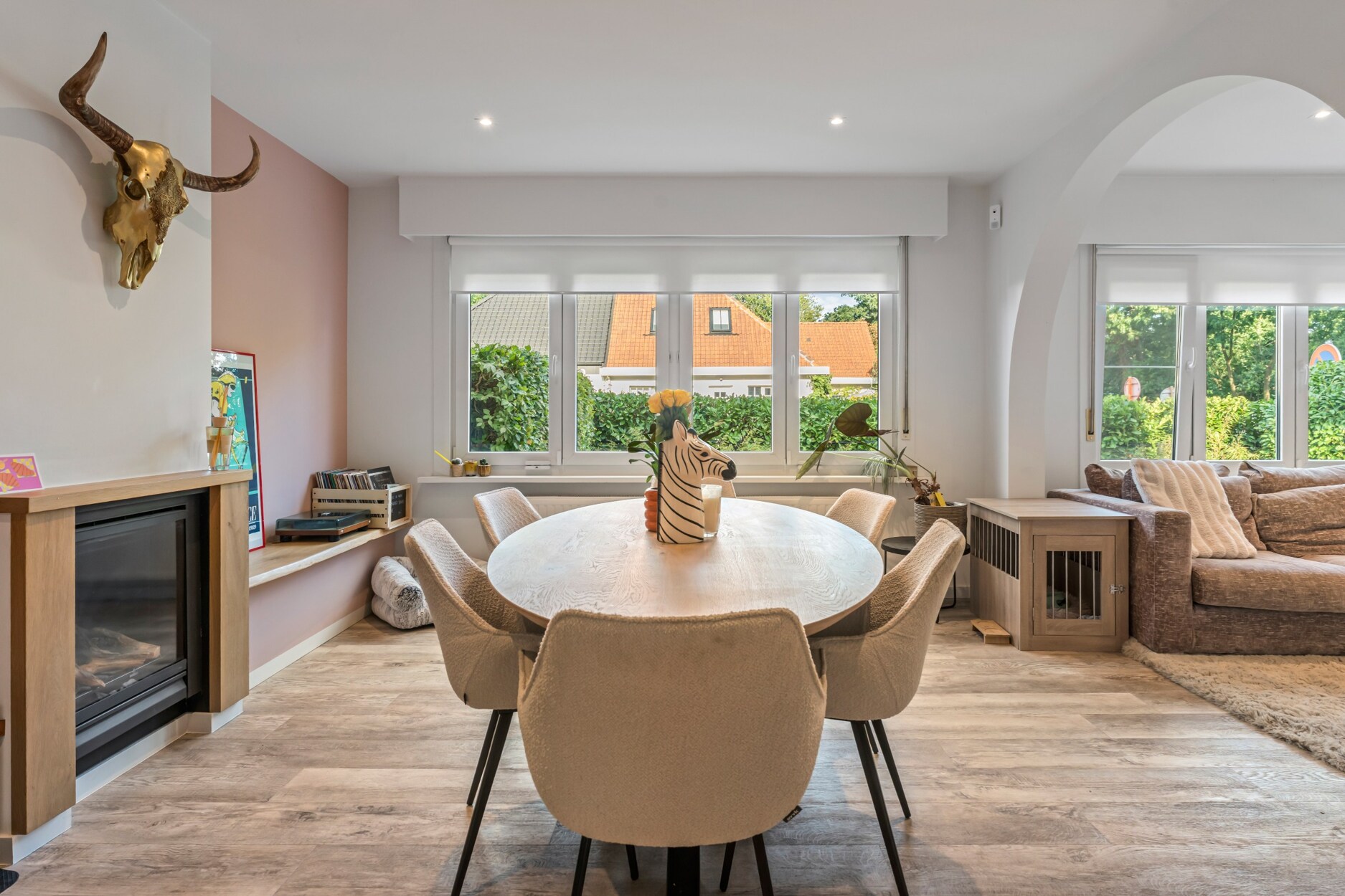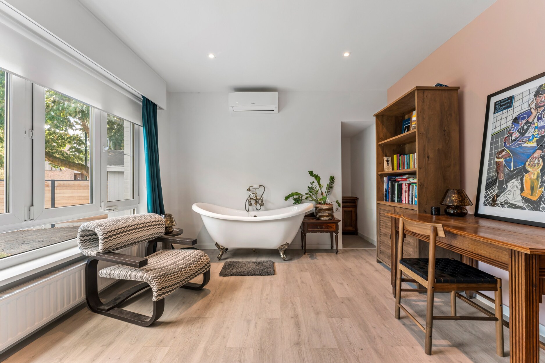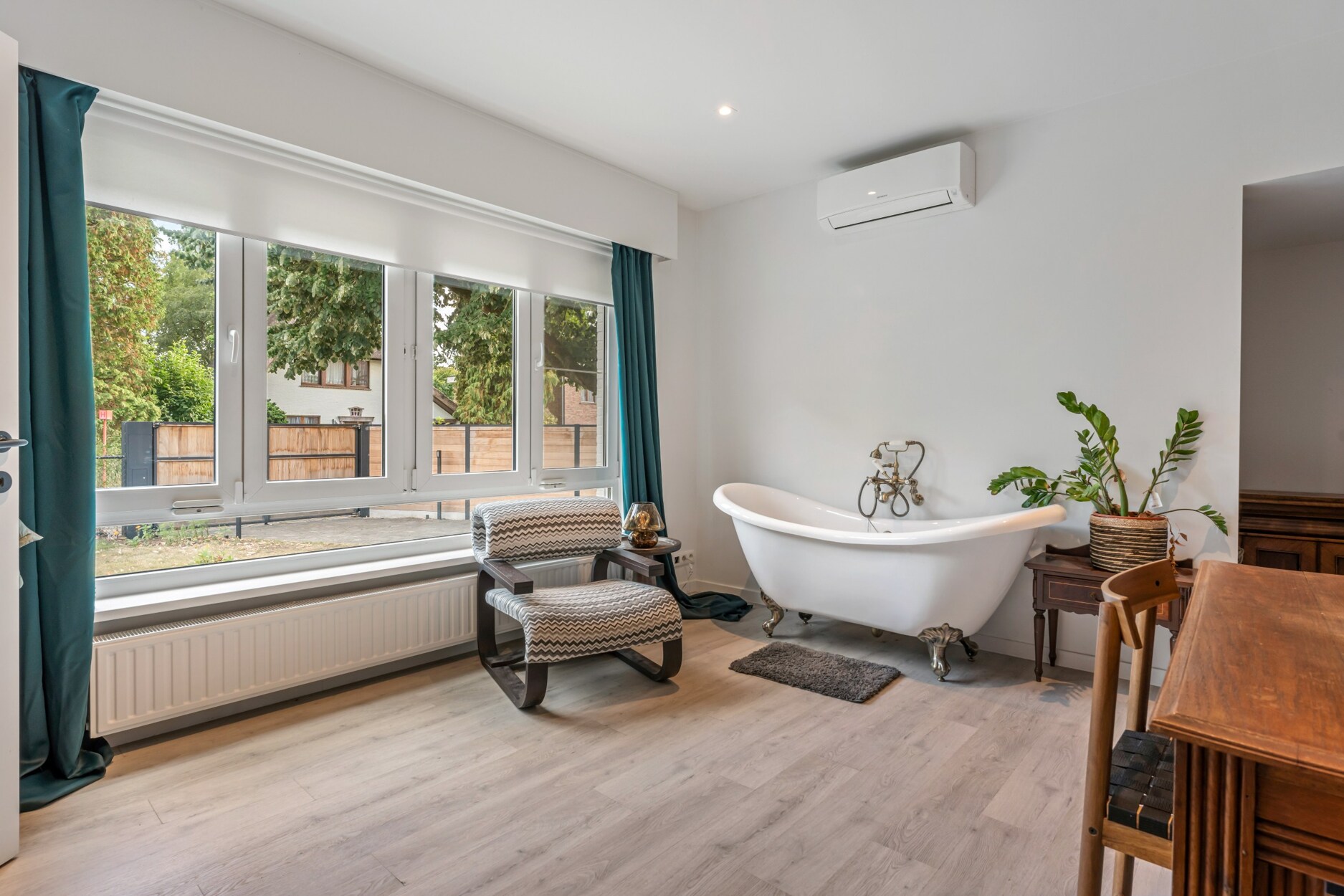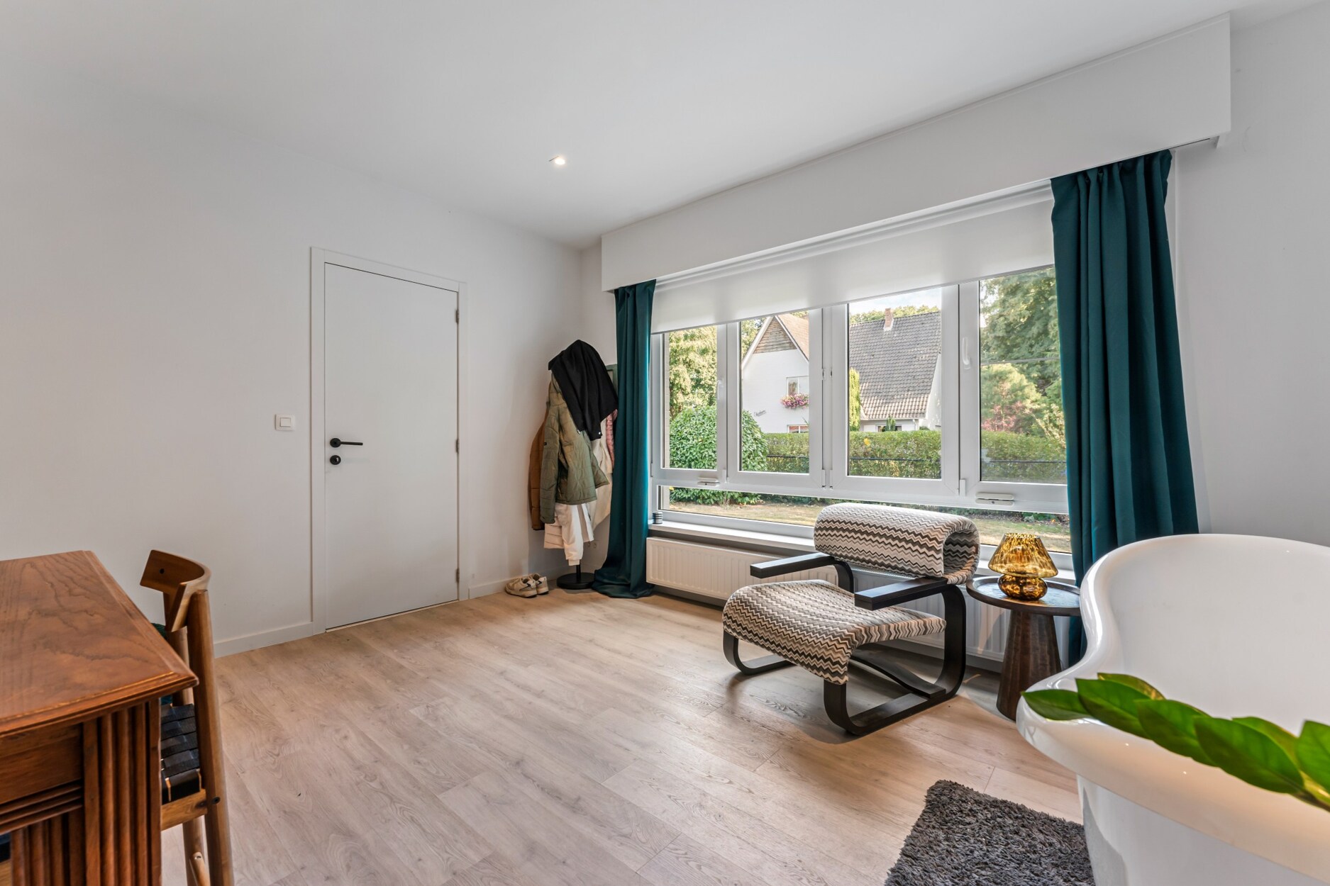 Op het gelijkvloers zorgen de lichte leefruimtes en de moderne open keuken met houtaccenten en zwarte afwerking voor een uitnodigende setting. Een multifunctionele kamer, momenteel ingericht als bureau met bad, biedt extra flexibiliteit als gastenkamer of hobbyruimte.