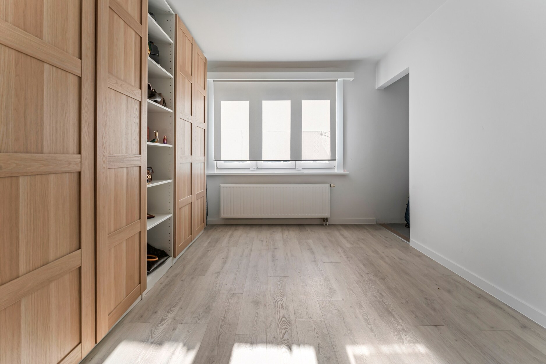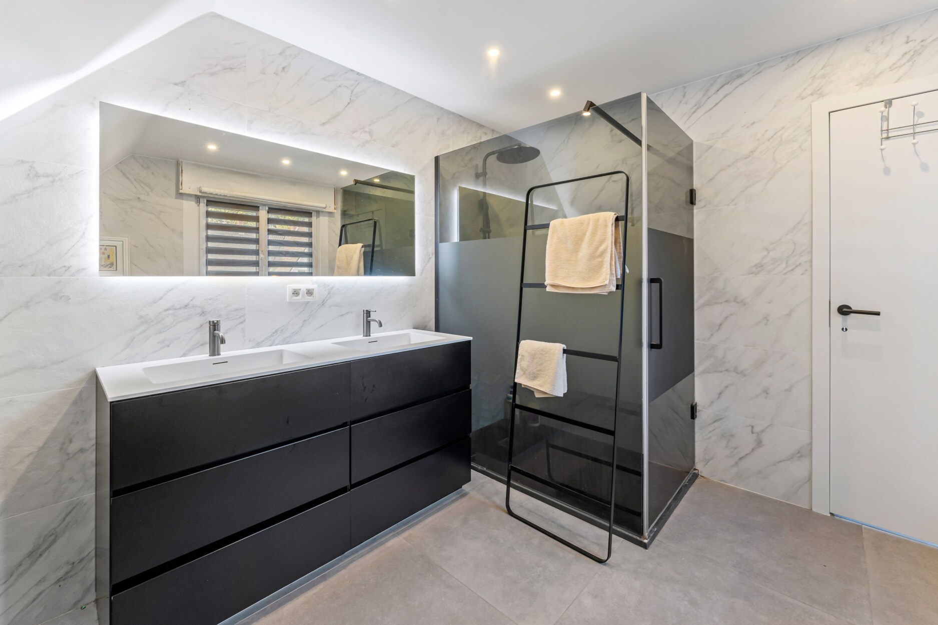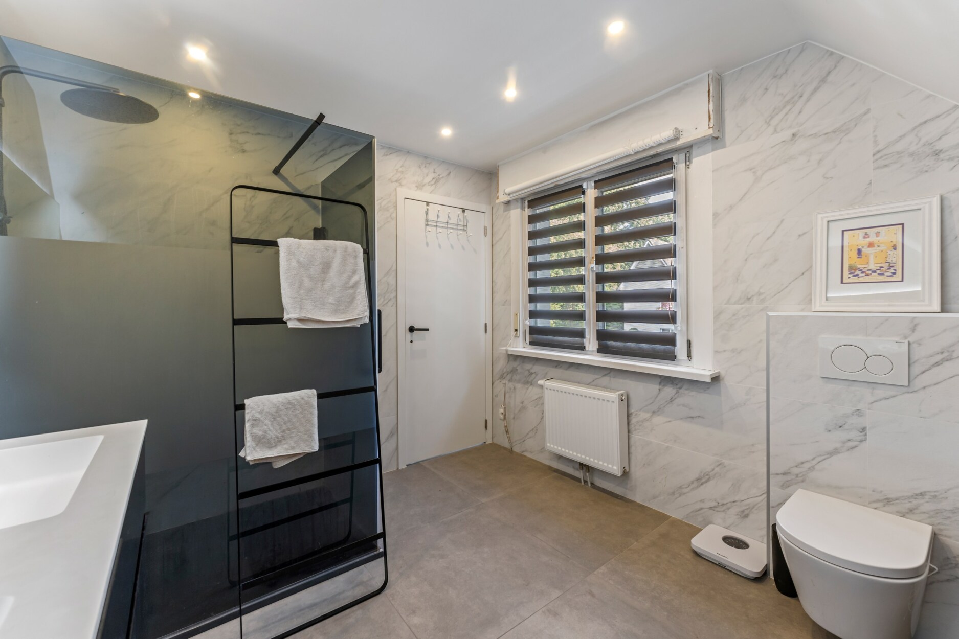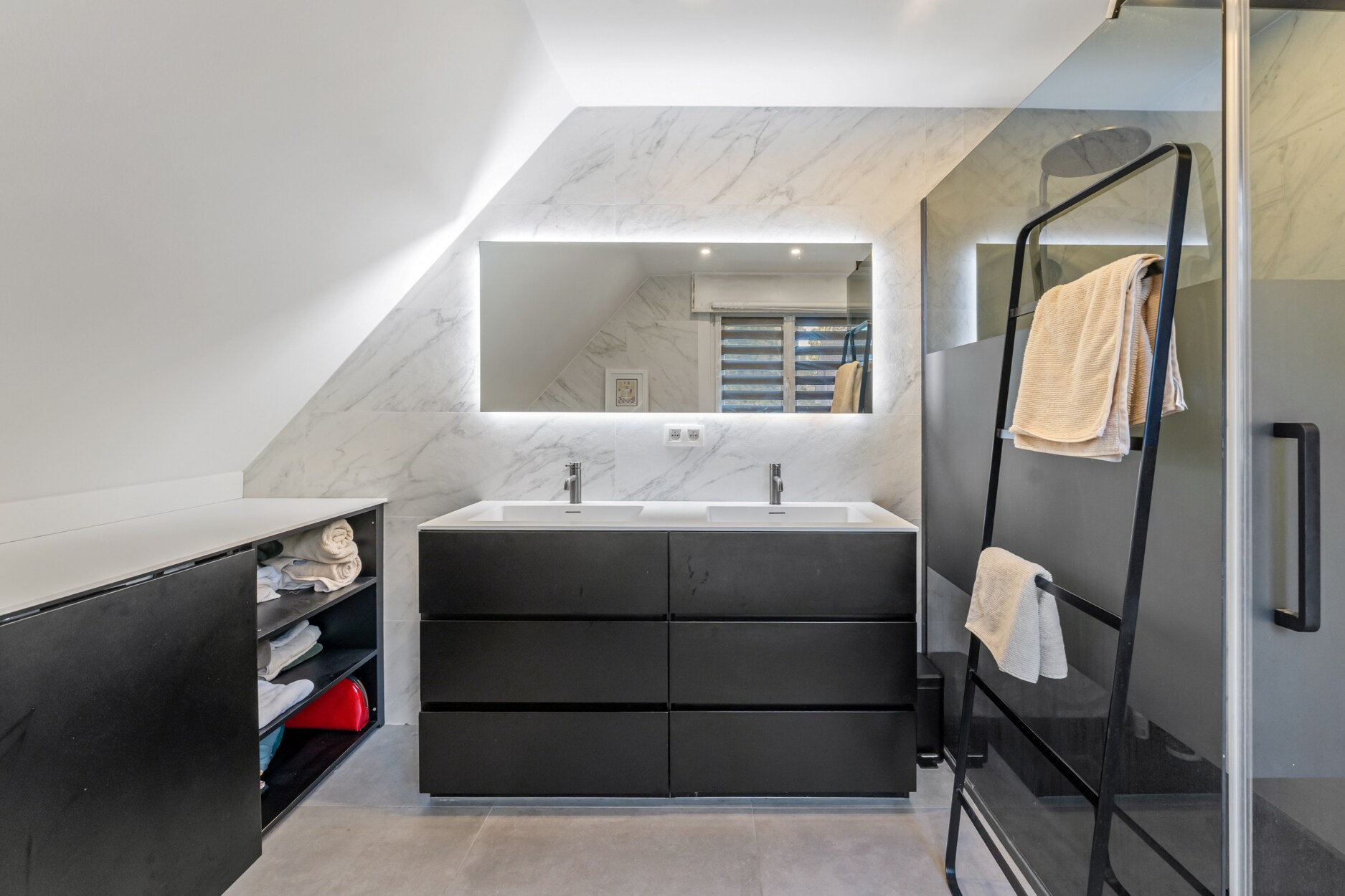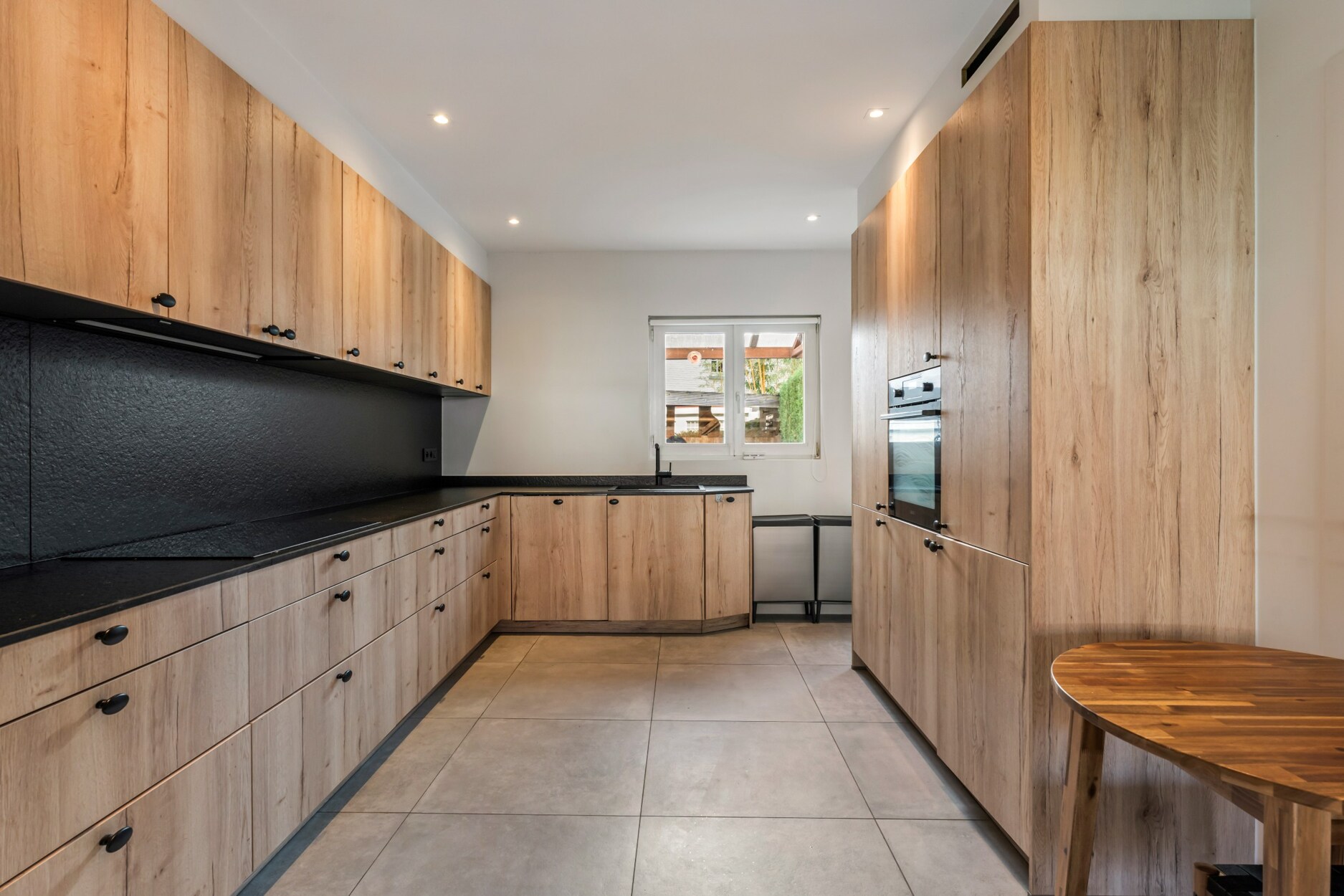 Op het gelijkvloers zorgen de lichte leefruimtes en de moderne open keuken met houtaccenten en zwarte afwerking voor een uitnodigende setting. Een multifunctionele kamer, momenteel ingericht als bureau met bad, biedt extra flexibiliteit als gastenkamer of hobbyruimte.