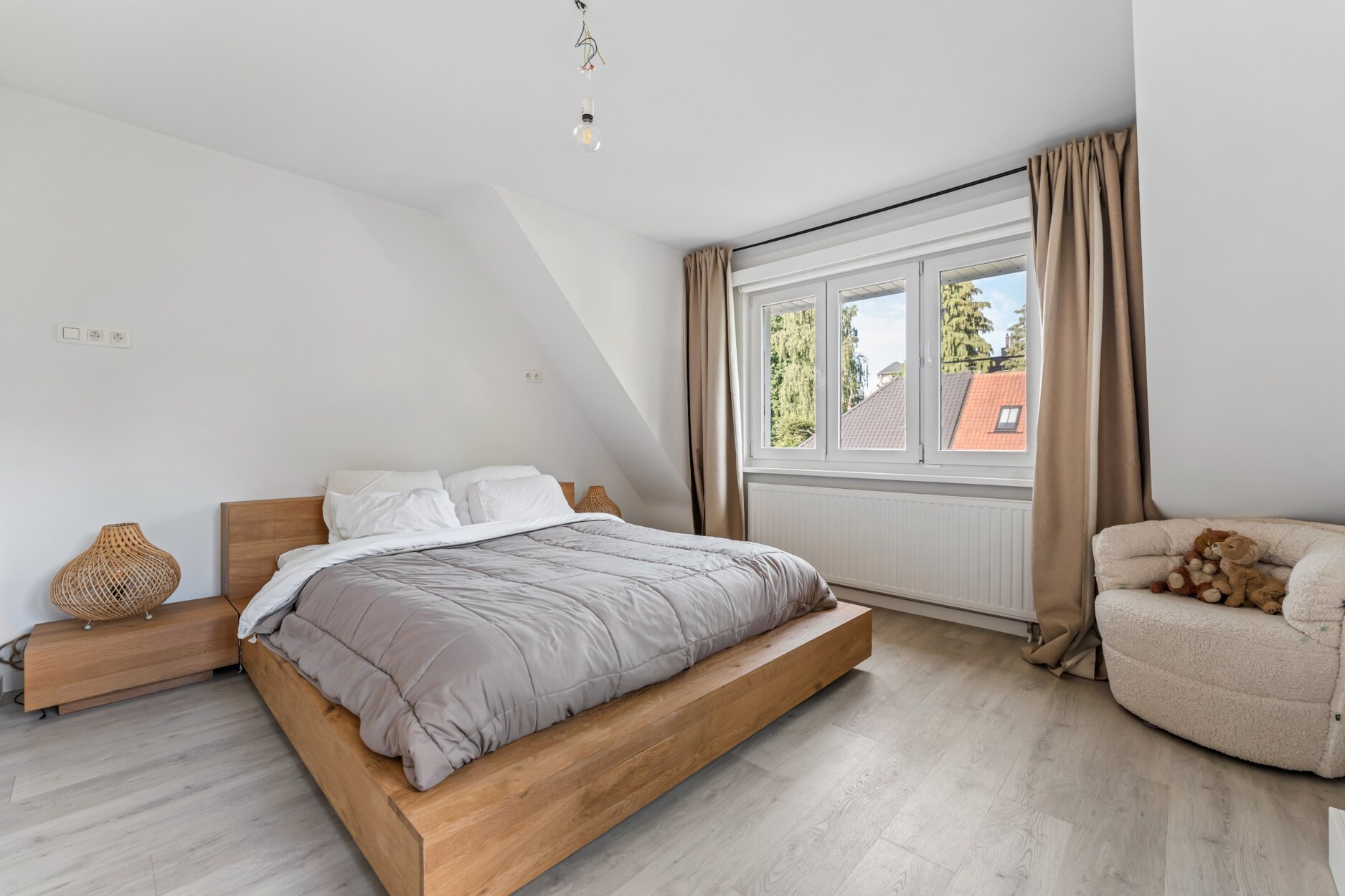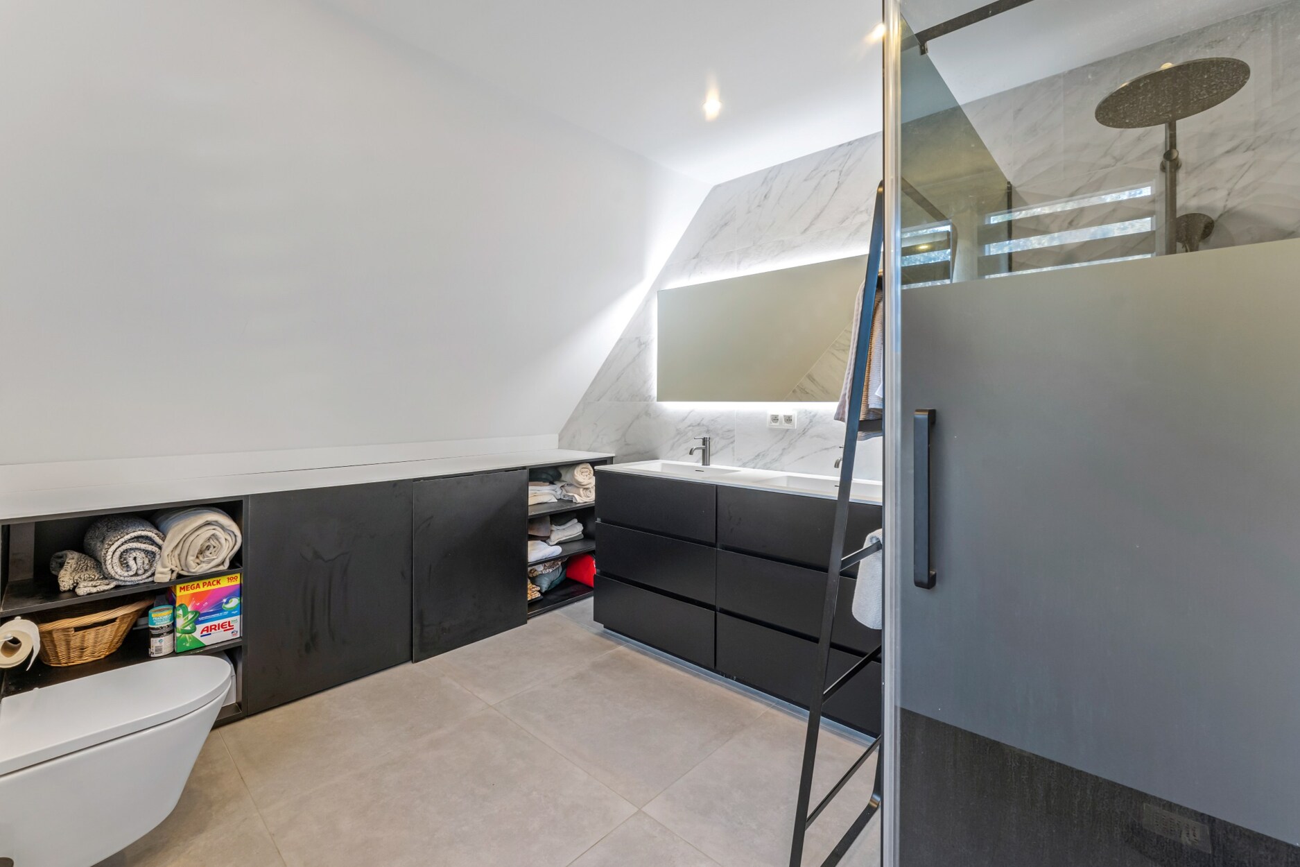 Op de verdieping bevinden zich drie slaapkamers, waarvan één als dressing is ingericht, en een strakke badkamer met inloopdouche, dubbel lavabomeubel en toilet. De kelder van 16 m² biedt extra opbergruimte.