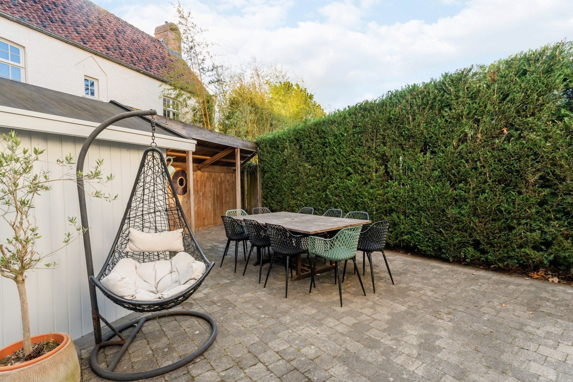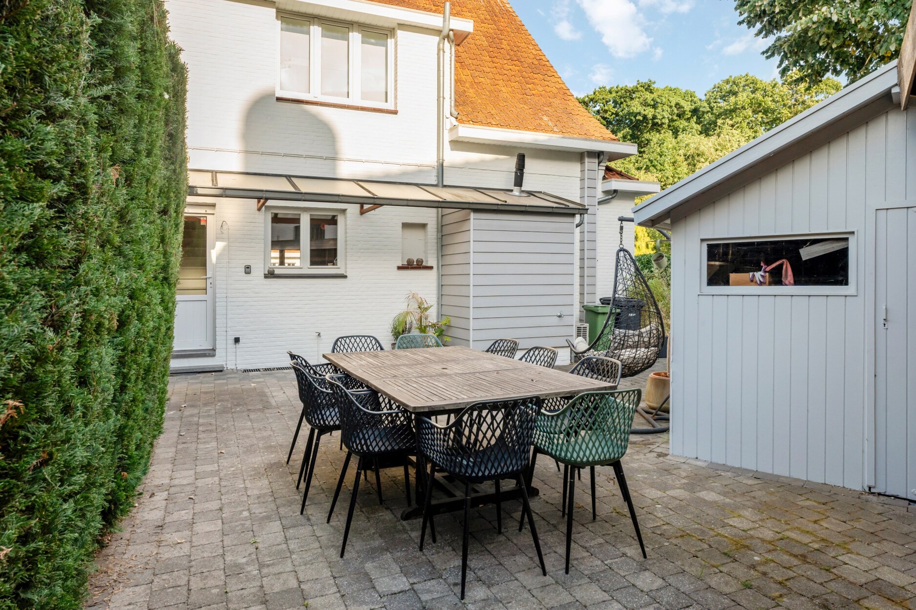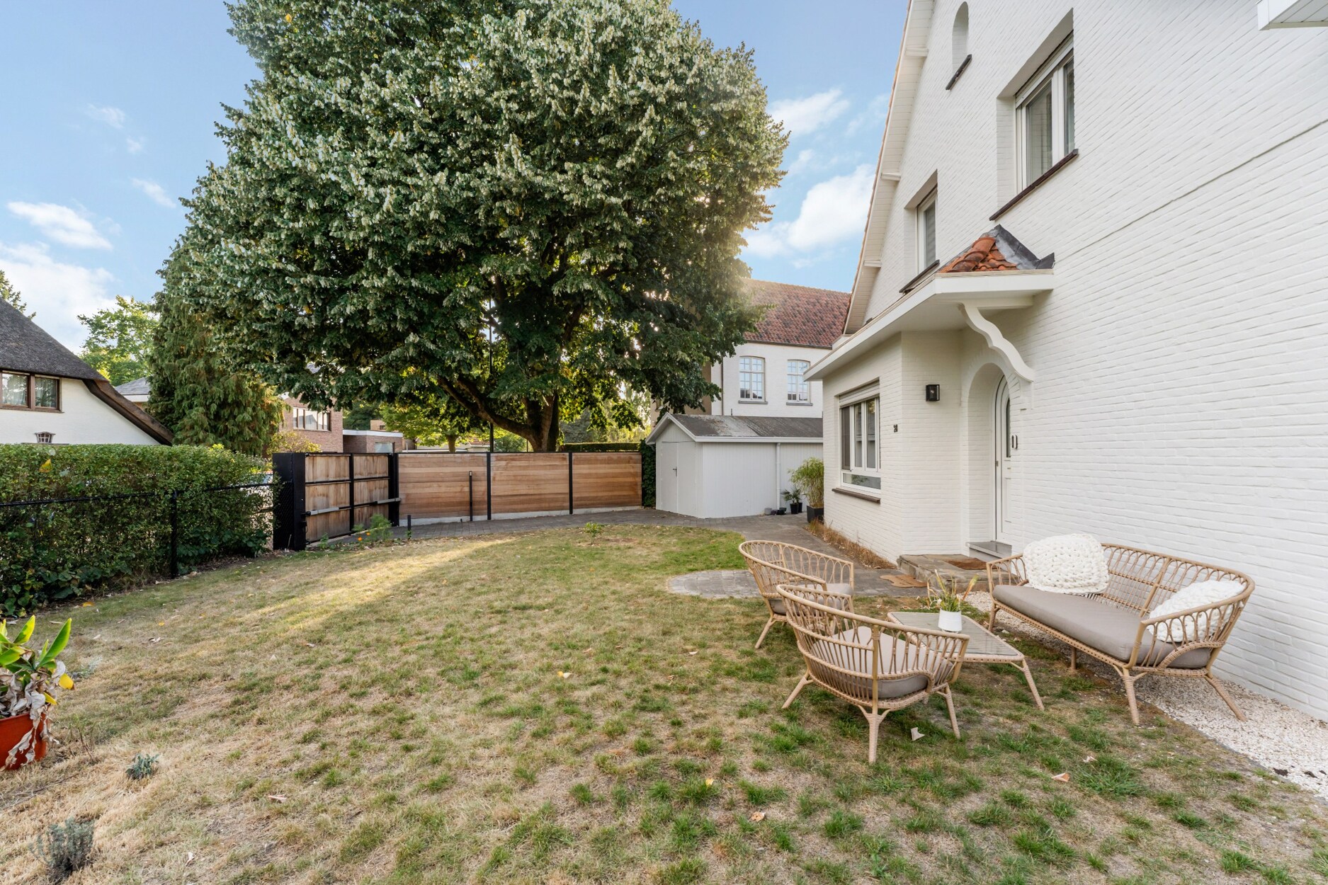 Buiten geniet u van een gezellige voortuin met zithoek, een privacyvolle zijtuin en een ruim terras met overkapping. Een aparte berging biedt ruimte voor fietsen of tuingerief.