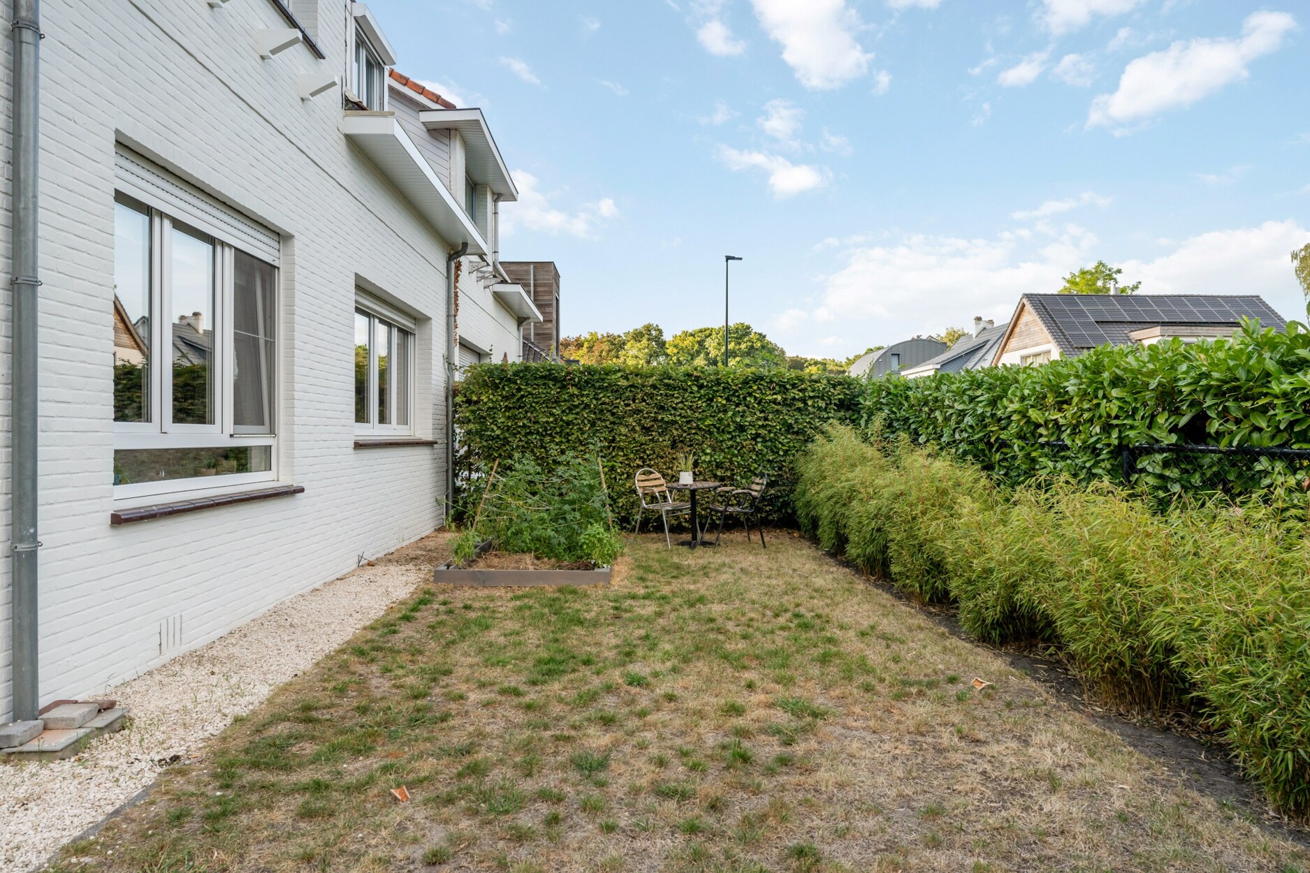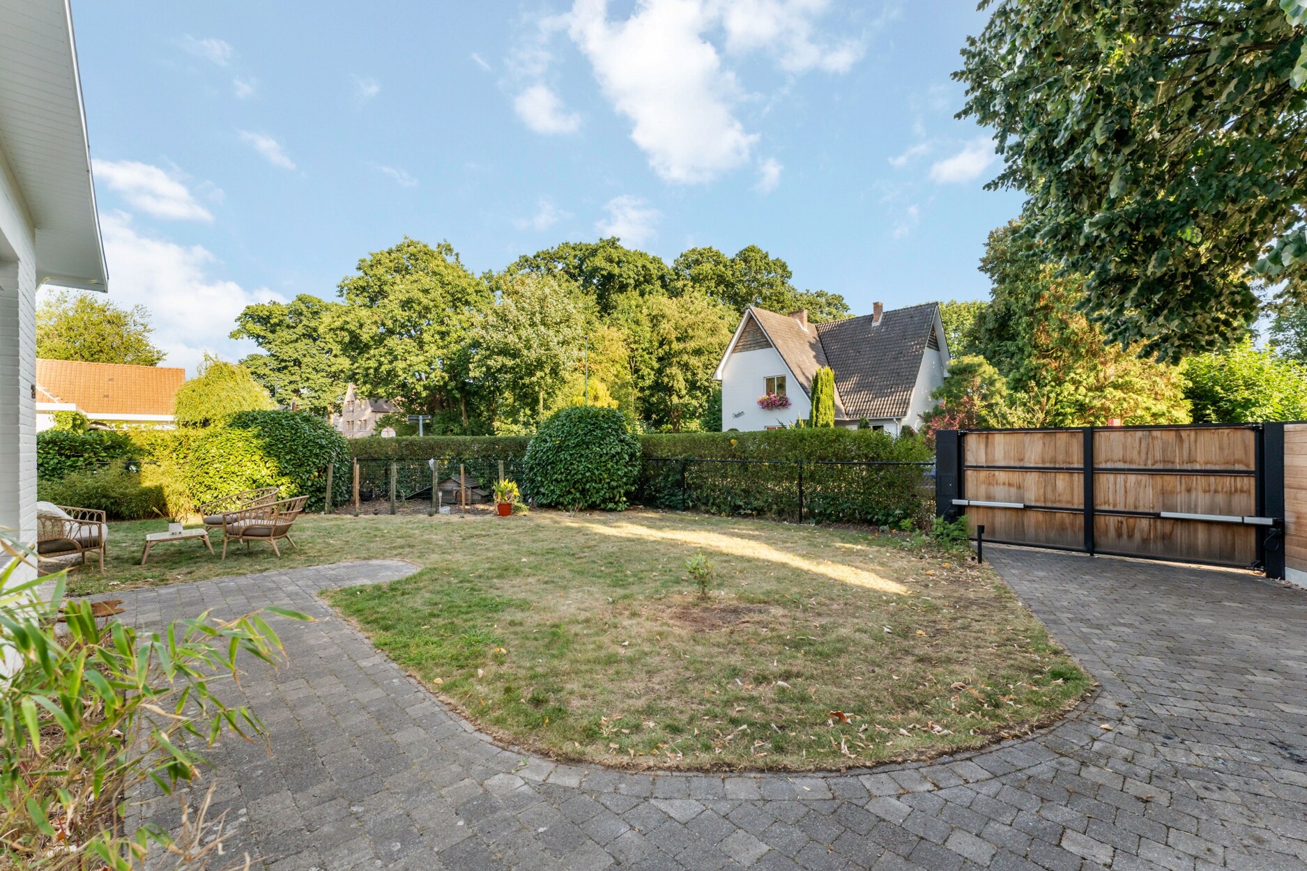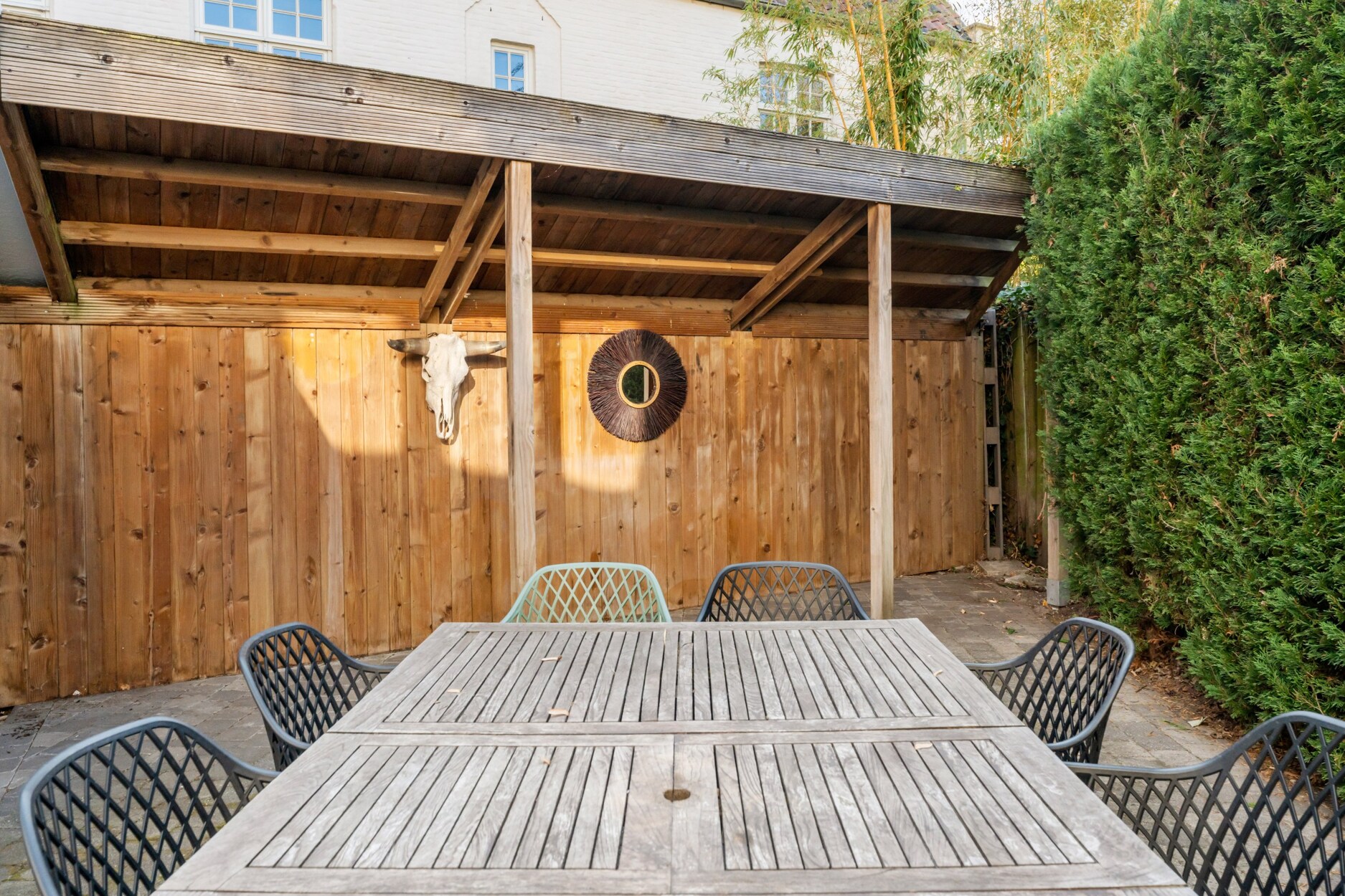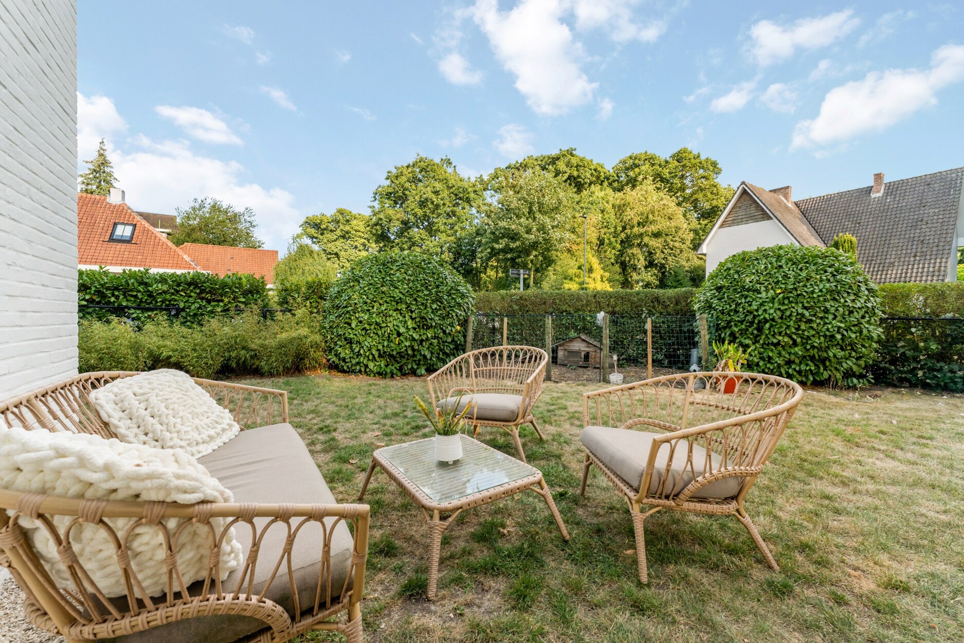 Buiten geniet u van een gezellige voortuin met zithoek, een privacyvolle zijtuin en een ruim terras met overkapping. Een aparte berging biedt ruimte voor fietsen of tuingerief.