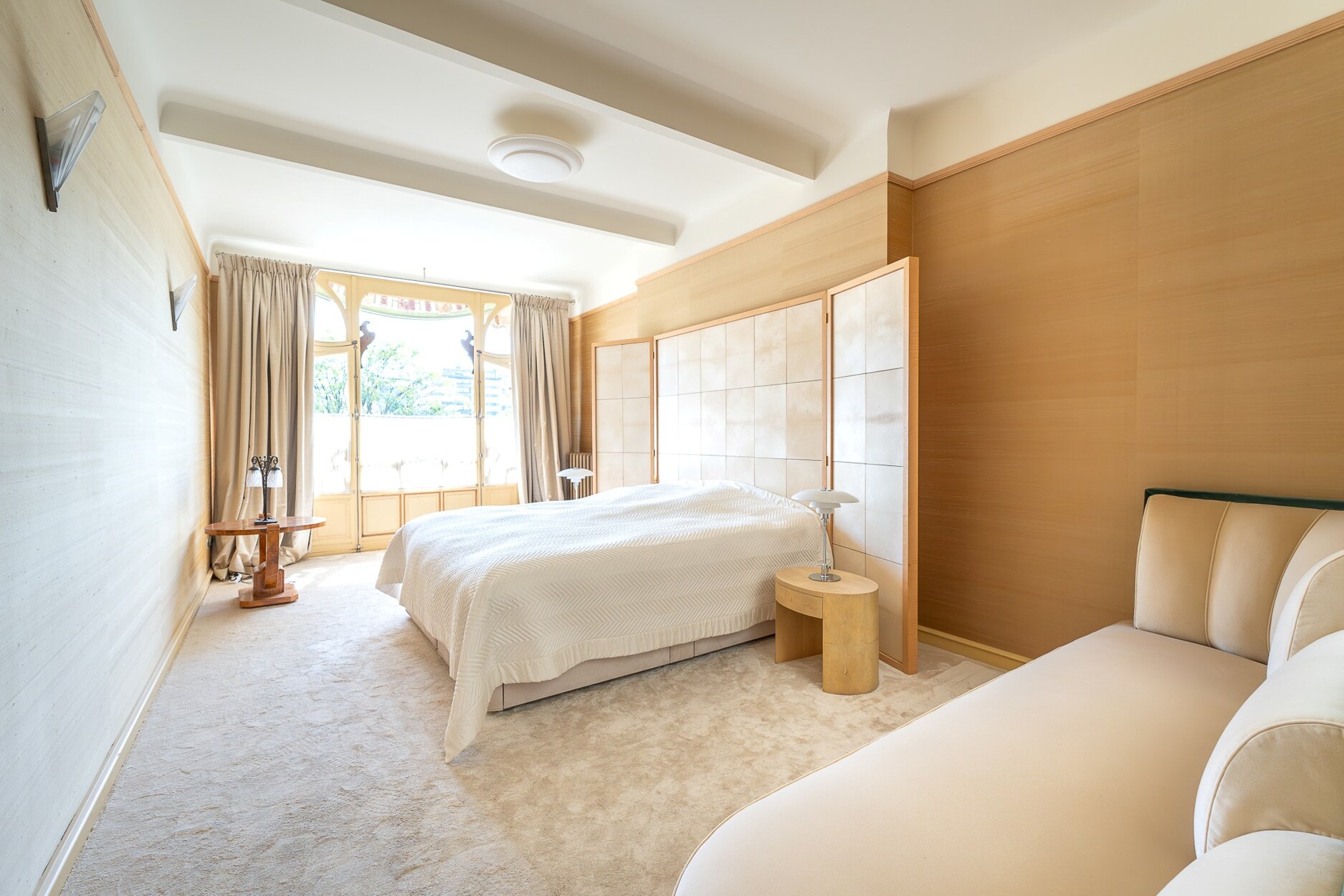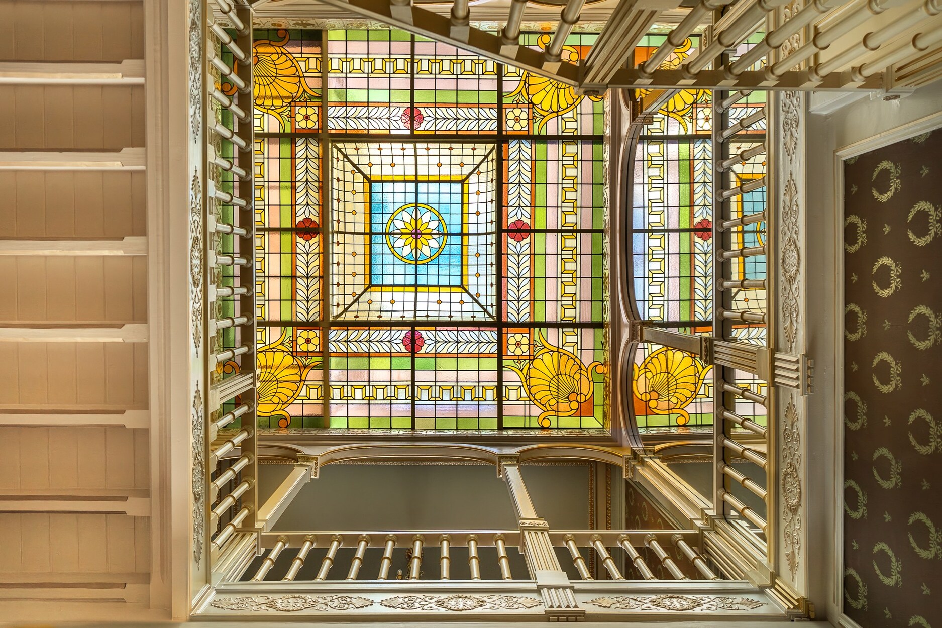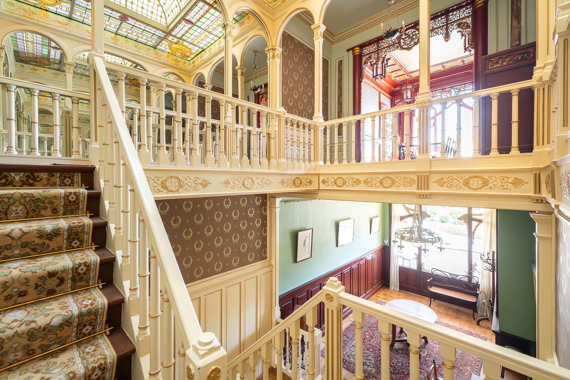 Op de bel-etage leidt een verfijnde hal naar het hoofdwoonvertrek. Op de eerste verdieping bevindt zich de eetkamer, ingericht in het voormalige Chinese salon, met aangrenzend een keuken uitgerust met een fornuis van La Cornue. De tweede verdieping is voorbehouden aan de ouderlijke suite met een slaapkamer van 23 m² en een badkamer van 17 m². Op de derde verdieping bevinden zich twee slaapkamers (14 m² en 13 m²), elk met een eigen badkamer. De vierde verdieping biedt een ruimte die ideaal is als bureau of logeerkamer, evenals een royaal terras met een prachtig uitzicht over het Ambiorixplein. In het souterrain bevindt zich een tweede keuken en een polyvalente ruimte. De traphal onder het glazen dak en de glazen loopbruggen zorgen voor een circulatie badend in licht.