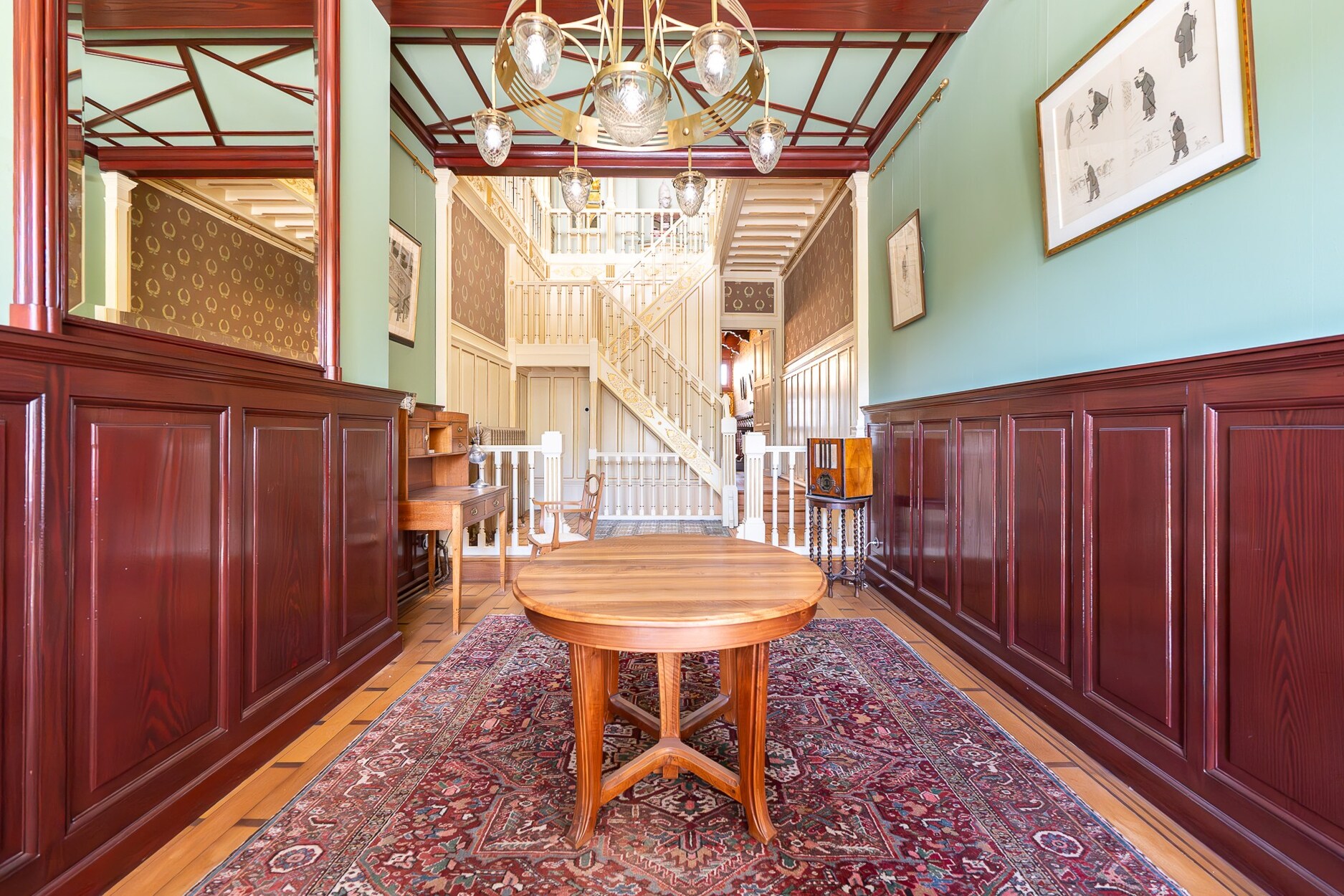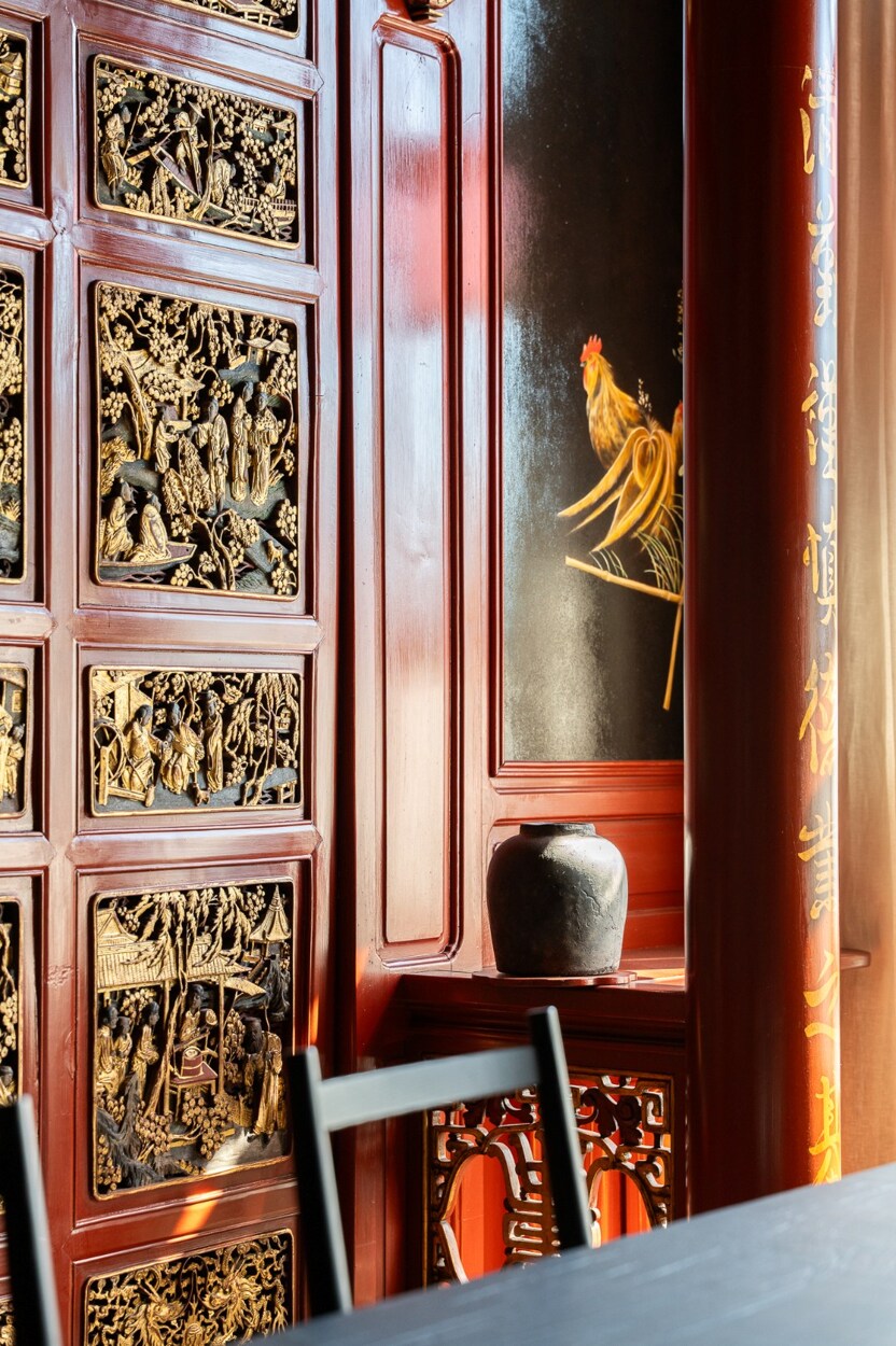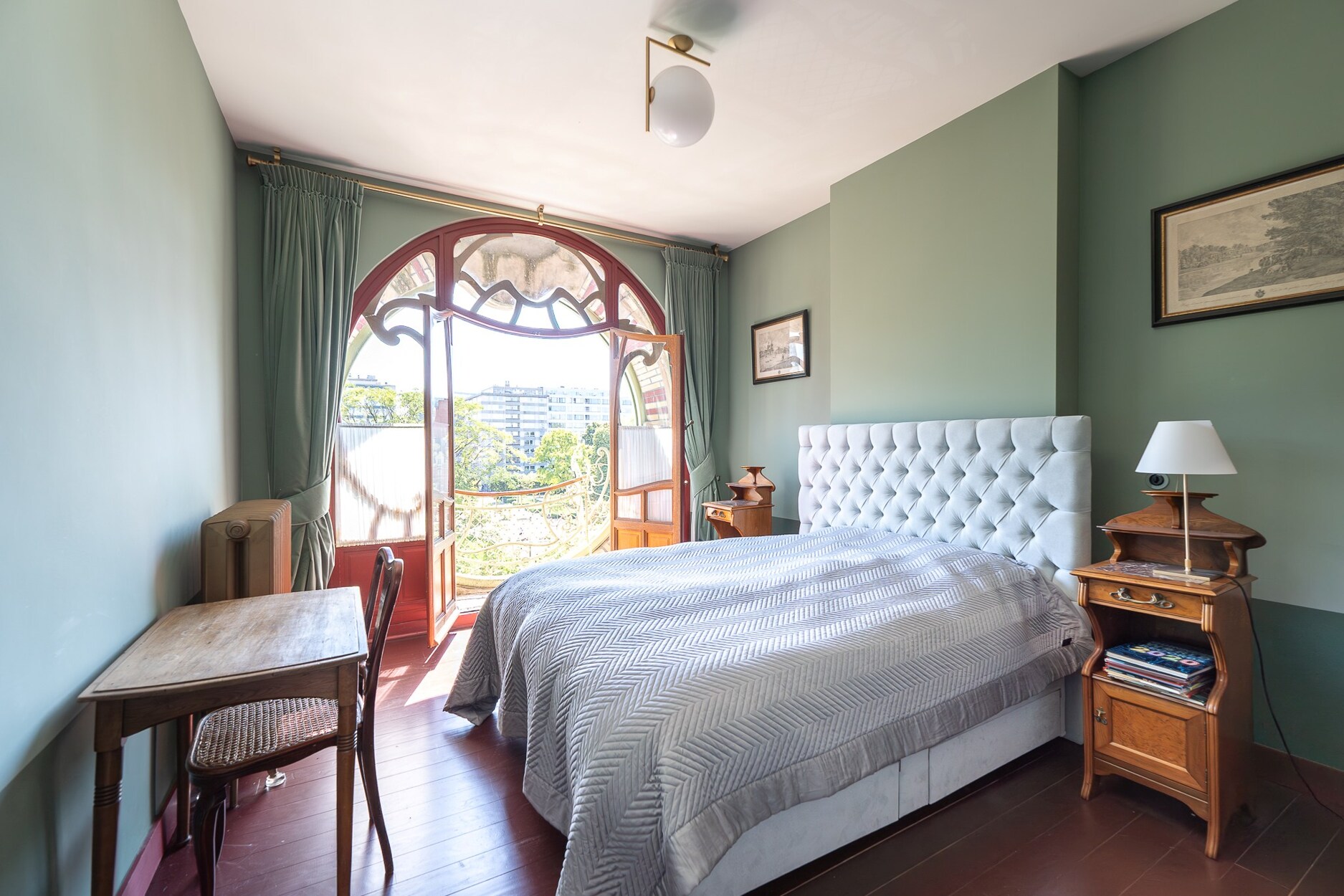 Op de bel-etage leidt een verfijnde hal naar het hoofdwoonvertrek. Op de eerste verdieping bevindt zich de eetkamer, ingericht in het voormalige Chinese salon, met aangrenzend een keuken uitgerust met een fornuis van La Cornue. De tweede verdieping is voorbehouden aan de ouderlijke suite met een slaapkamer van 23 m² en een badkamer van 17 m². Op de derde verdieping bevinden zich twee slaapkamers (14 m² en 13 m²), elk met een eigen badkamer. De vierde verdieping biedt een ruimte die ideaal is als bureau of logeerkamer, evenals een royaal terras met een prachtig uitzicht over het Ambiorixplein. In het souterrain bevindt zich een tweede keuken en een polyvalente ruimte. De traphal onder het glazen dak en de glazen loopbruggen zorgen voor een circulatie badend in licht.