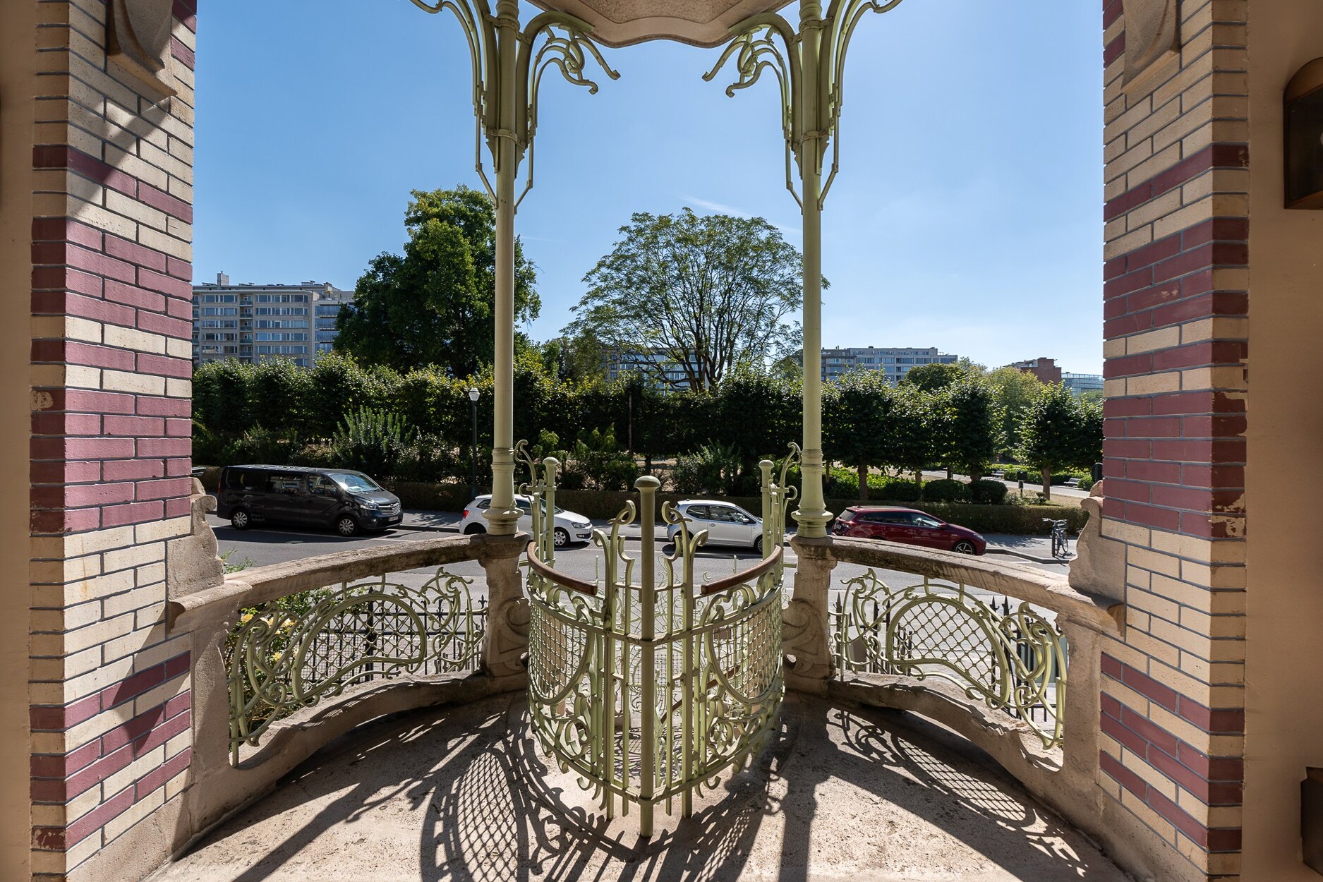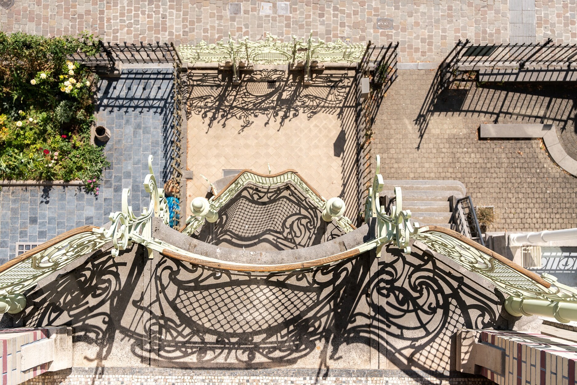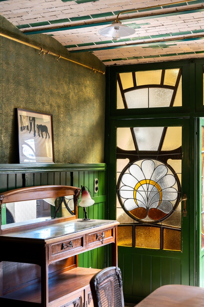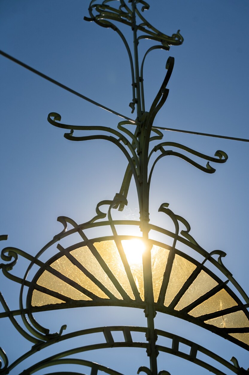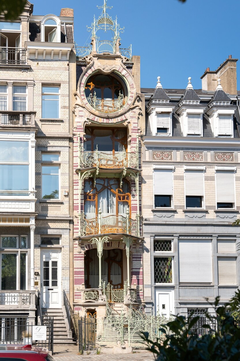 De spectaculaire gevel, vier meter breed maar rijkelijk versierd met polychrome bakstenen en florale smeedijzeren elementen, is een toonbeeld van de stijl die vaak wordt omschreven als ‘barokke art nouveau’.