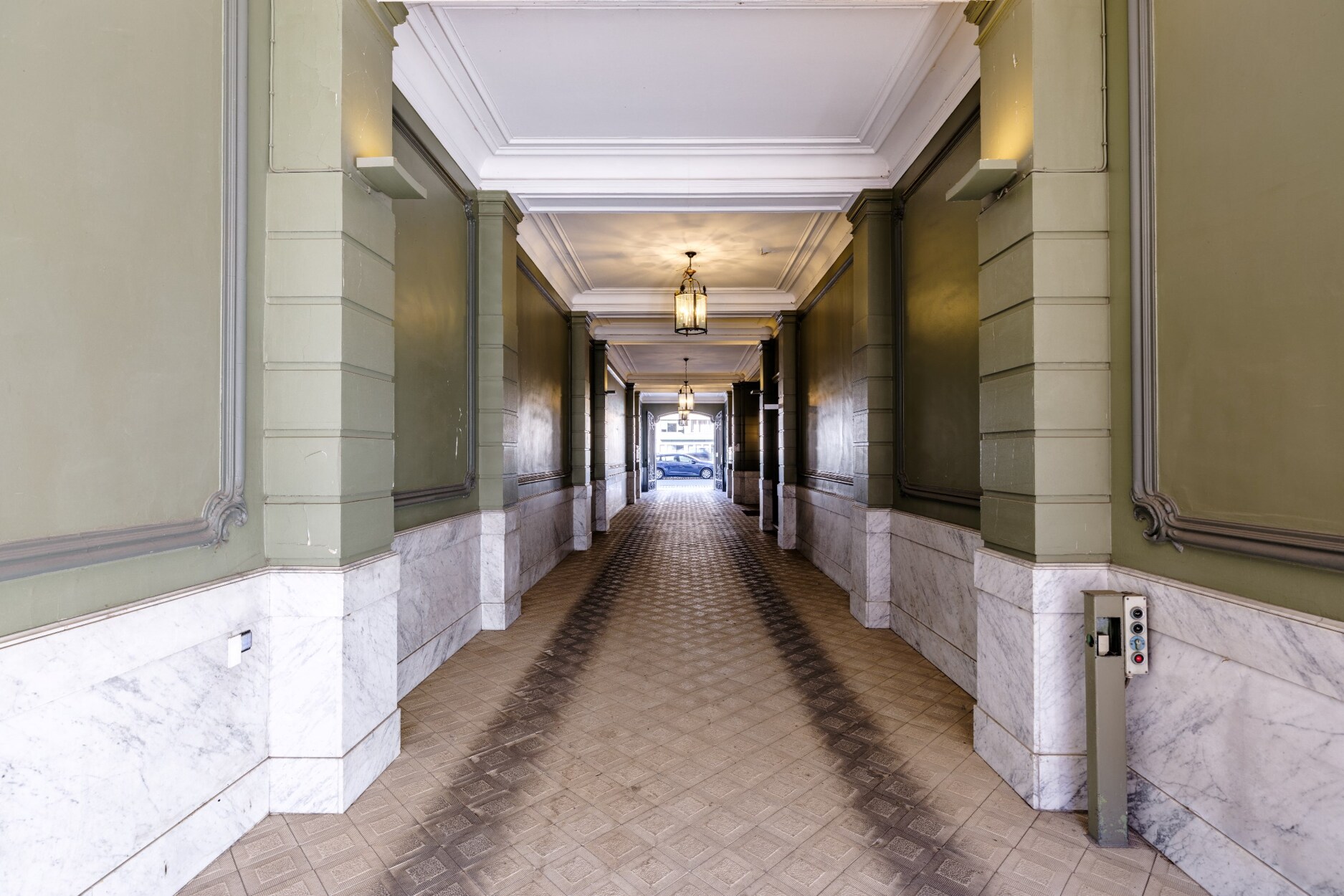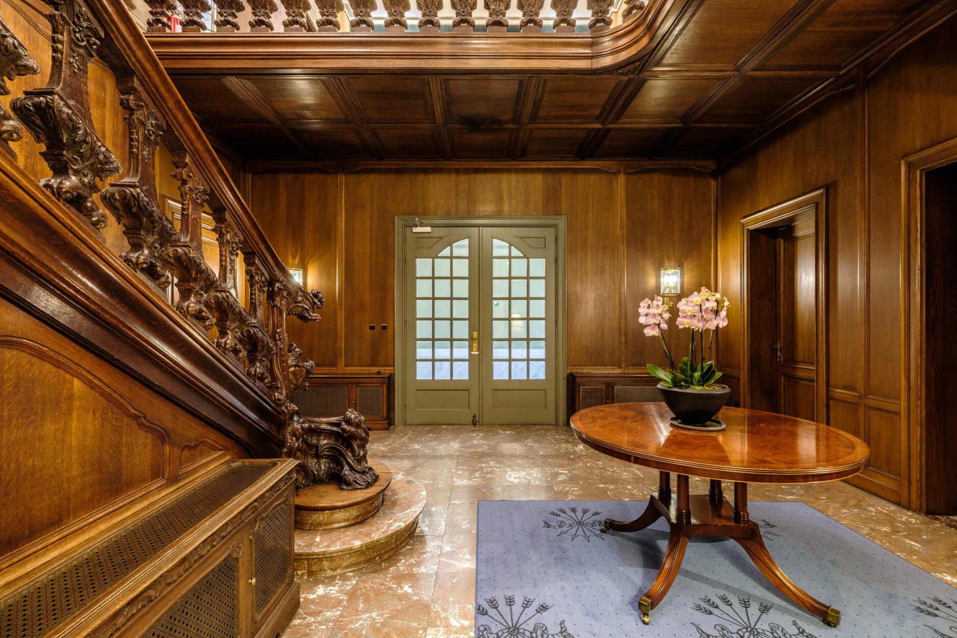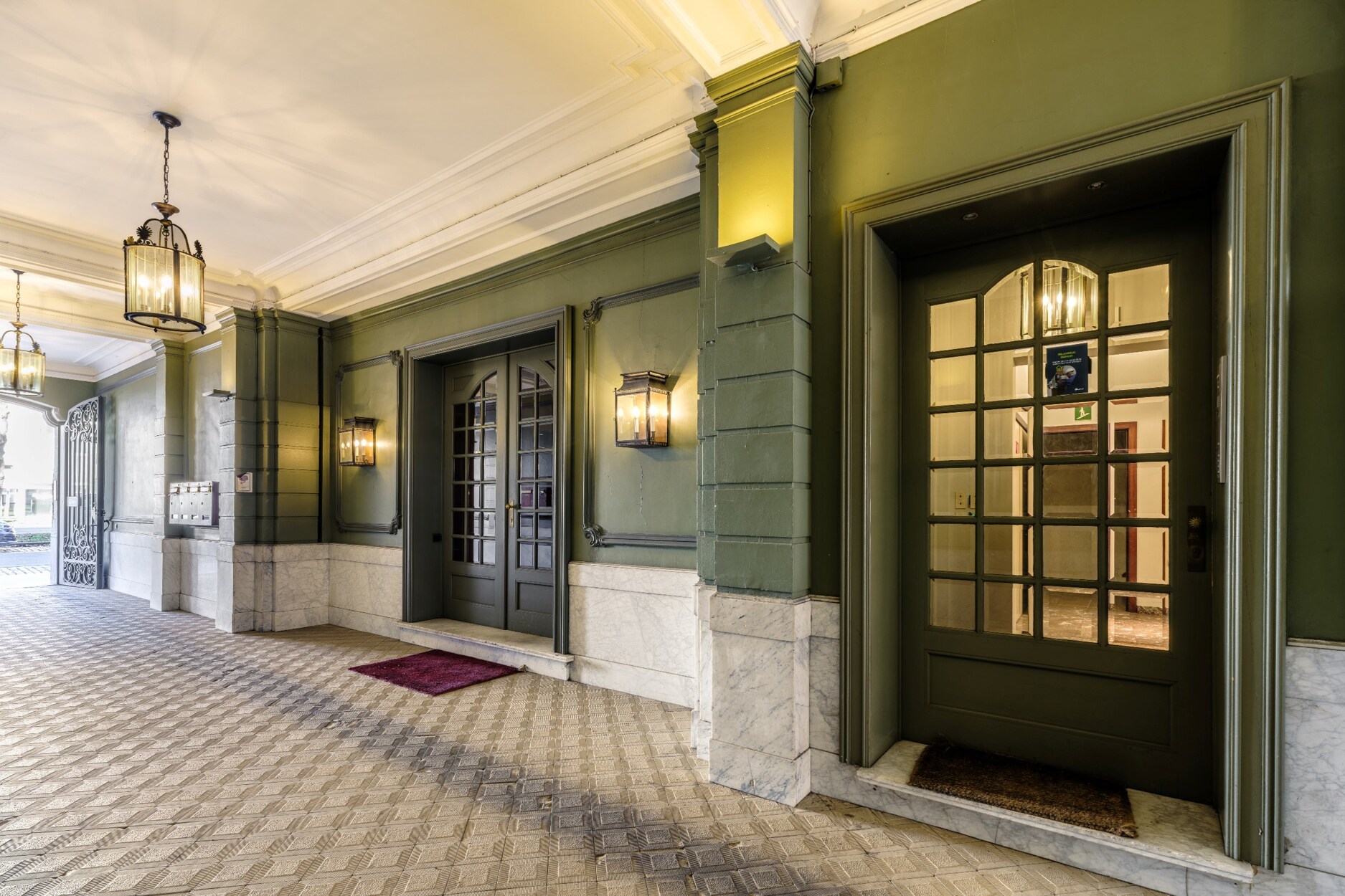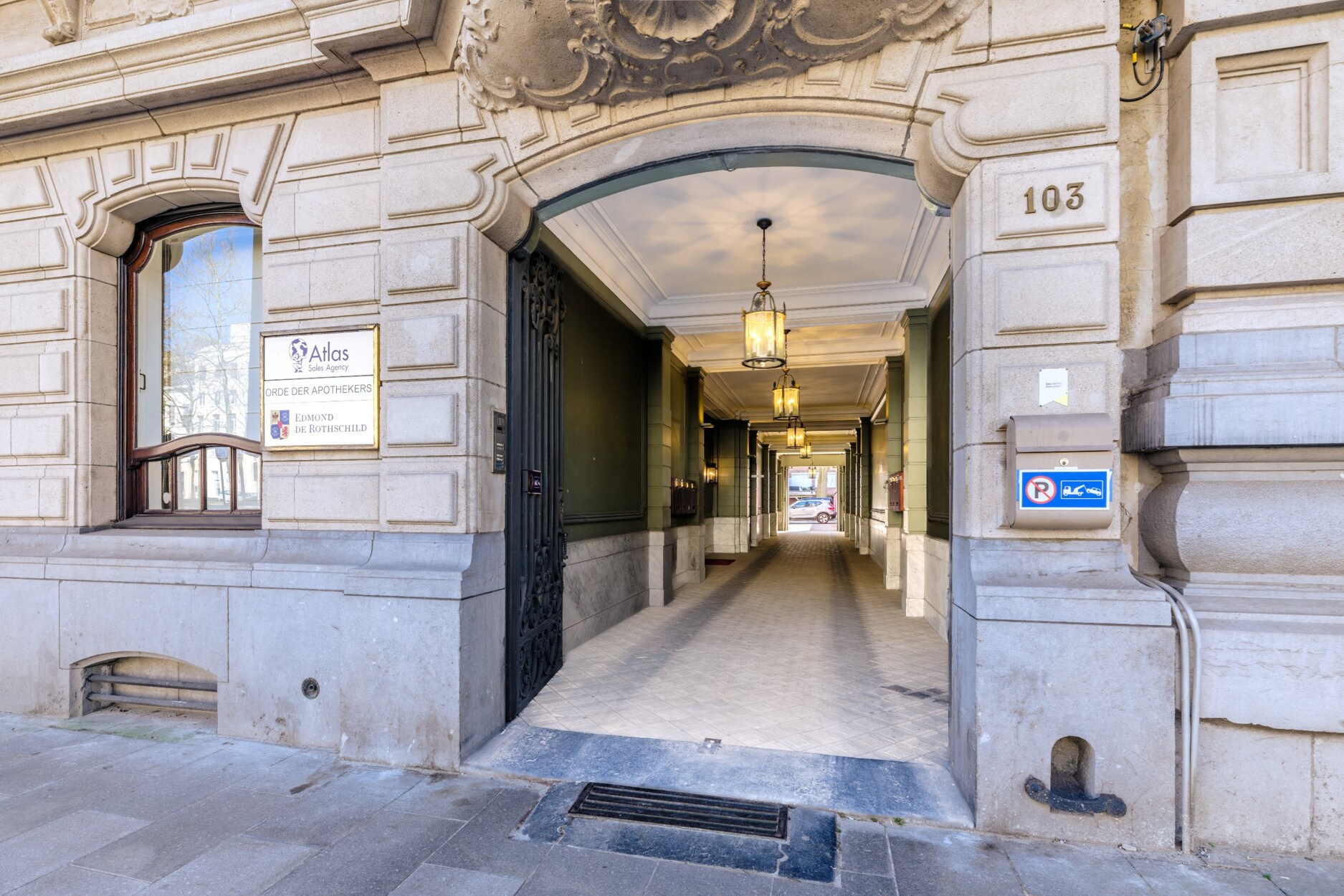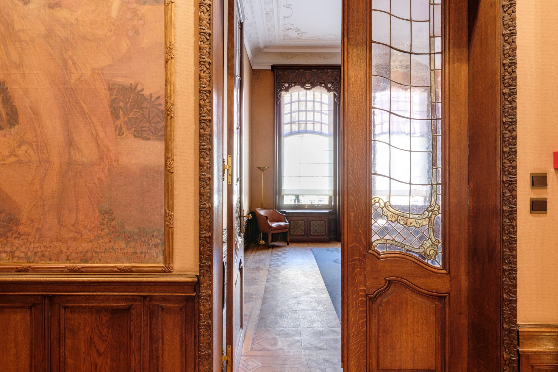 Binnenin straalt het gebouw klasse uit: een monumentale inkomhal, originele marmeren en parketvloeren, lambriseringen, sierhaarden, hoge plafonds met moulures en stucwerk, en unieke muurschilderingen van Emile Vloors (1923). Het achterste gedeelte telt zes niveaus, waaronder een verdieping met een ruim terras van 60 m², en werd gerenoveerd met oog voor kwaliteit en hedendaagse afwerking.