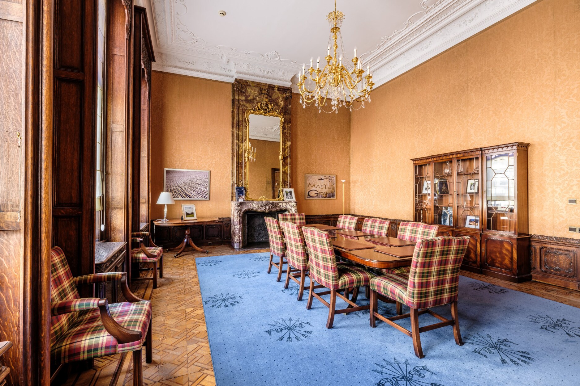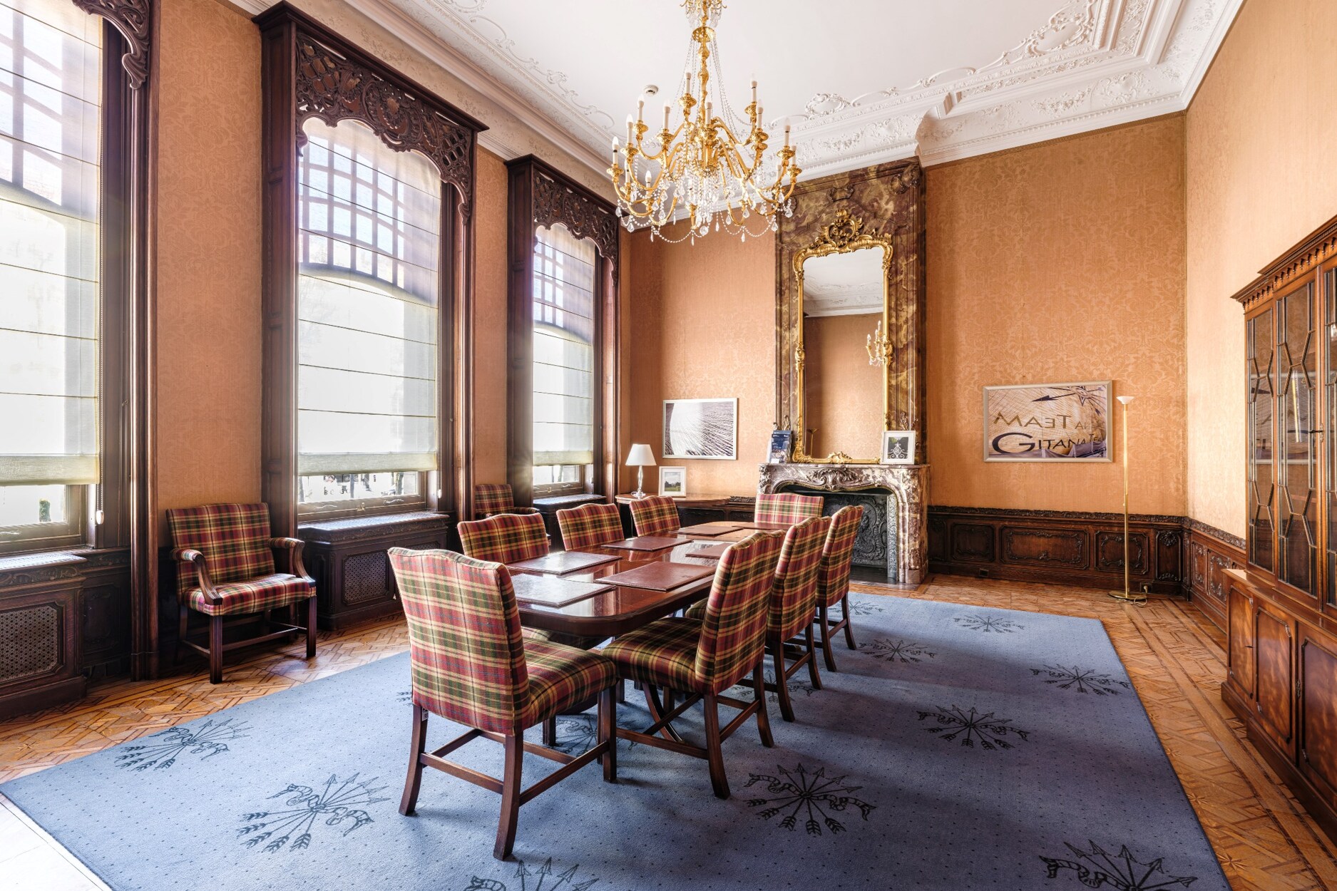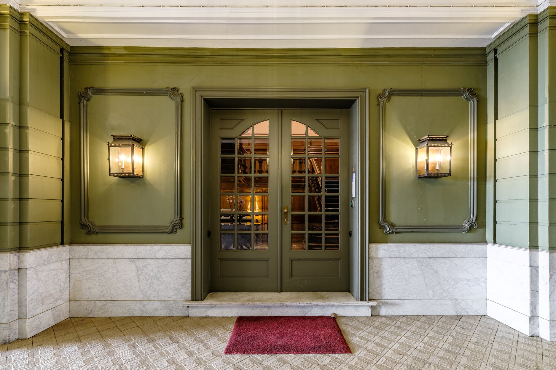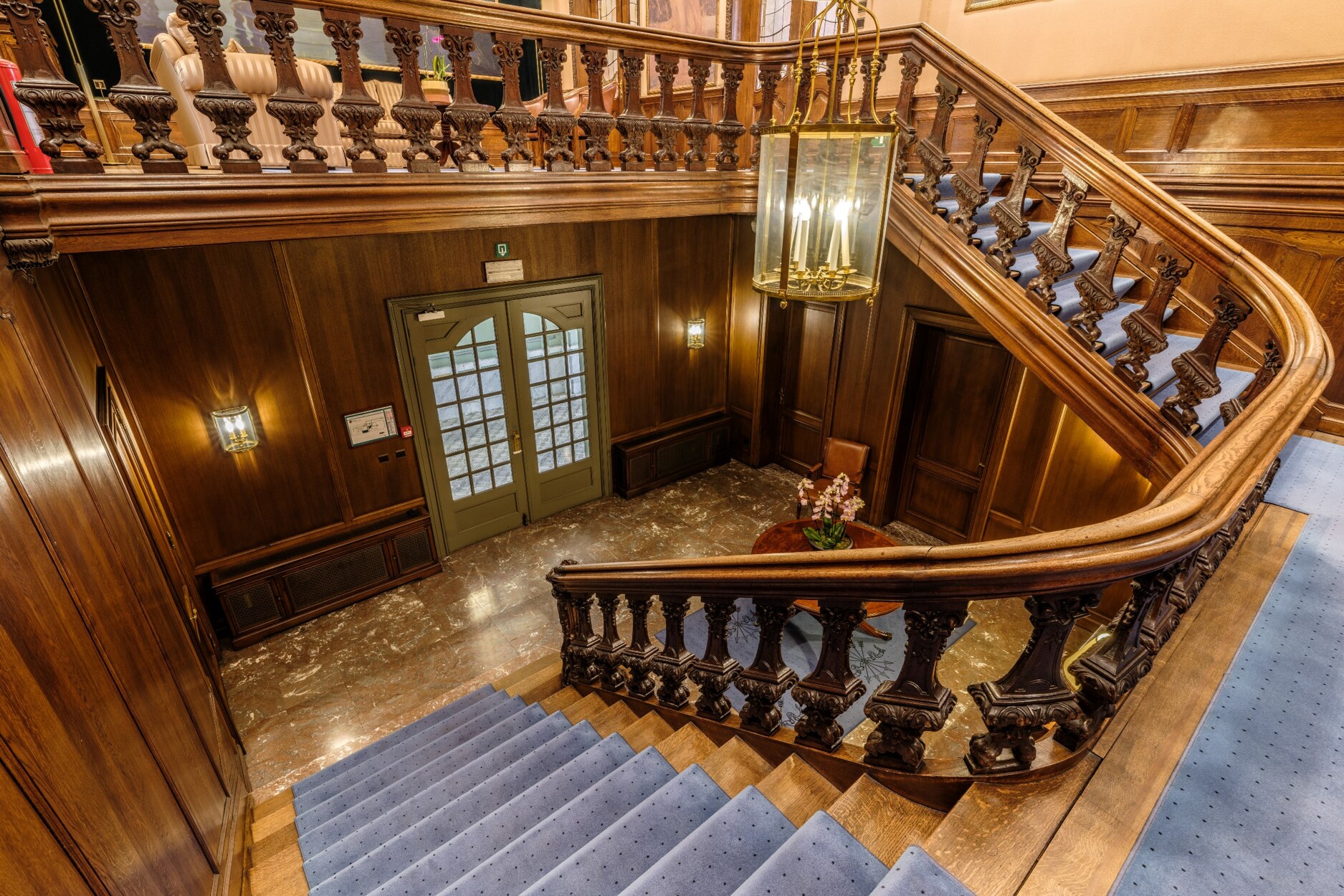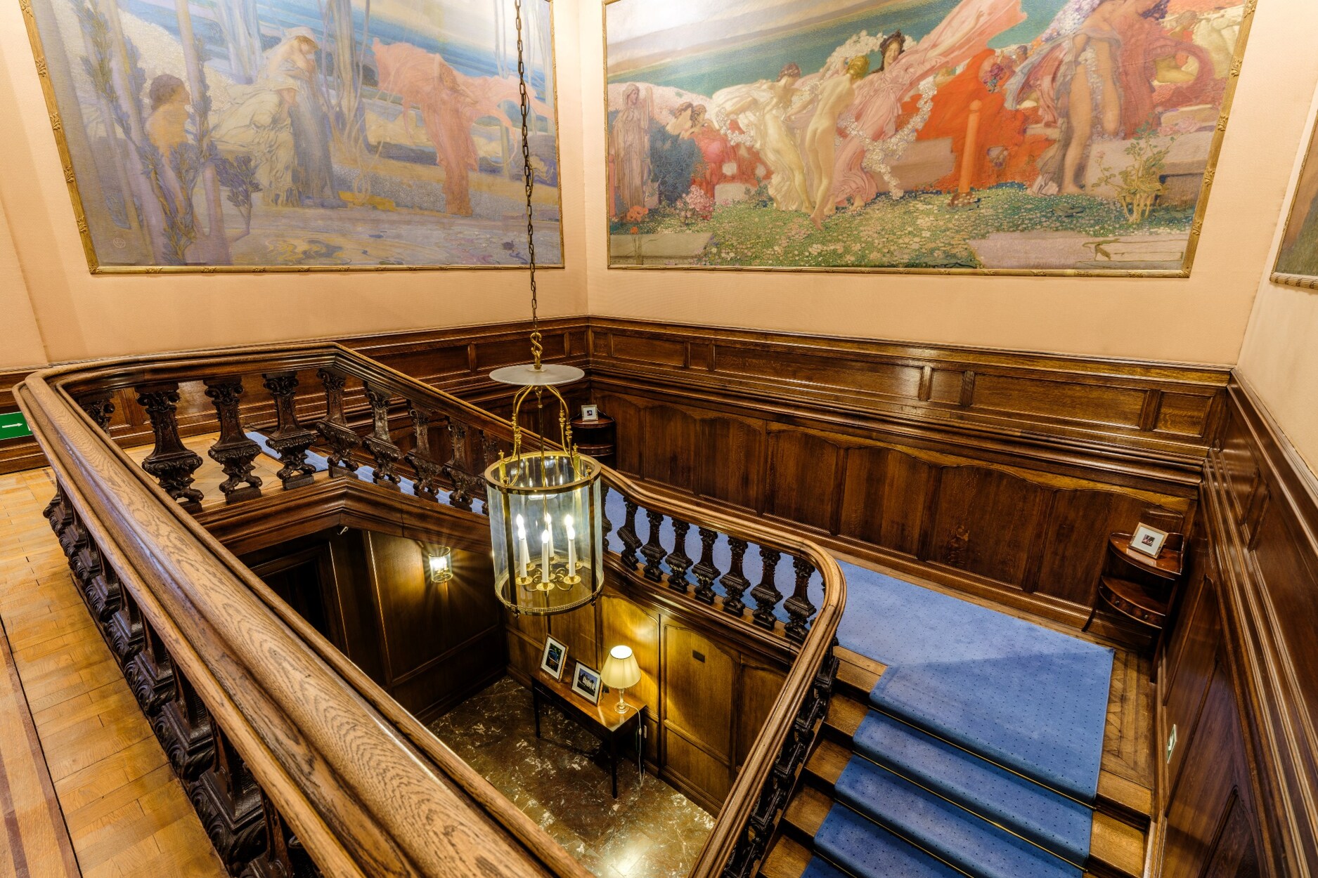 Binnenin straalt het gebouw klasse uit: een monumentale inkomhal, originele marmeren en parketvloeren, lambriseringen, sierhaarden, hoge plafonds met moulures en stucwerk, en unieke muurschilderingen van Emile Vloors (1923). Het achterste gedeelte telt zes niveaus, waaronder een verdieping met een ruim terras van 60 m², en werd gerenoveerd met oog voor kwaliteit en hedendaagse afwerking.