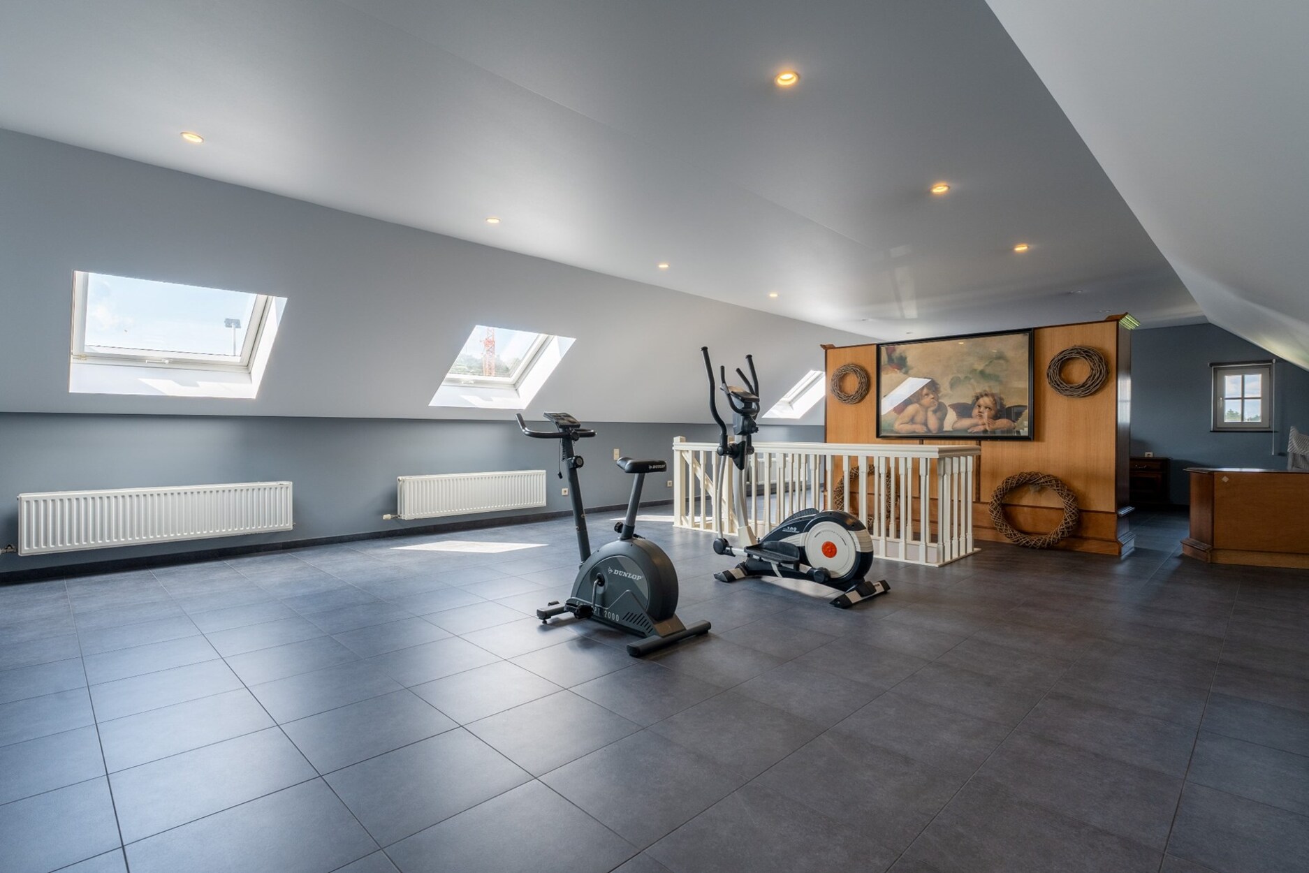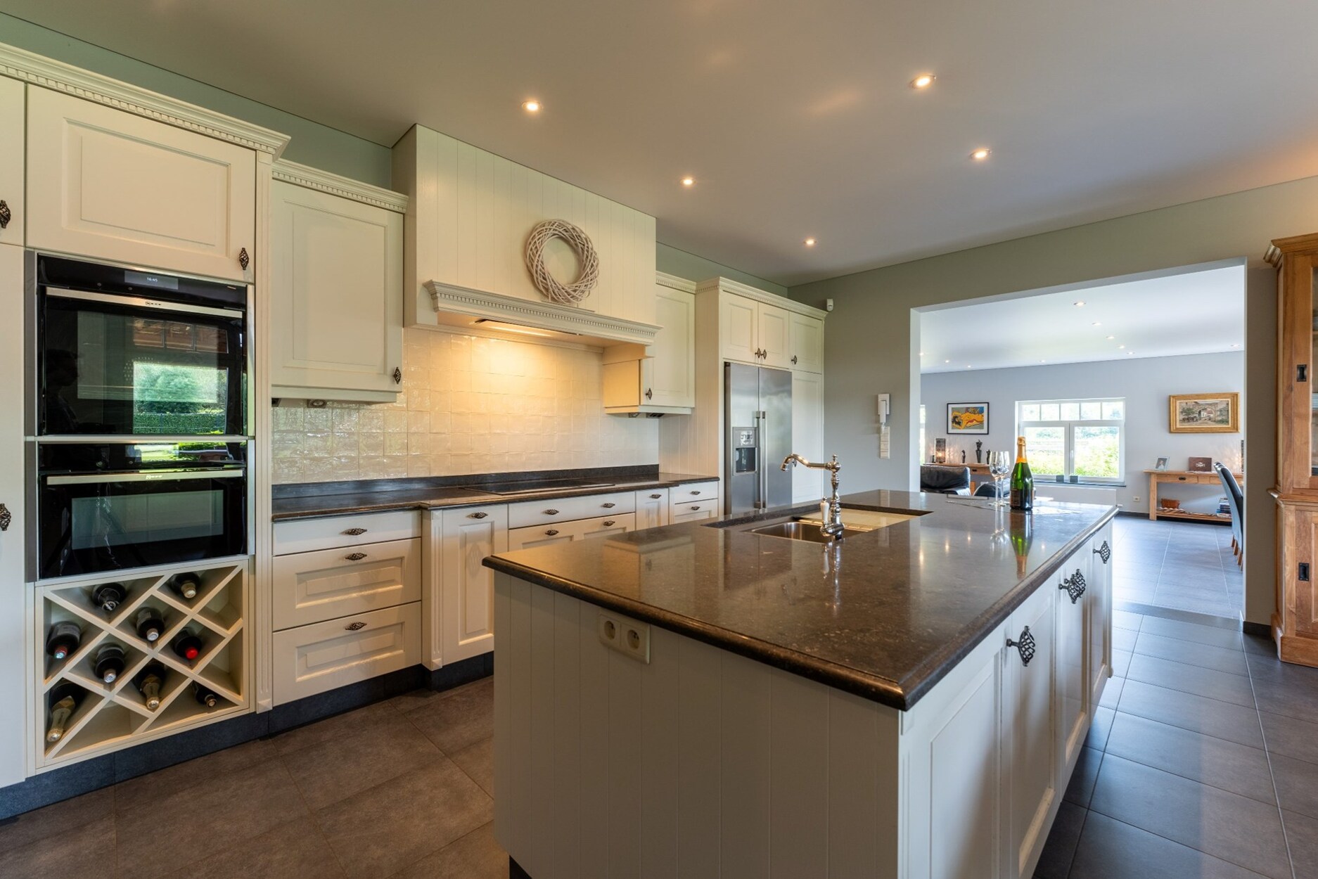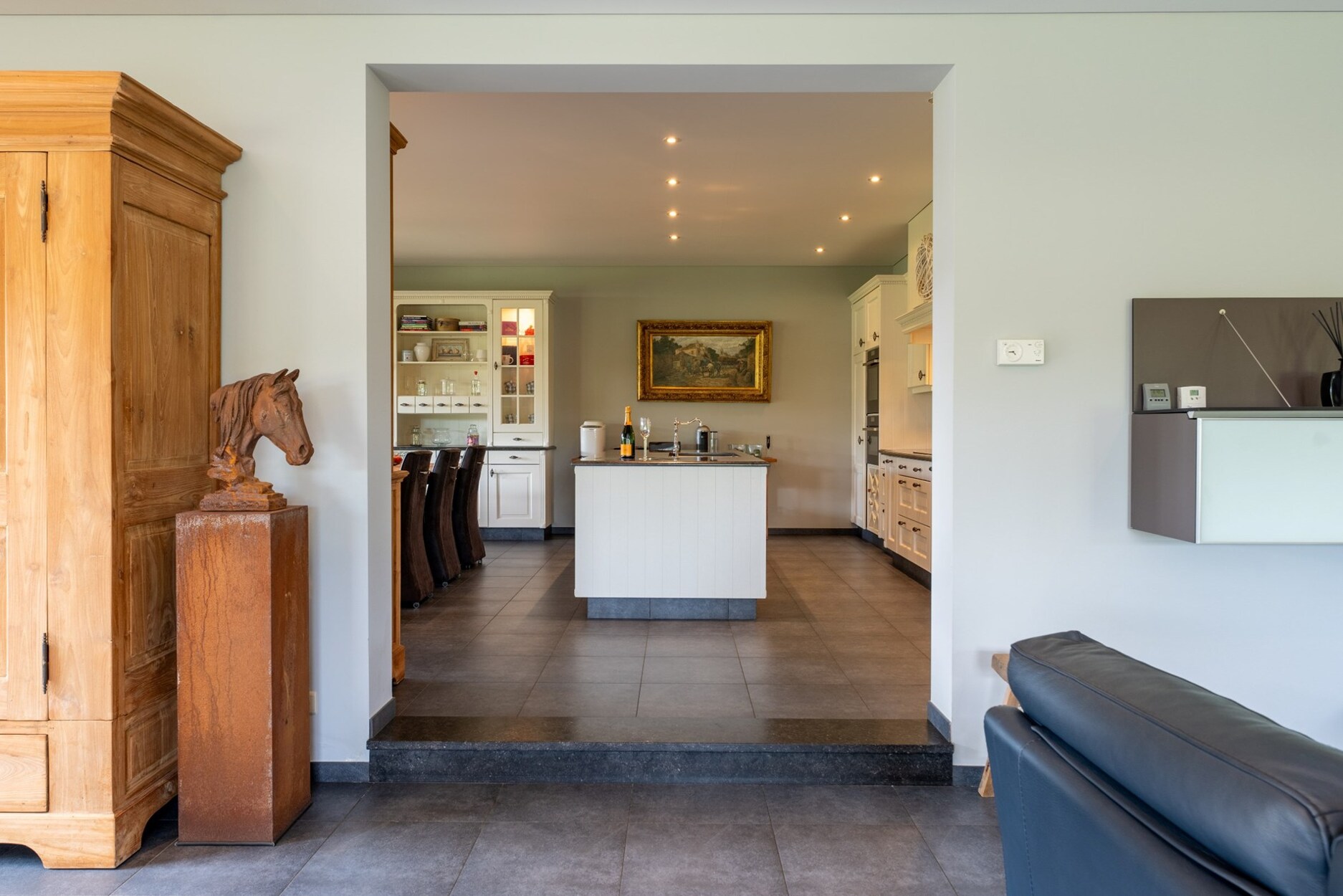 De woning betreedt u via een ruime inkomhal, deze heeft op het gelijkvloers een 1ste slaapkamer en badkamer. De riante living met open haard geeft toegang tot de ruime open keuken voorzien van de nodige toestellen. De keuken heeft een overdekt terras waar het heerlijk vertoeven is in de zomermaanden. Verder bevindt zich op het gelijkvloers een technische ruimte dewelke eveneens kan dienen als wasplaats, een polyvalente ruimte met inbouwkasten en een inpandige garage.