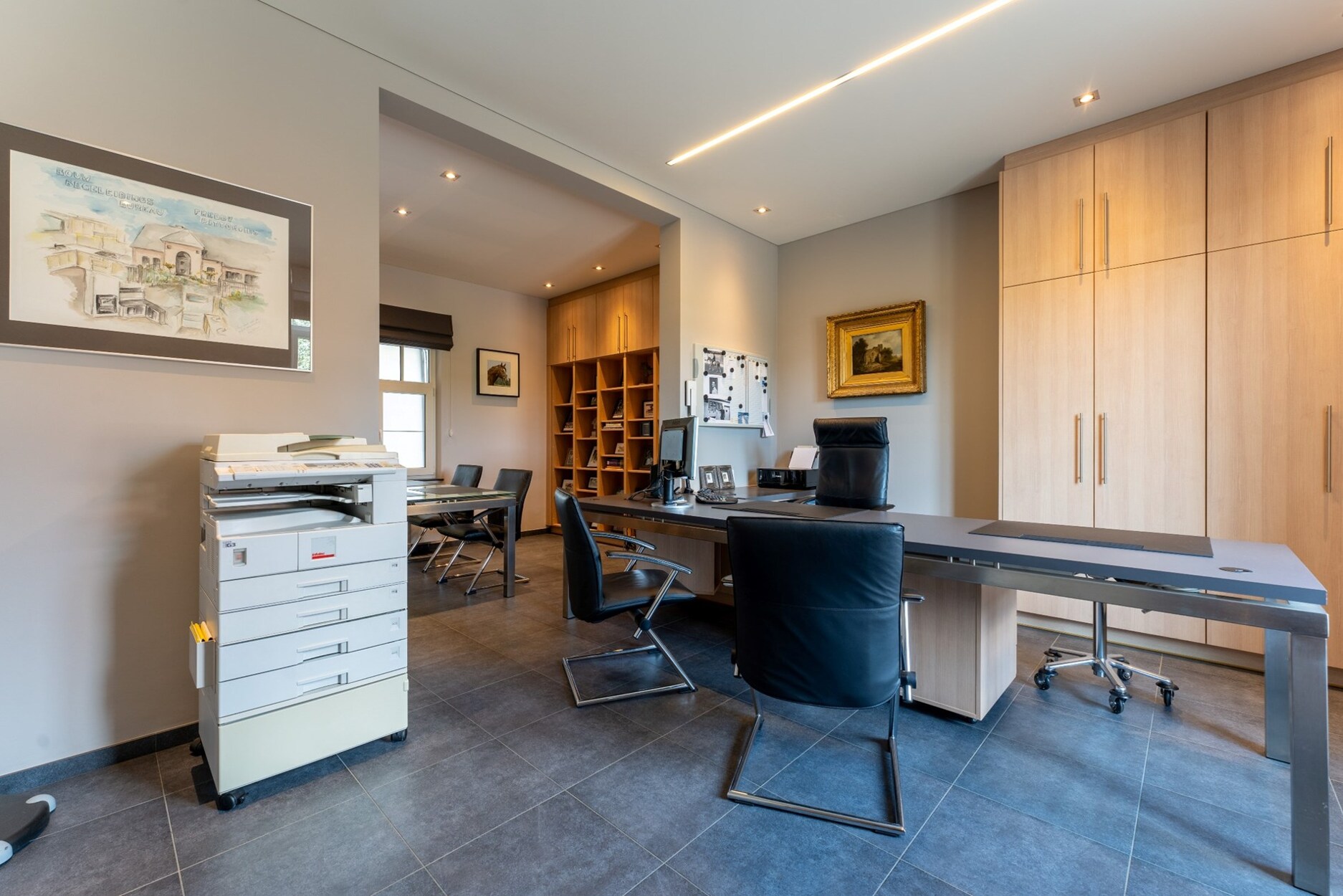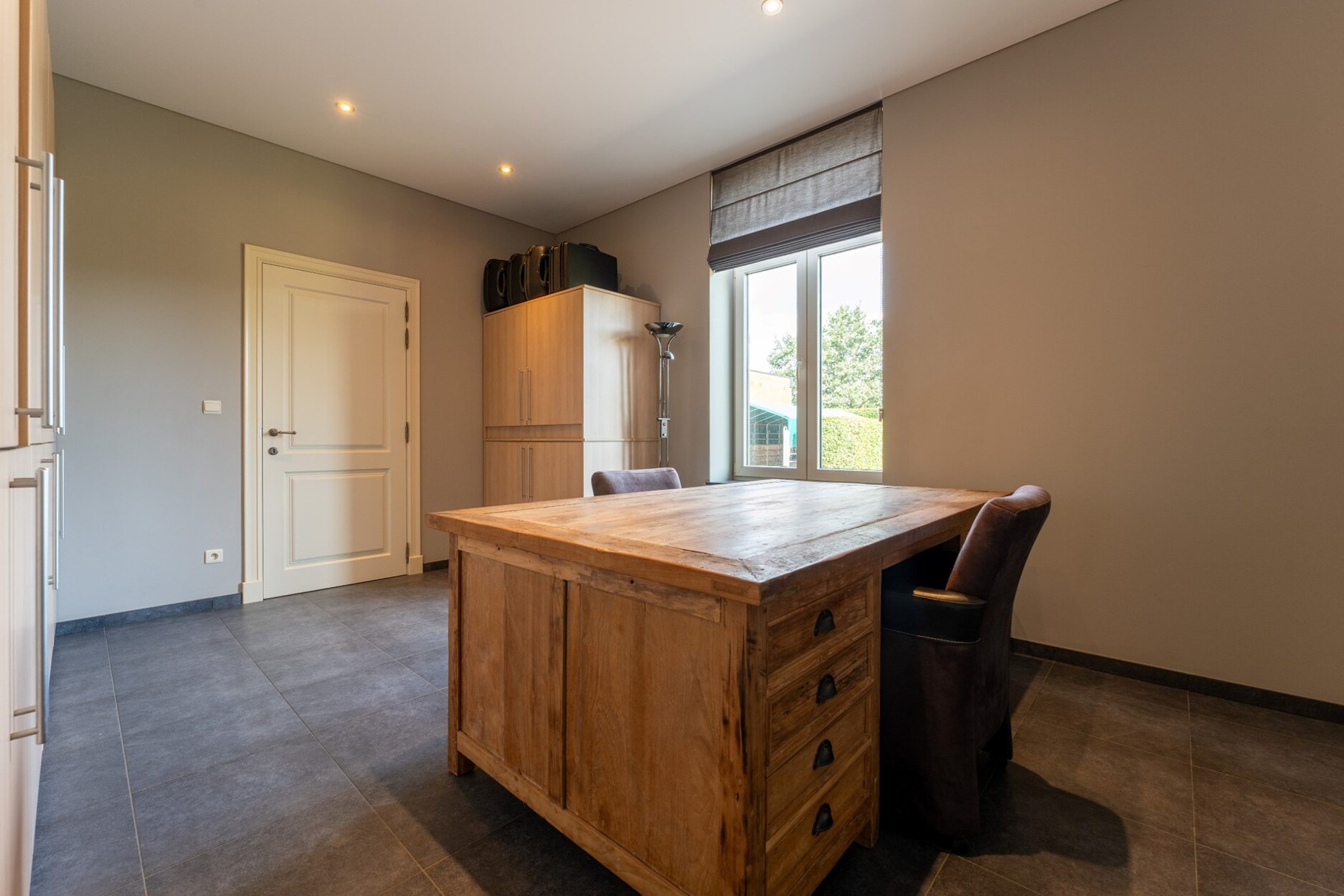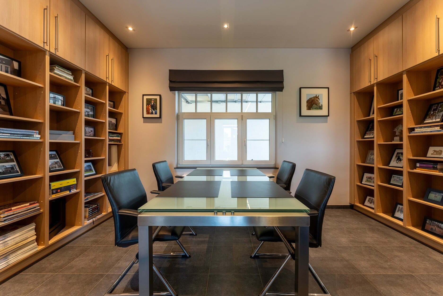 Het kantoorgedeelte dat zich apart bevindt, biedt plaats aan 2 bureaus om in alle rust te werken. Deze ruimte is voorzien van hoge inbouwkasten. Dit gedeelte heeft een aparte inkom en huisnummer wat fiscaal aantrekkelijk kan zijn.