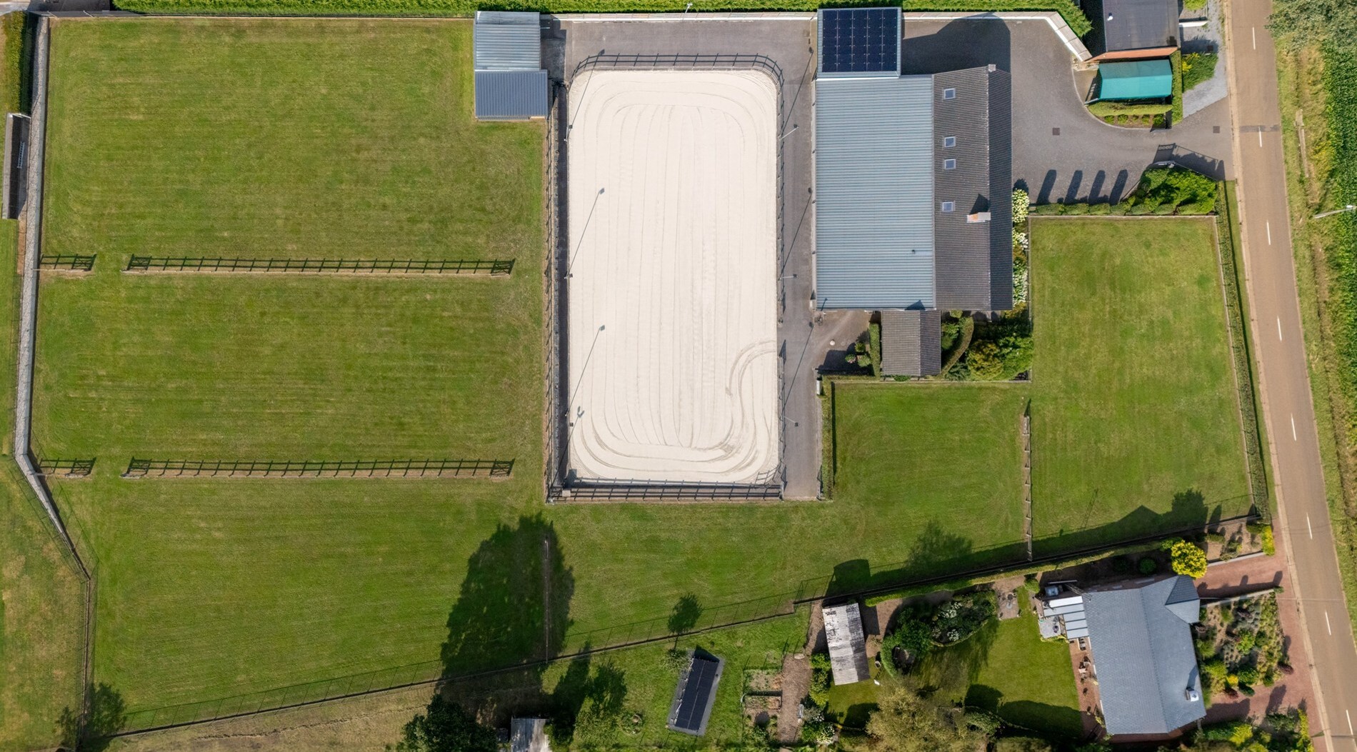 Het erf is te betreden via een elektrische poort. Wanneer we via de rechterkant van de woning tot aan de paarden accommodatie rijden, komen we onder de extra hoge carport waar trailers makkelijk kunnen parkeren.