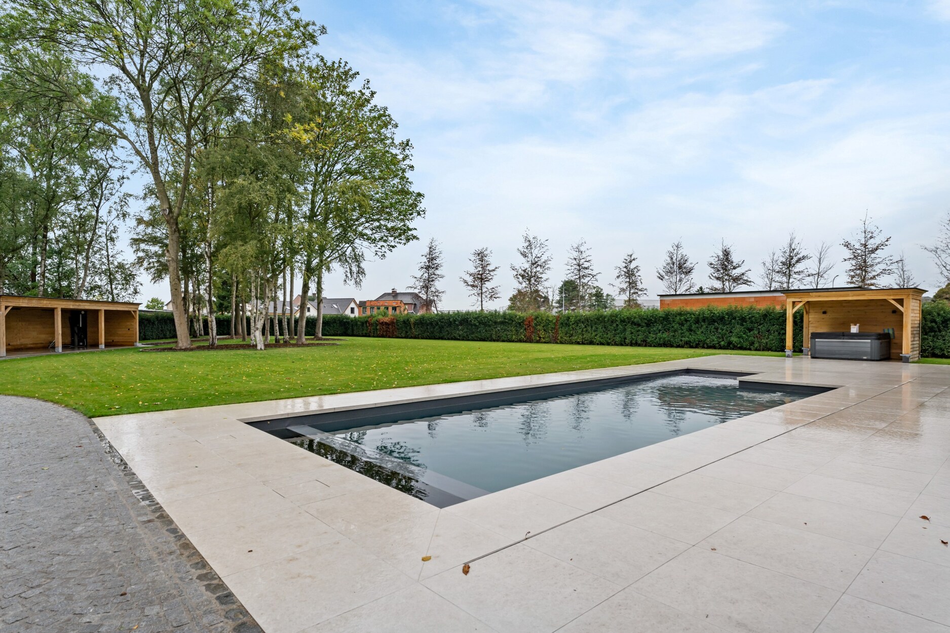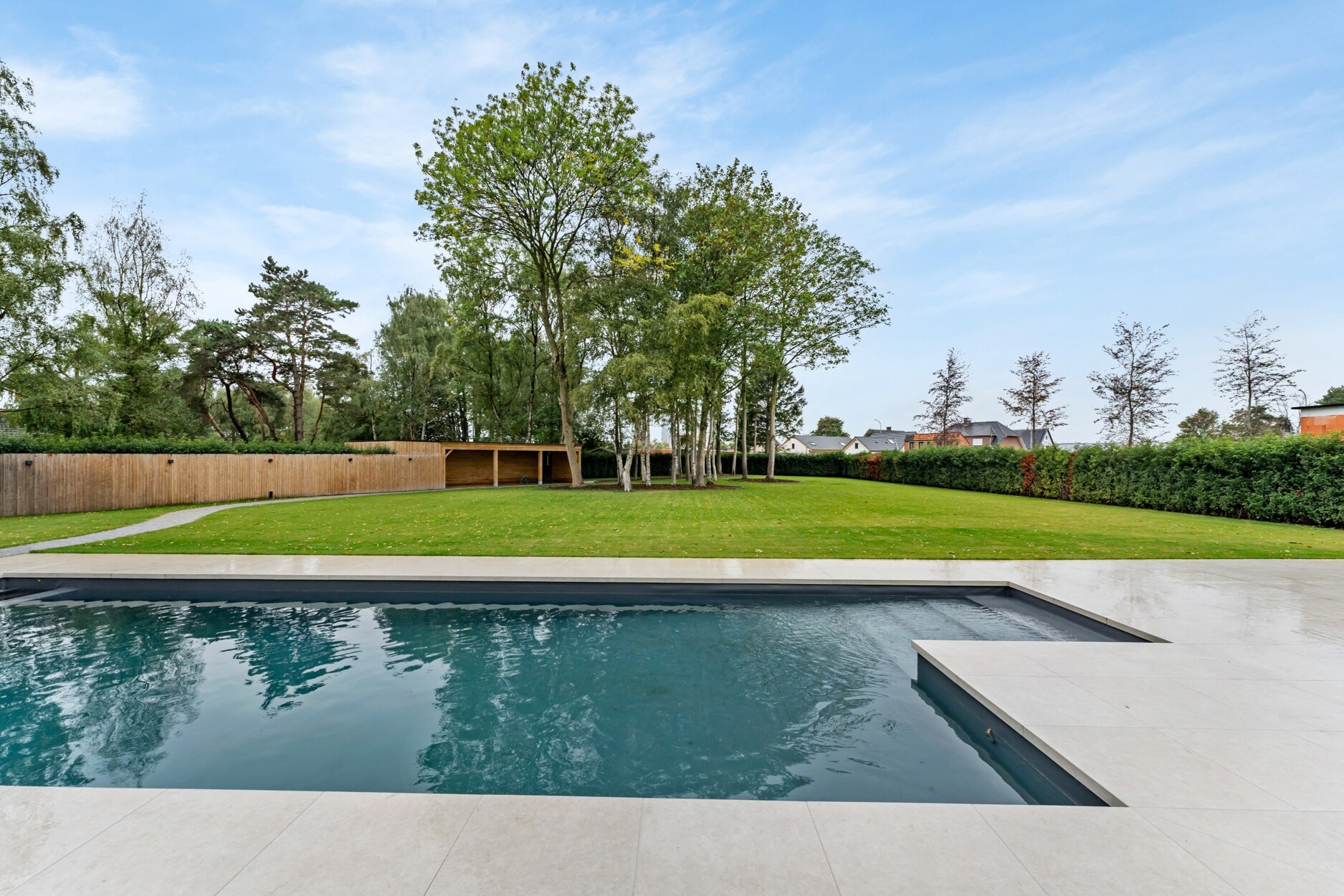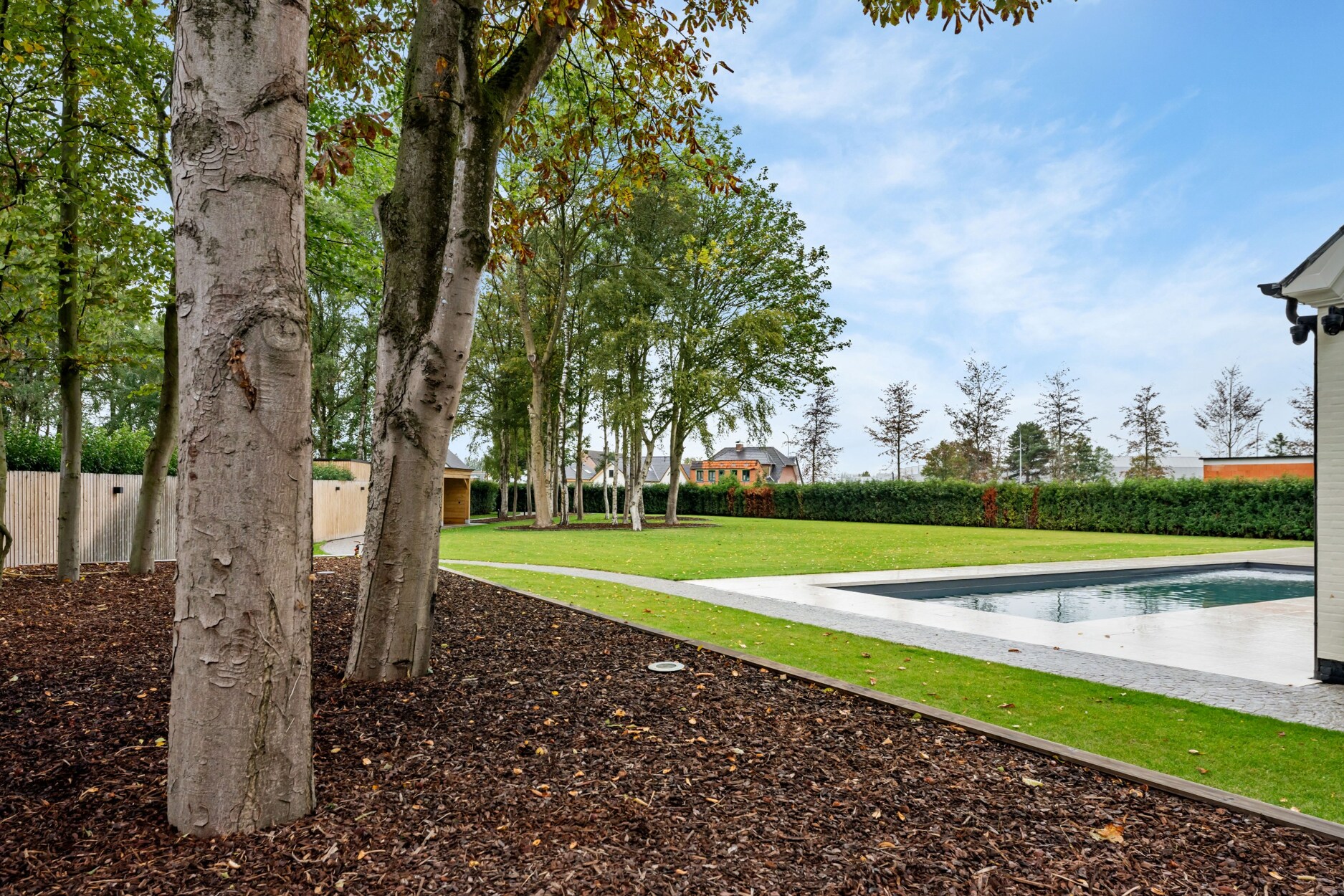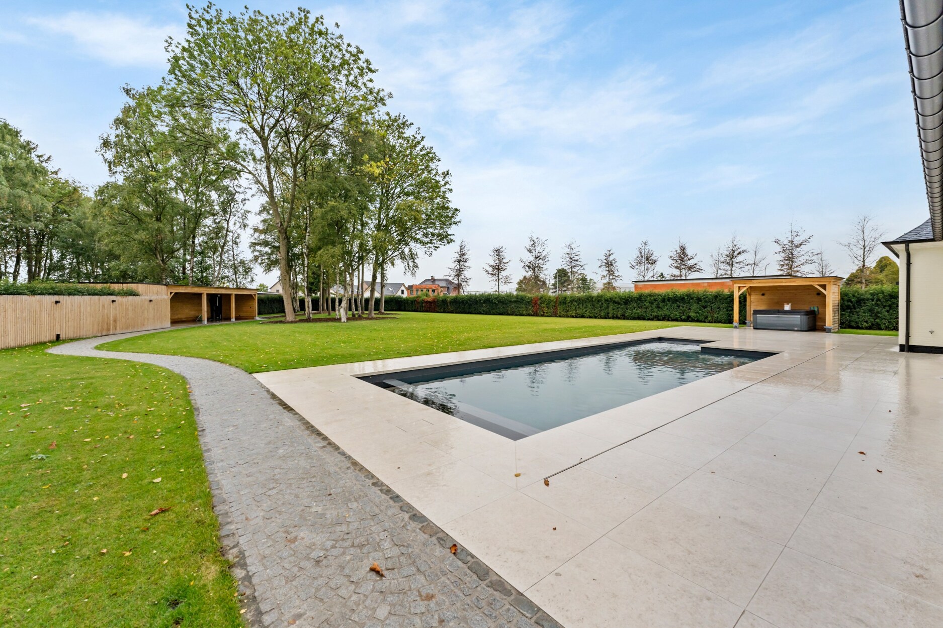 De tuin op het westen werd volledig heraangelegd met behoud van de bestaande bomen en is volledige afgesloten, met automatische toegangspoort vooraan. Aanpalend de woning hebt u een ruim terras met een verwarmd zwembad, verder nog een overdekt terras dieper in de tuin. Er bestaat de mogelijkheid optioneel het achterliggend stuk grond met ontsluiting naar Sint Lenaartseweg aan te kopen.