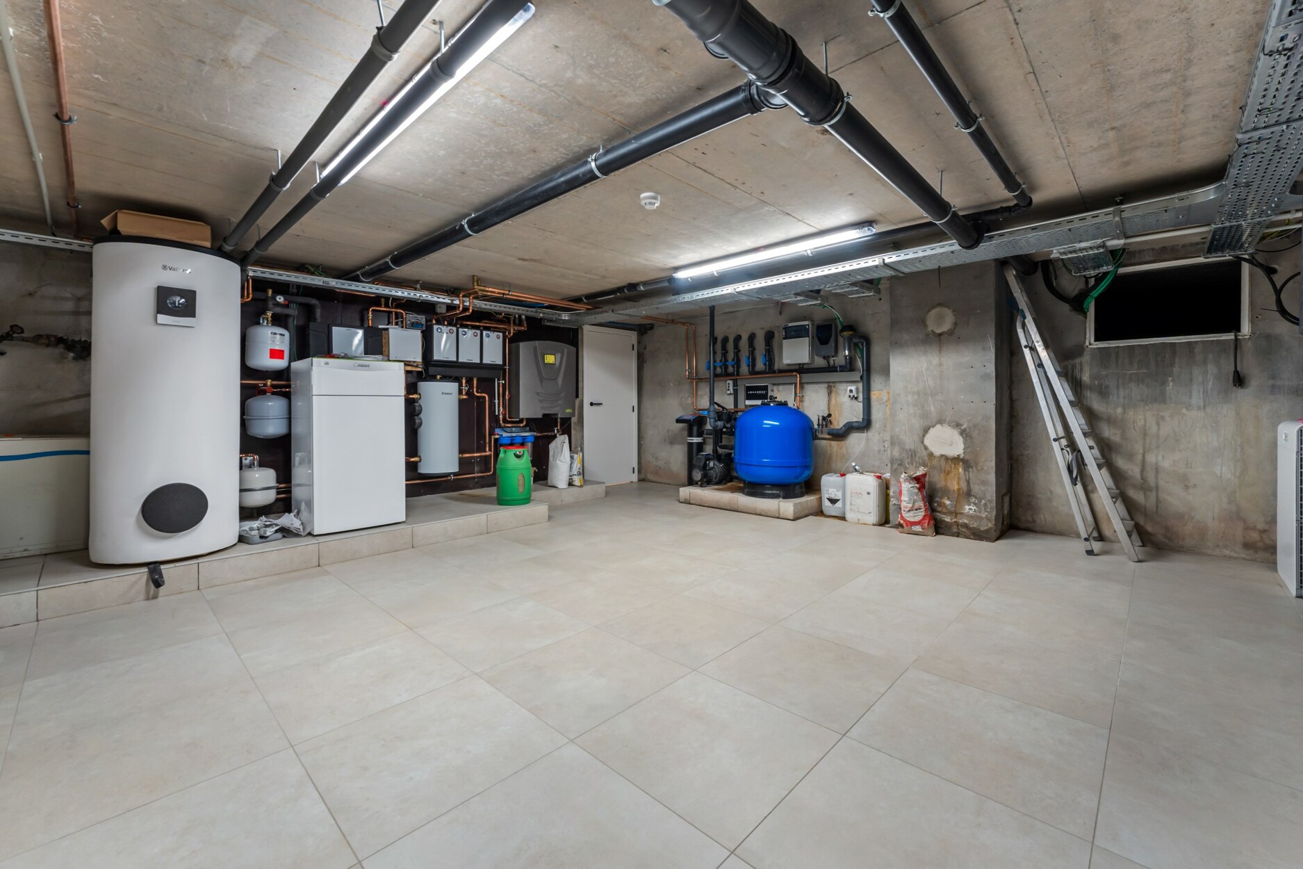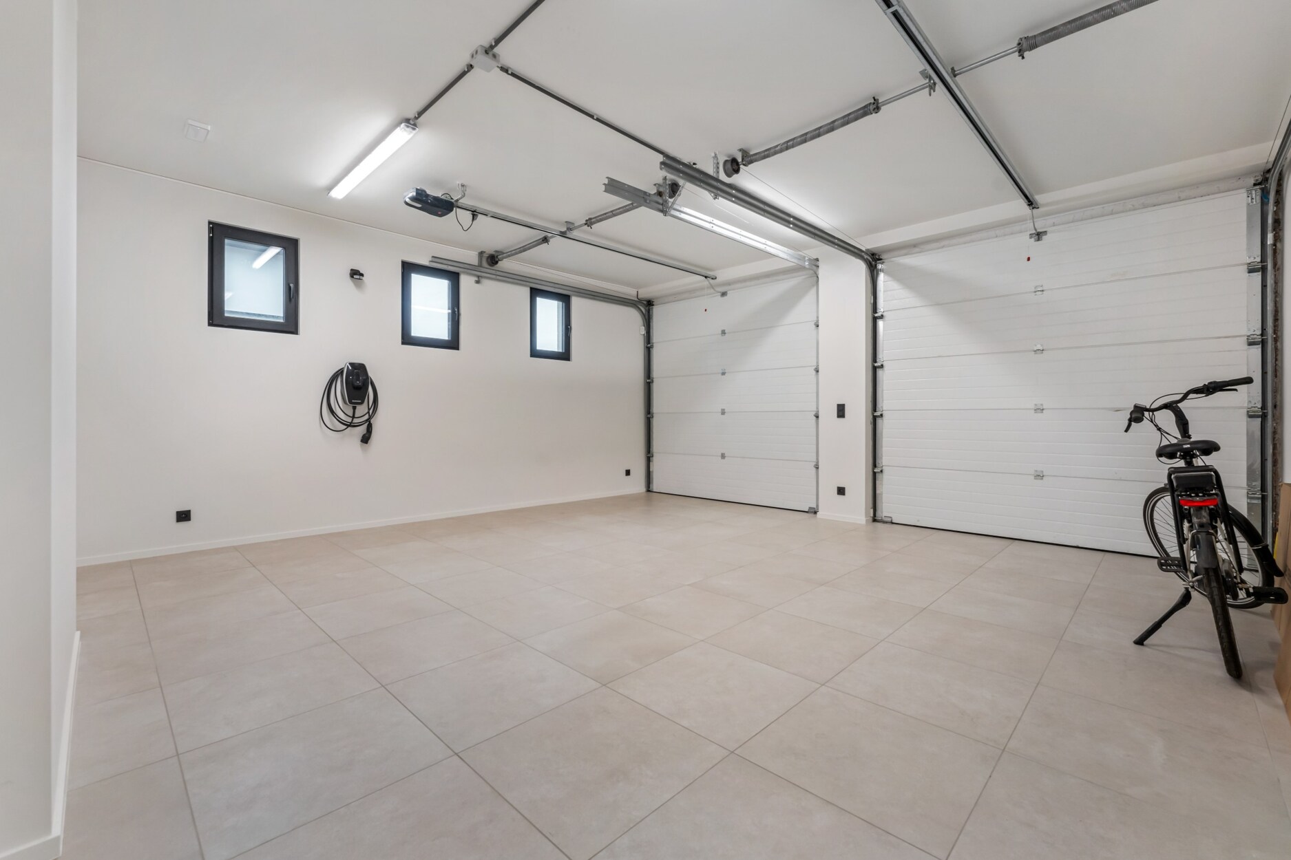 De garage is voorzien van 2 automatische poorten en 2 laadpalen. De kelder is ingedeeld in 3 ruimtes, waarvan één ruimte met de technische installaties.