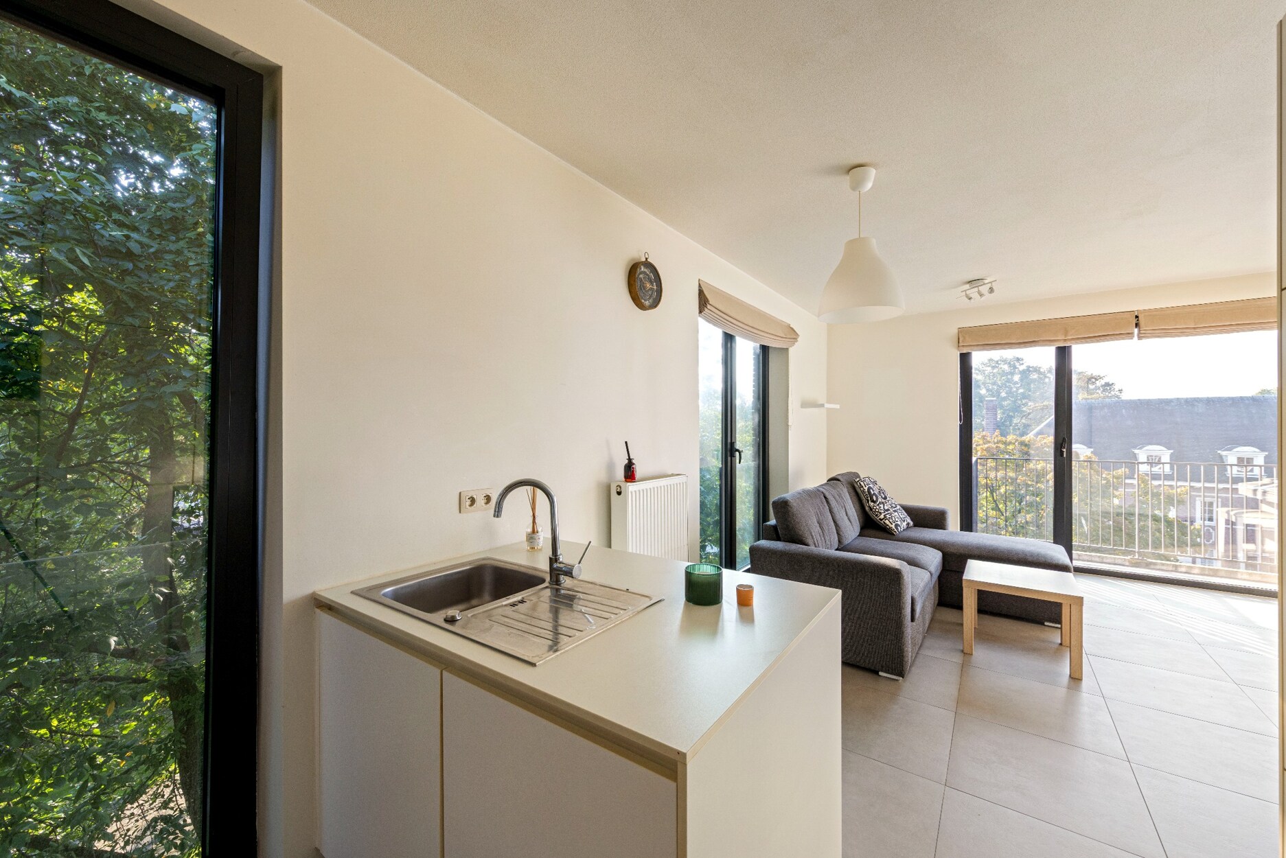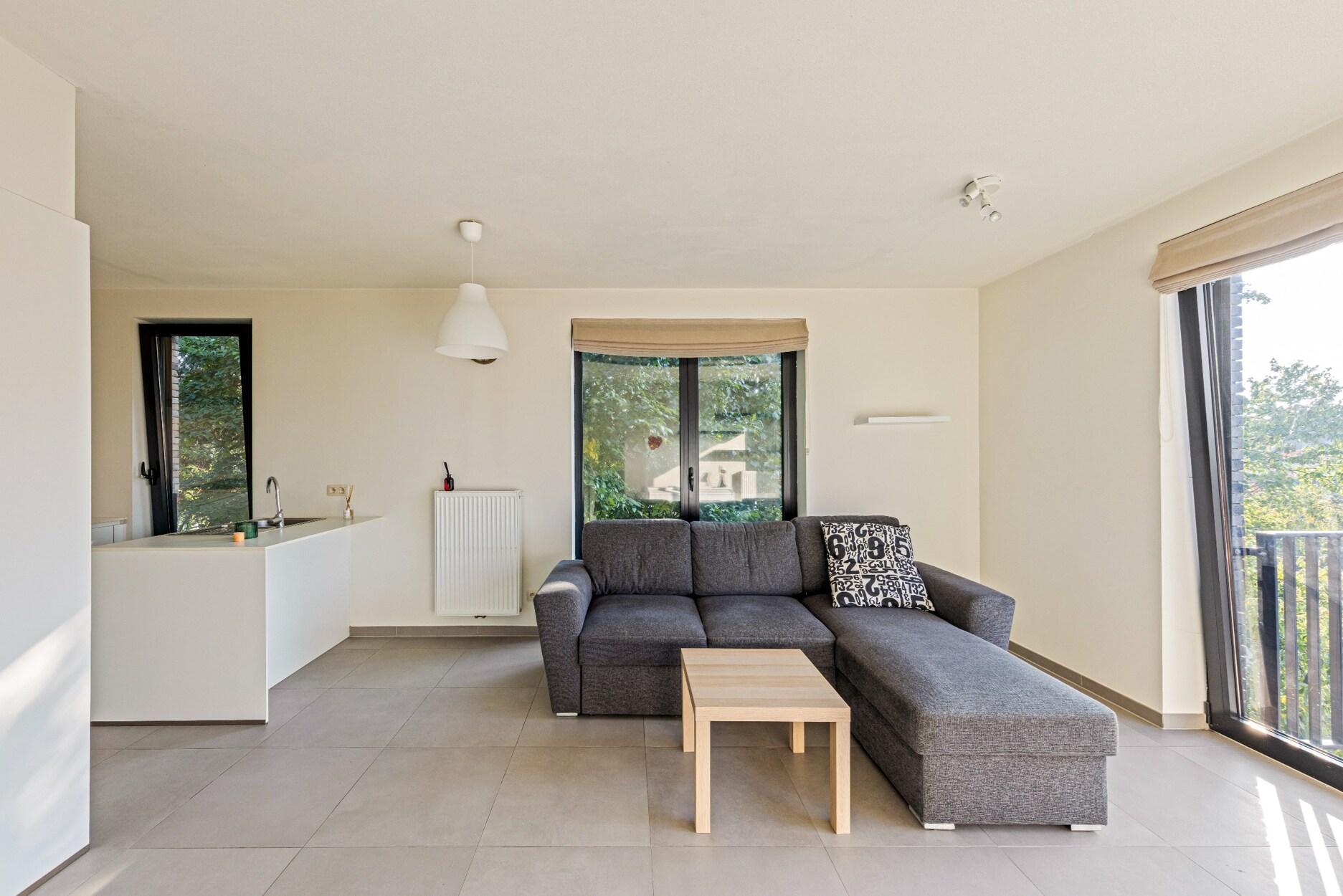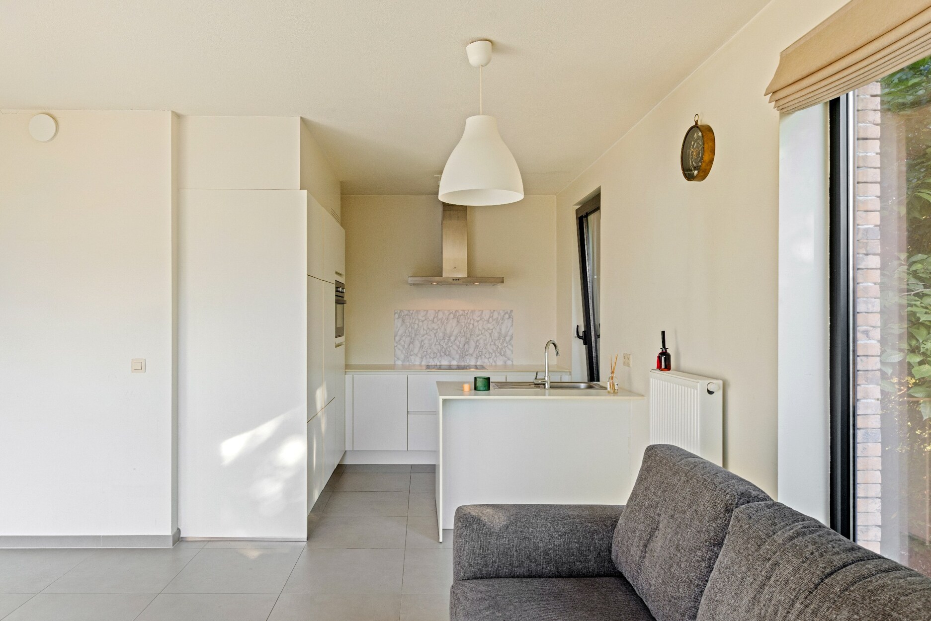 Het appartement omvat een inkomhal met apart toilet, een woonkamer met open keuken ingericht met koelkast, dampkap, oven, vaatwasser, inductiekookplaat, alsook aansluiting voor wasmachine. De woonkamer geniet van veel lichtinval dmv de grote raampartijen en heeft toegang tot het ruime terras (7m²) aan de voorzijde.