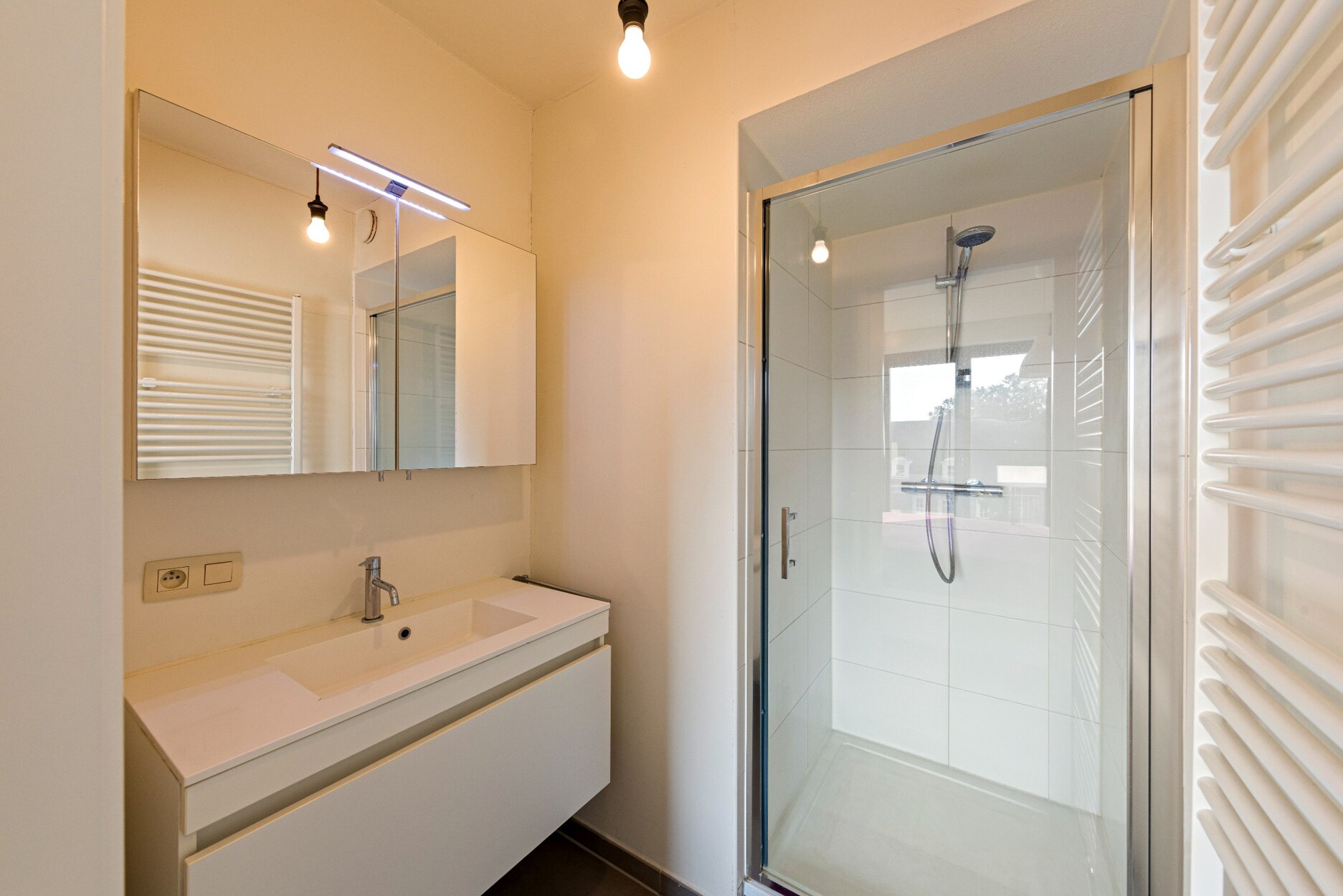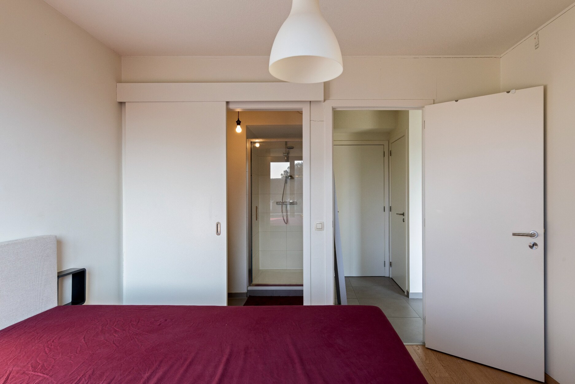 De slaapkamer (ca. 11m²) heeft een aanpalende badkamer met lavabo en douche.