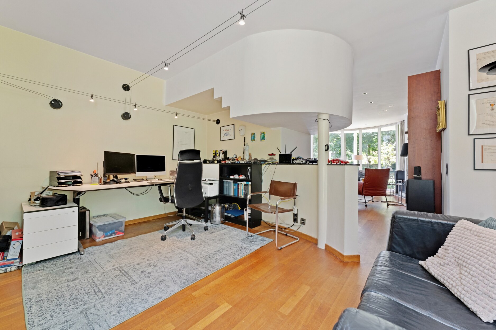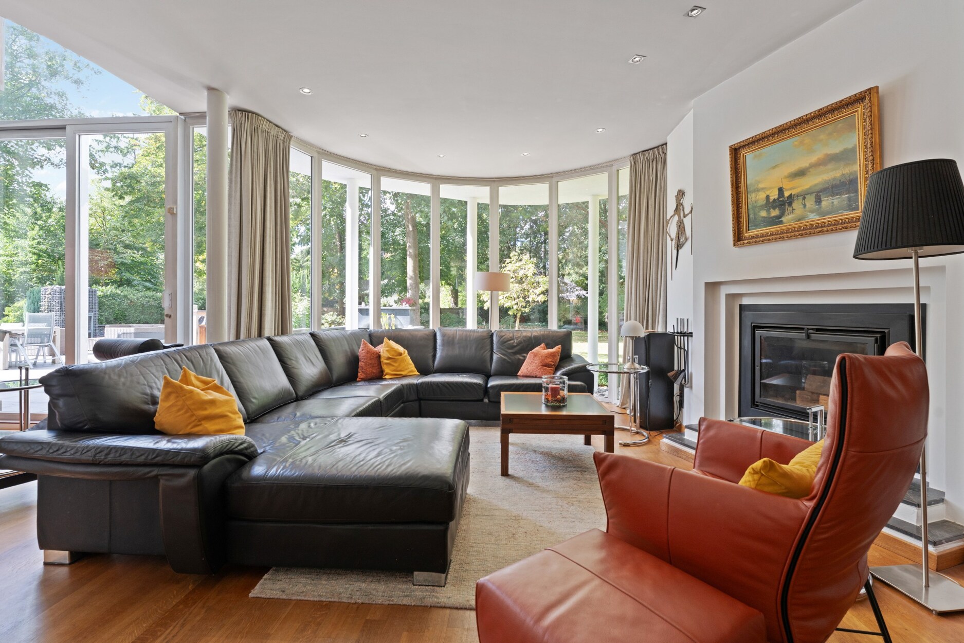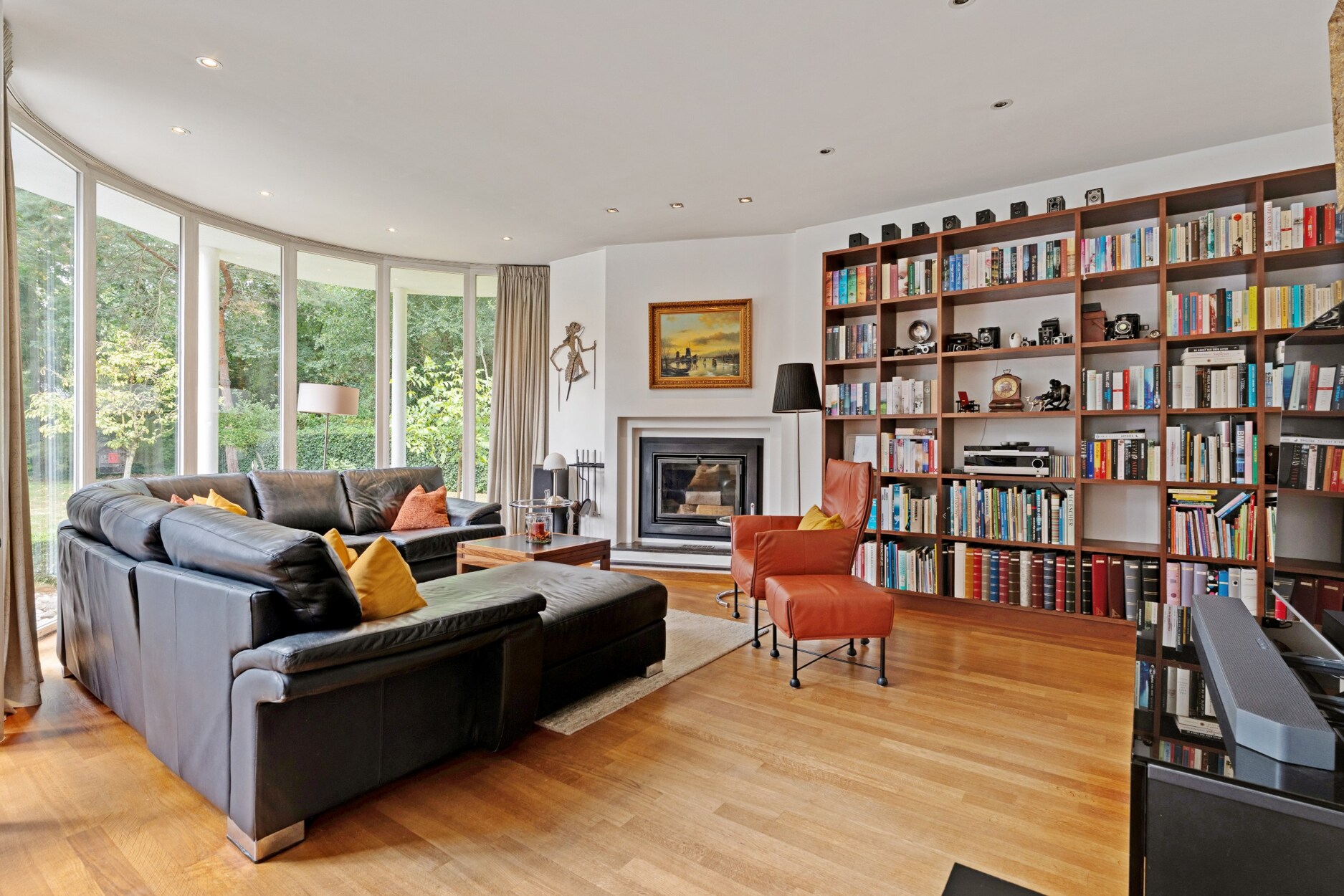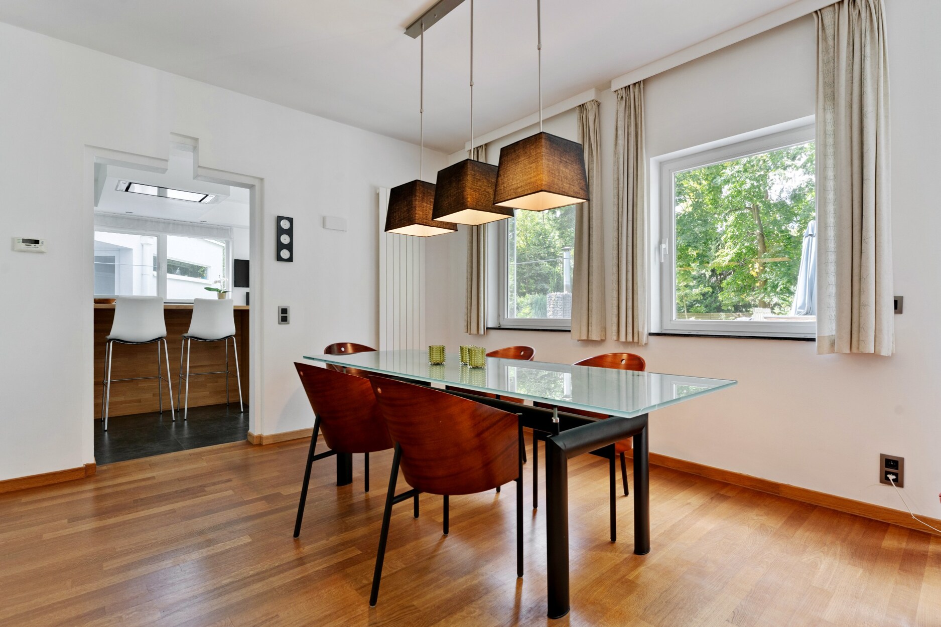 Bij binnenkomst via de ruime inkomhal met vide is er toegang tot een aparte vestiaireruimte met gastentoilet en handenwasser. De leefruimte geniet van overvloedig natuurlijk licht en is ingedeeld in een salon met open haard, een bureelruimte/tv-hoek/speelhoek en een eetkamer.