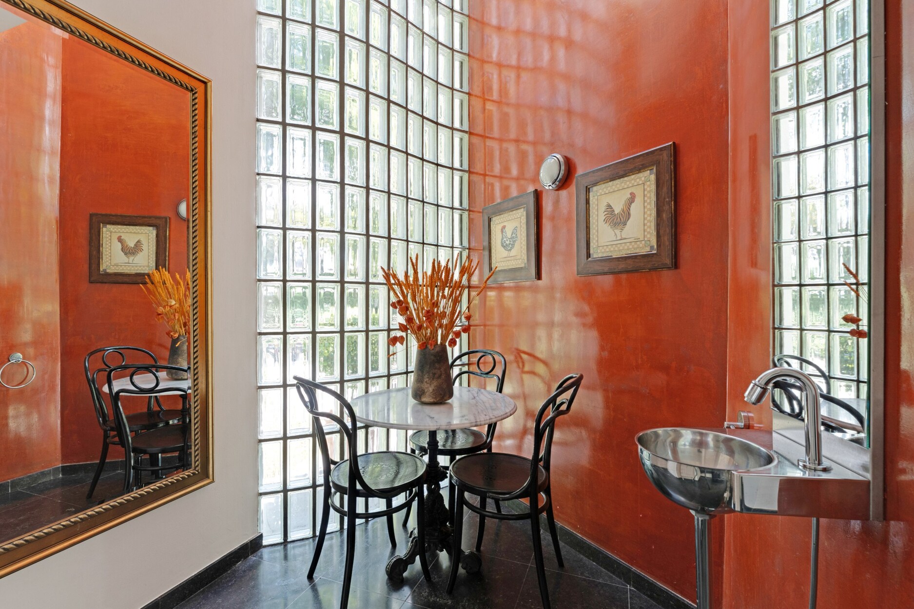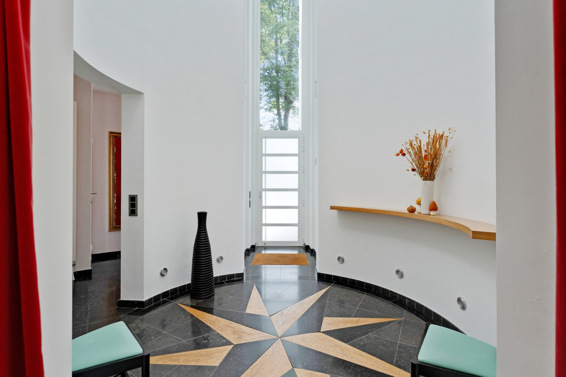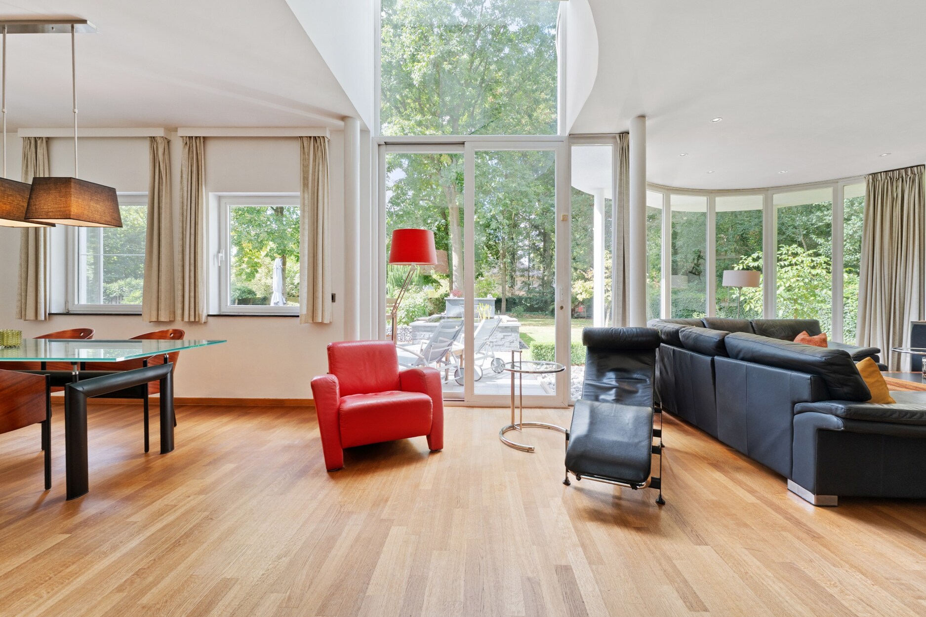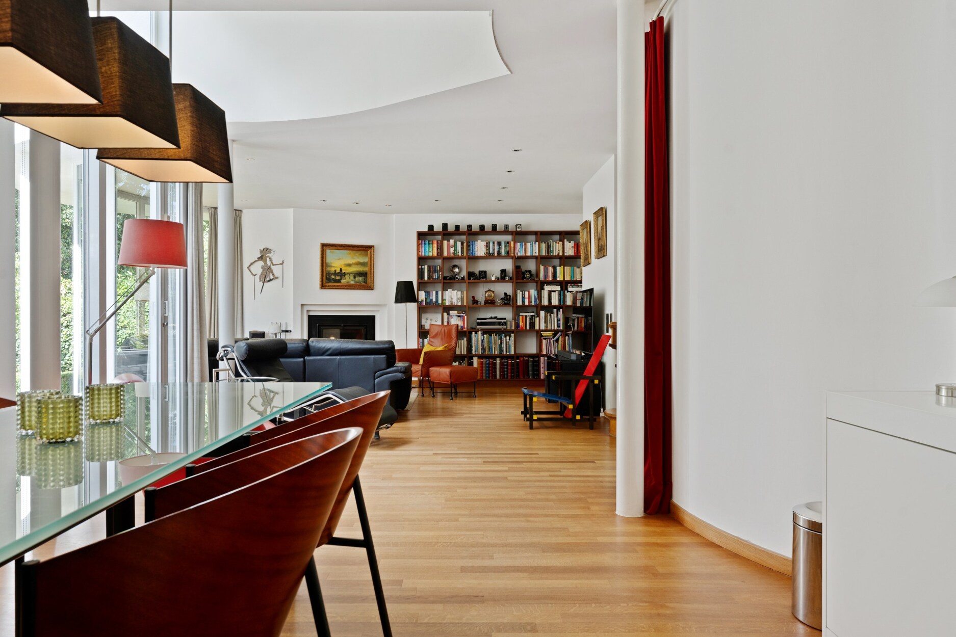 Bij binnenkomst via de ruime inkomhal met vide is er toegang tot een aparte vestiaireruimte met gastentoilet en handenwasser. De leefruimte geniet van overvloedig natuurlijk licht en is ingedeeld in een salon met open haard, een bureelruimte/tv-hoek/speelhoek en een eetkamer.