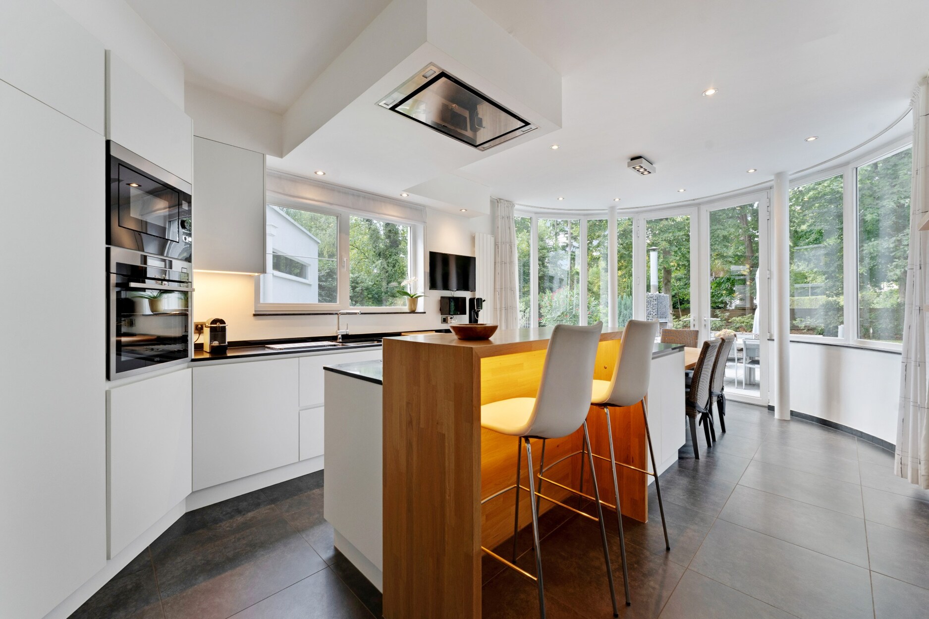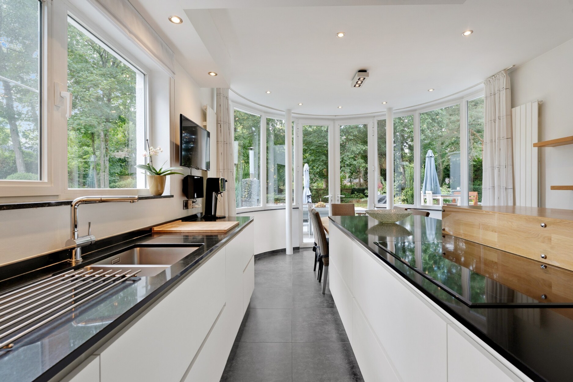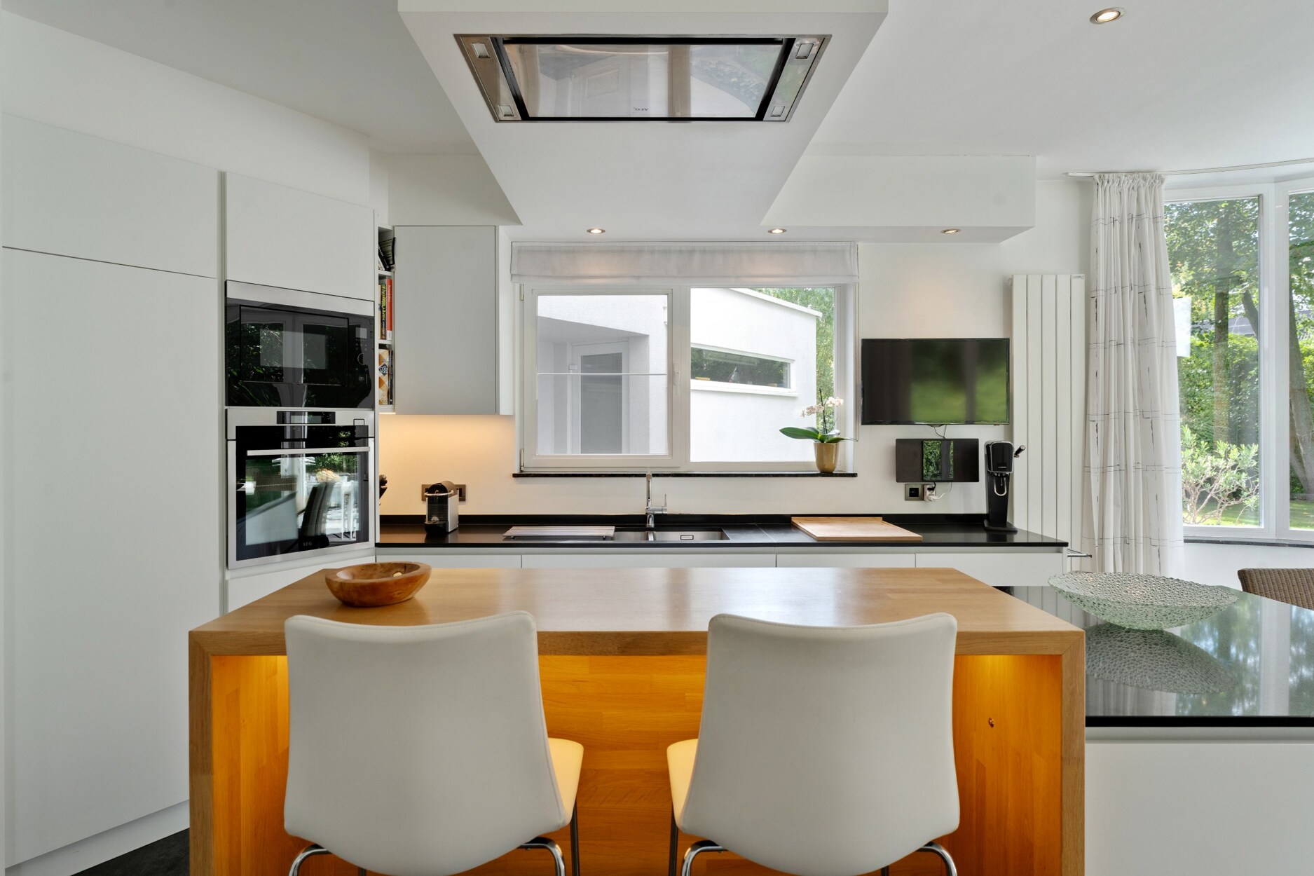 De recente maatkeuken, ontworpen door Keukens De Schutter (Zandhoven), combineert functionaliteit en kwaliteit. Ze beschikt over een centraal kook- en werkeiland in composiet met inductievuur en dampkap (gasaansluiting is nog aanwezig), composiet werkblad met dubbele spoelbak, vaatwasser, combi-stoomoven, microgolf en koelkast. Een massief eiken ontbijttafel en geïntegreerde powerport maken het geheel compleet. Aansluitend bevindt zich een bijkeuken/wasplaats/technische ruimte.