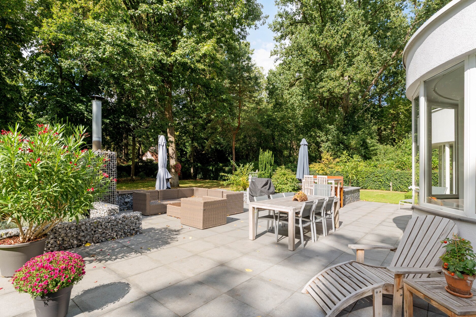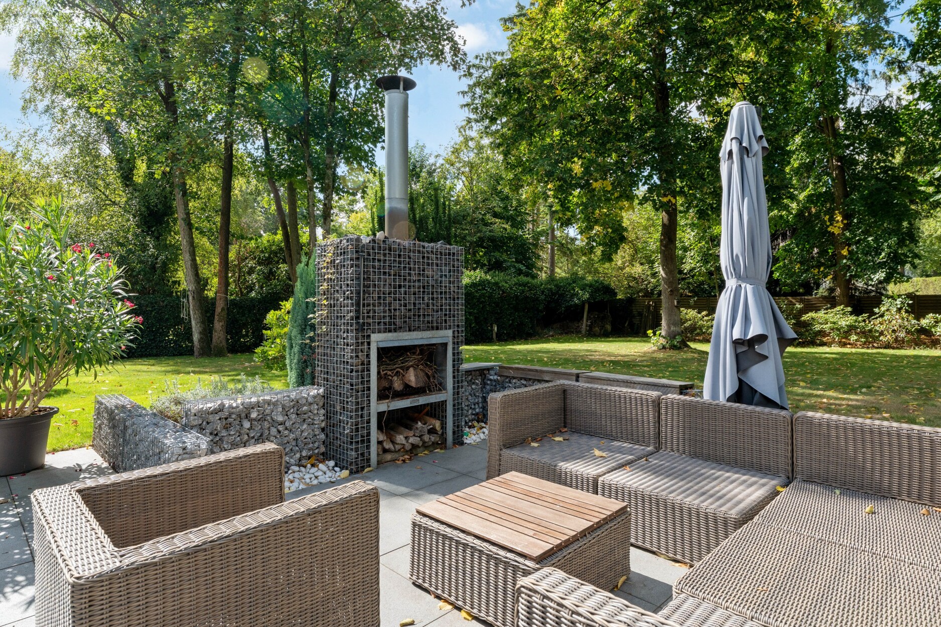 De fraai aangelegde tuin is volledig omheind en westgericht. Grote granieten terrassen, een vijver (ca. 1,5 m diep), een buitenhaard en een tuinberging maken het geheel compleet.