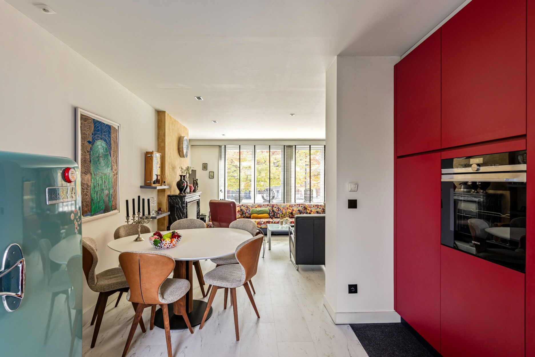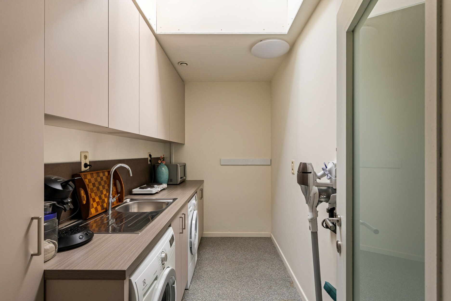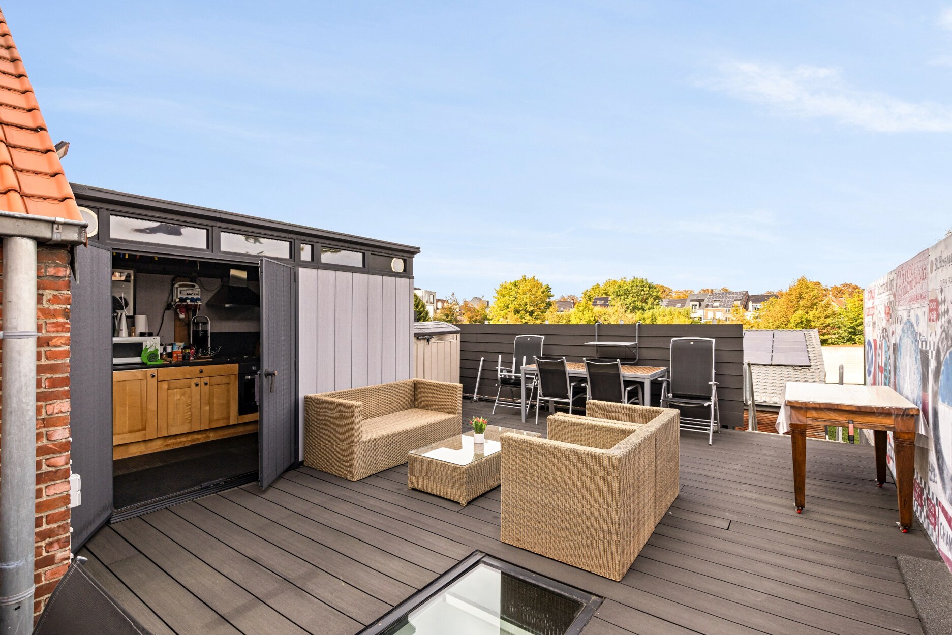 Op de 1ste verdieping treffen we de wasplaats, ingerichte badkamer (ligbad, douche, dubbele wastafel en WC) en een prachtige leefruimte met open, moderne keuken voorzien van alle comfort (combi stoomoven/hetelucht, vaatwasser, keramische kookplaat en quooker). Aansluitend gezellig dakterras voorzien van buitenkeuken (kookplaat + heteluchtoven).