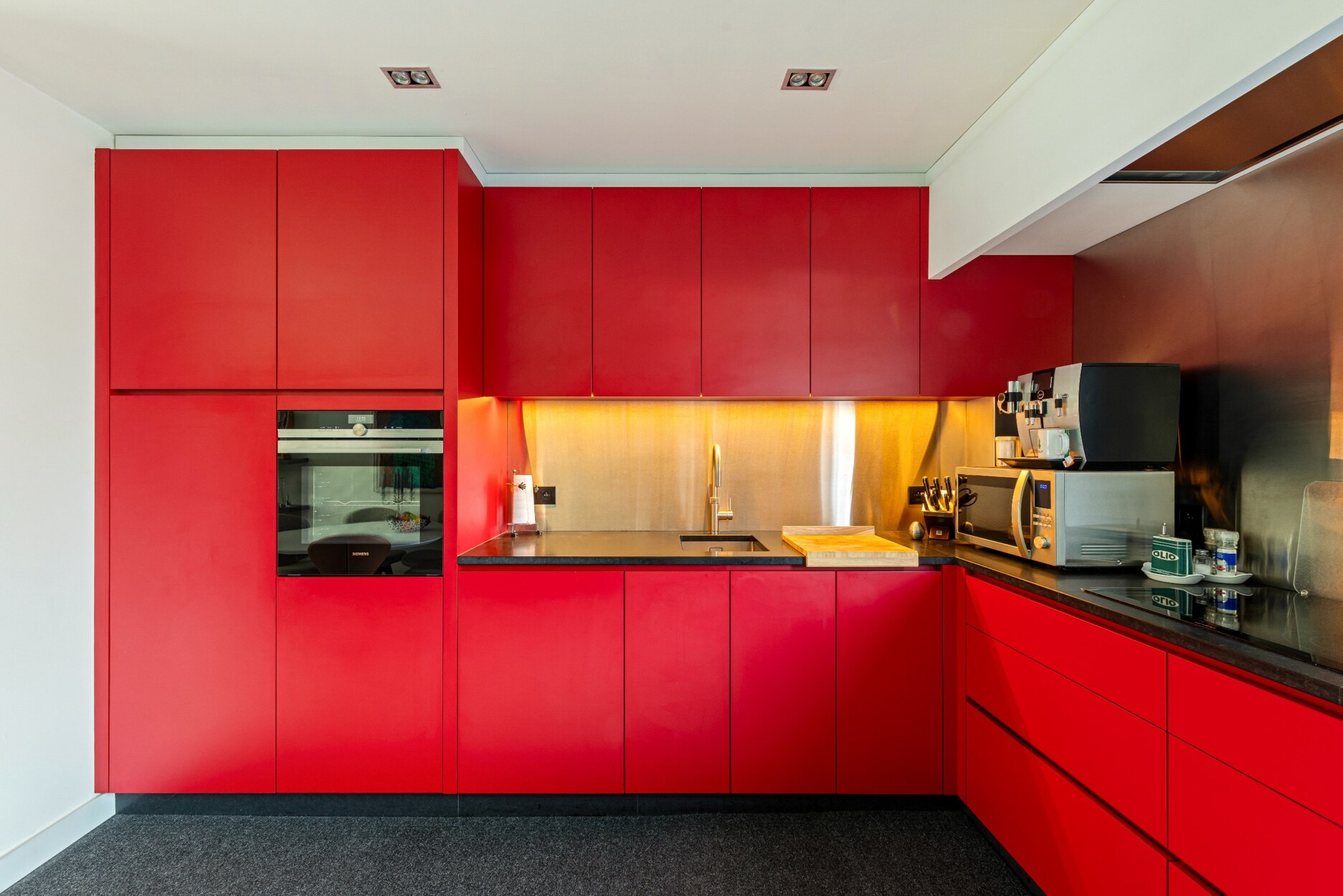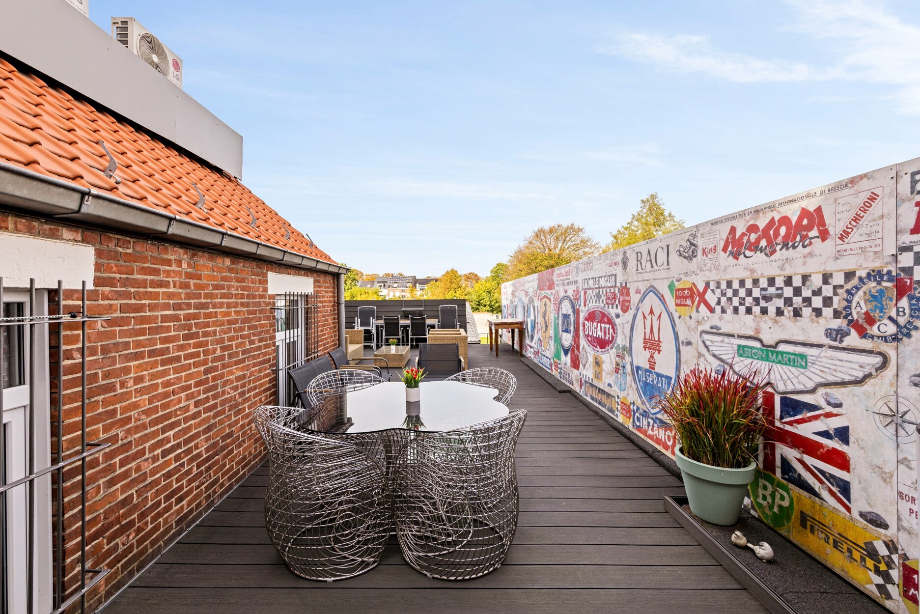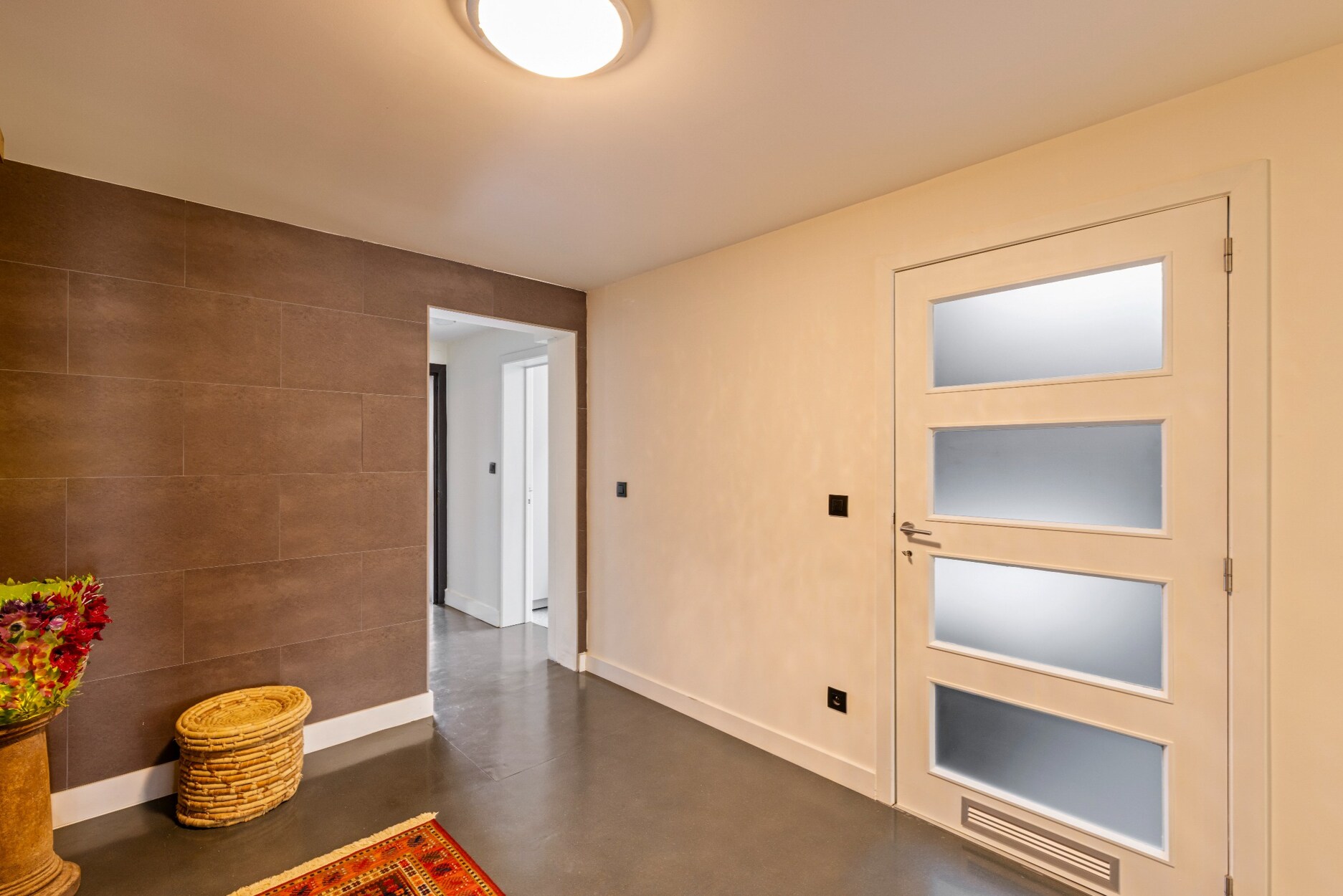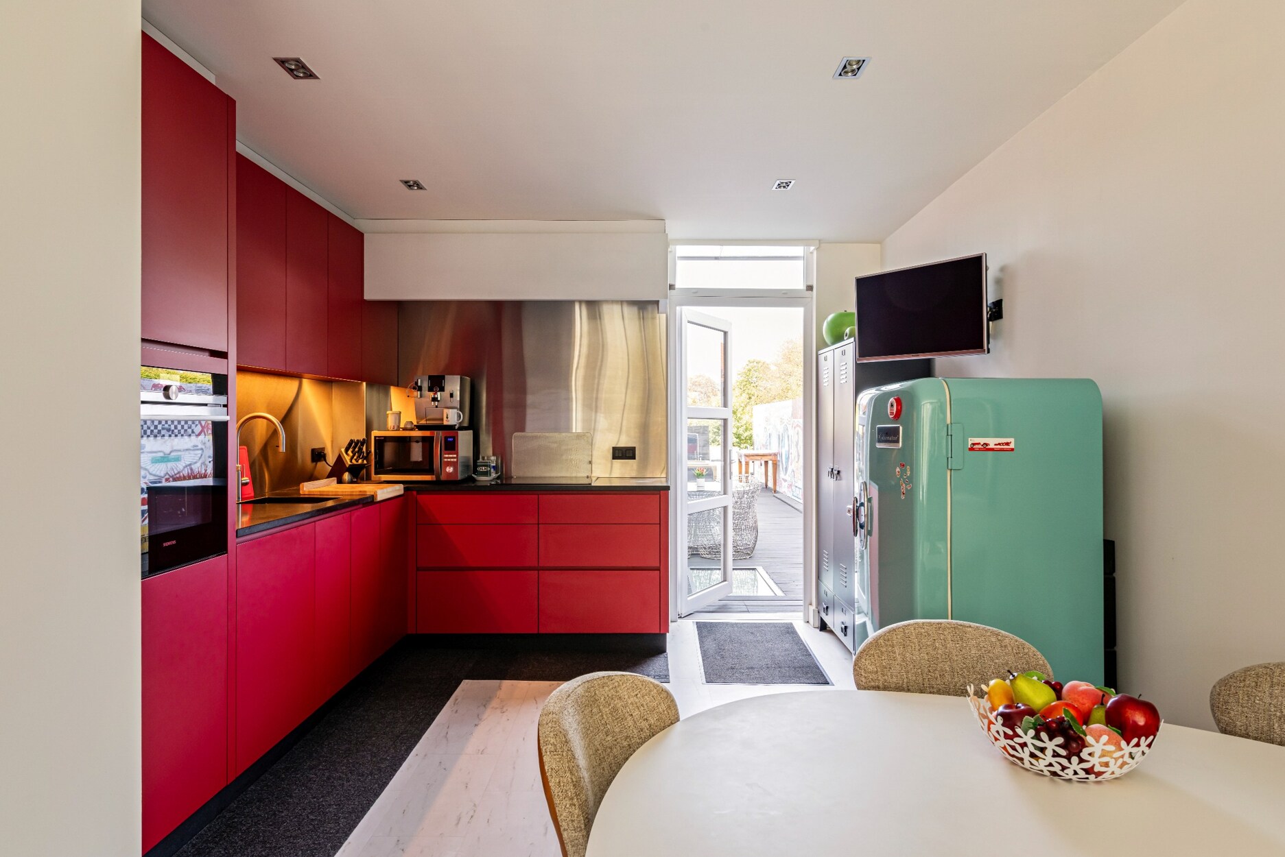Op de 1ste verdieping treffen we de wasplaats, ingerichte badkamer (ligbad, douche, dubbele wastafel en WC) en een prachtige leefruimte met open, moderne keuken voorzien van alle comfort (combi stoomoven/hetelucht, vaatwasser, keramische kookplaat en quooker). Aansluitend gezellig dakterras voorzien van buitenkeuken (kookplaat + heteluchtoven).