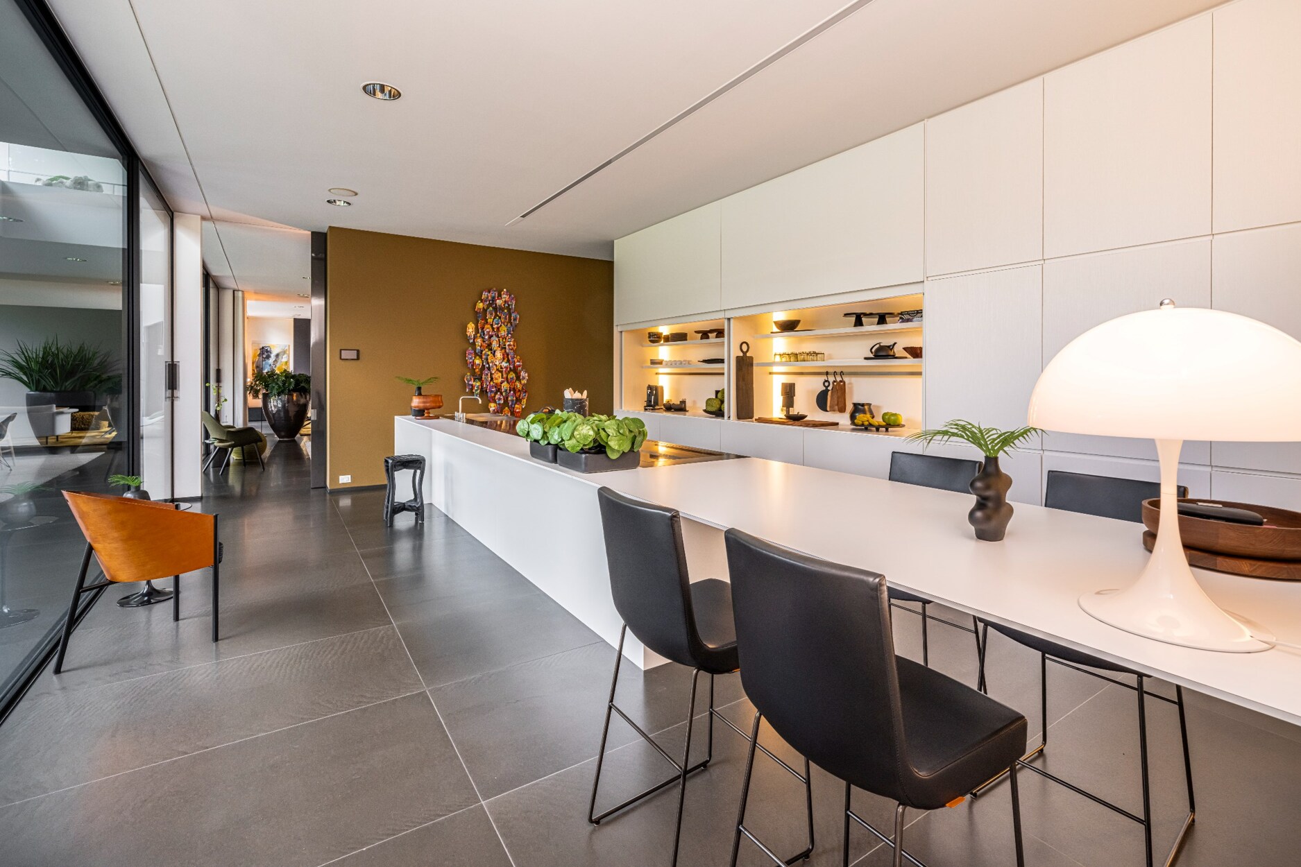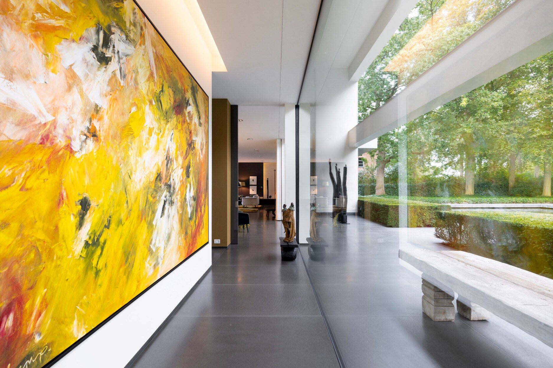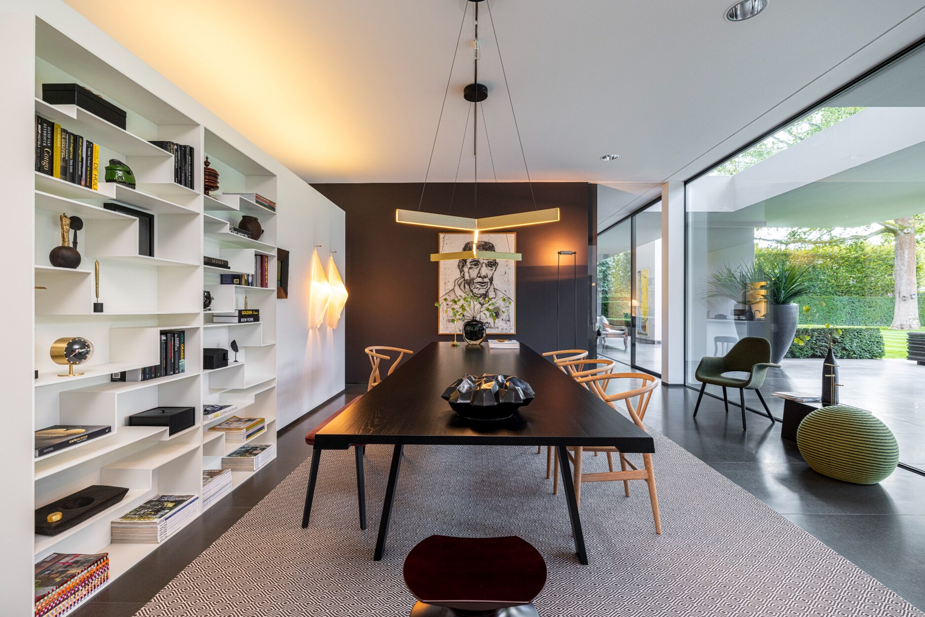 Dit alles versterkt door de hoog opgetrokken raampartijen van vloer tot plafond, alsook door het gebruik van een uniforme materiaalkeuze die consequent van binnen naar buiten wordt doorgetrokken.