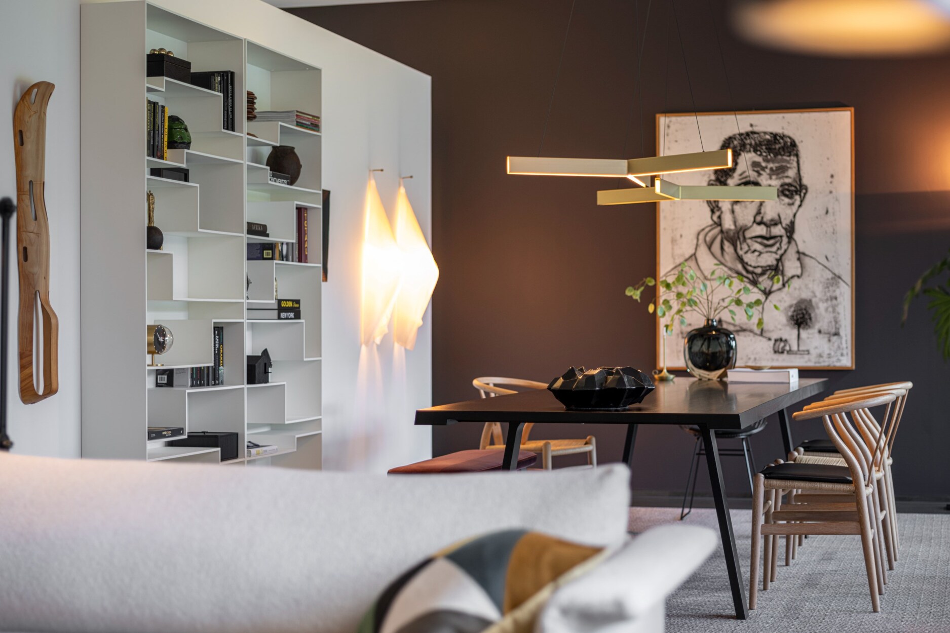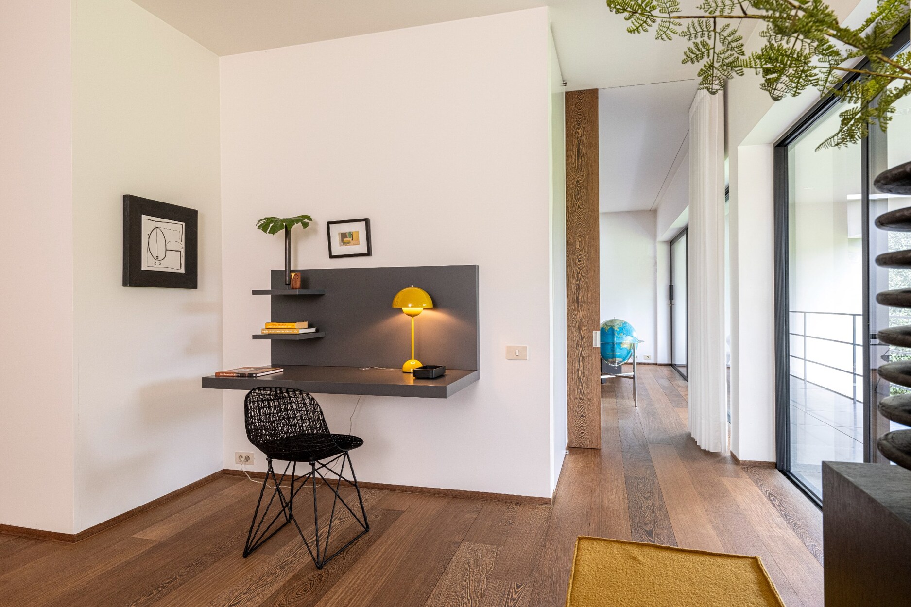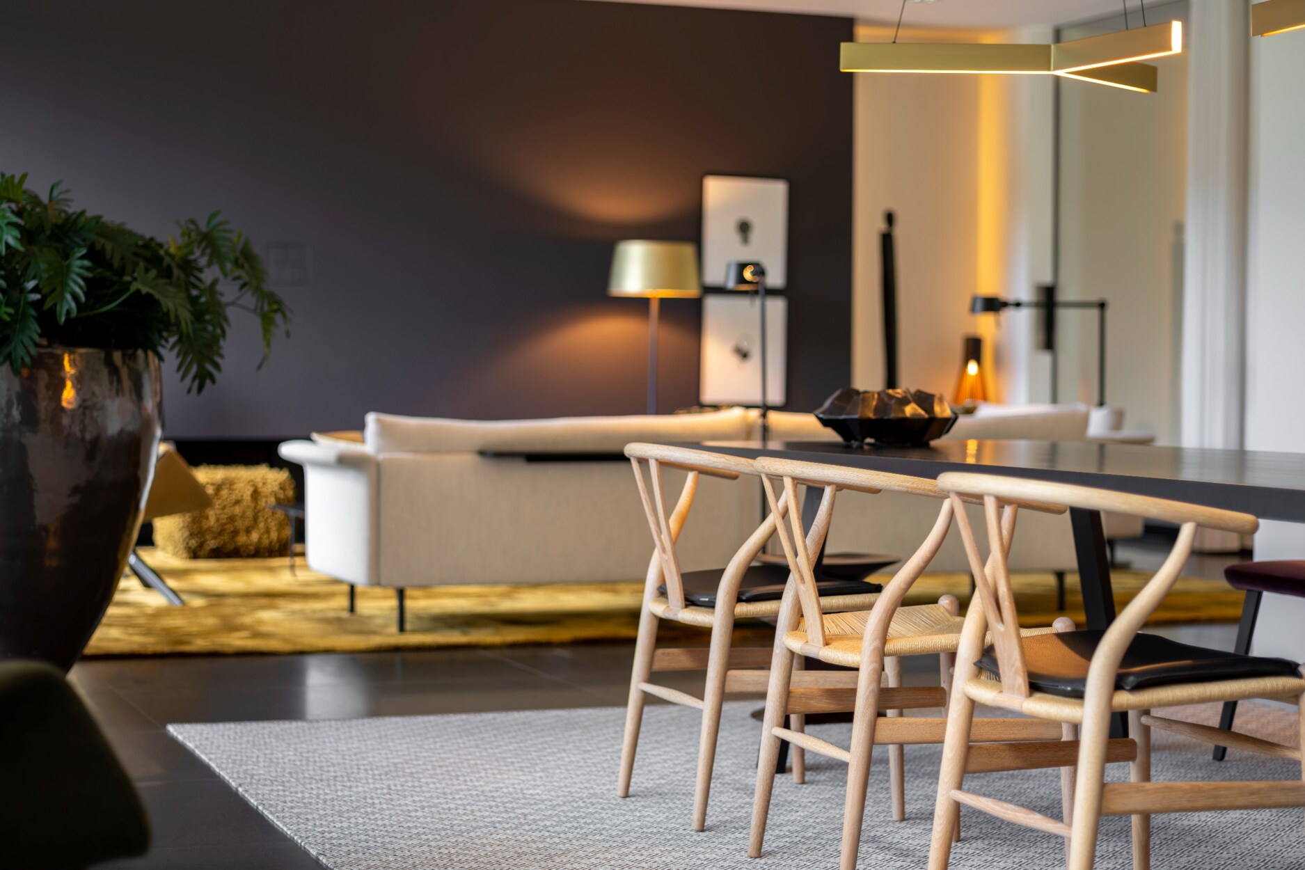 Dit alles versterkt door de hoog opgetrokken raampartijen van vloer tot plafond, alsook door het gebruik van een uniforme materiaalkeuze die consequent van binnen naar buiten wordt doorgetrokken.